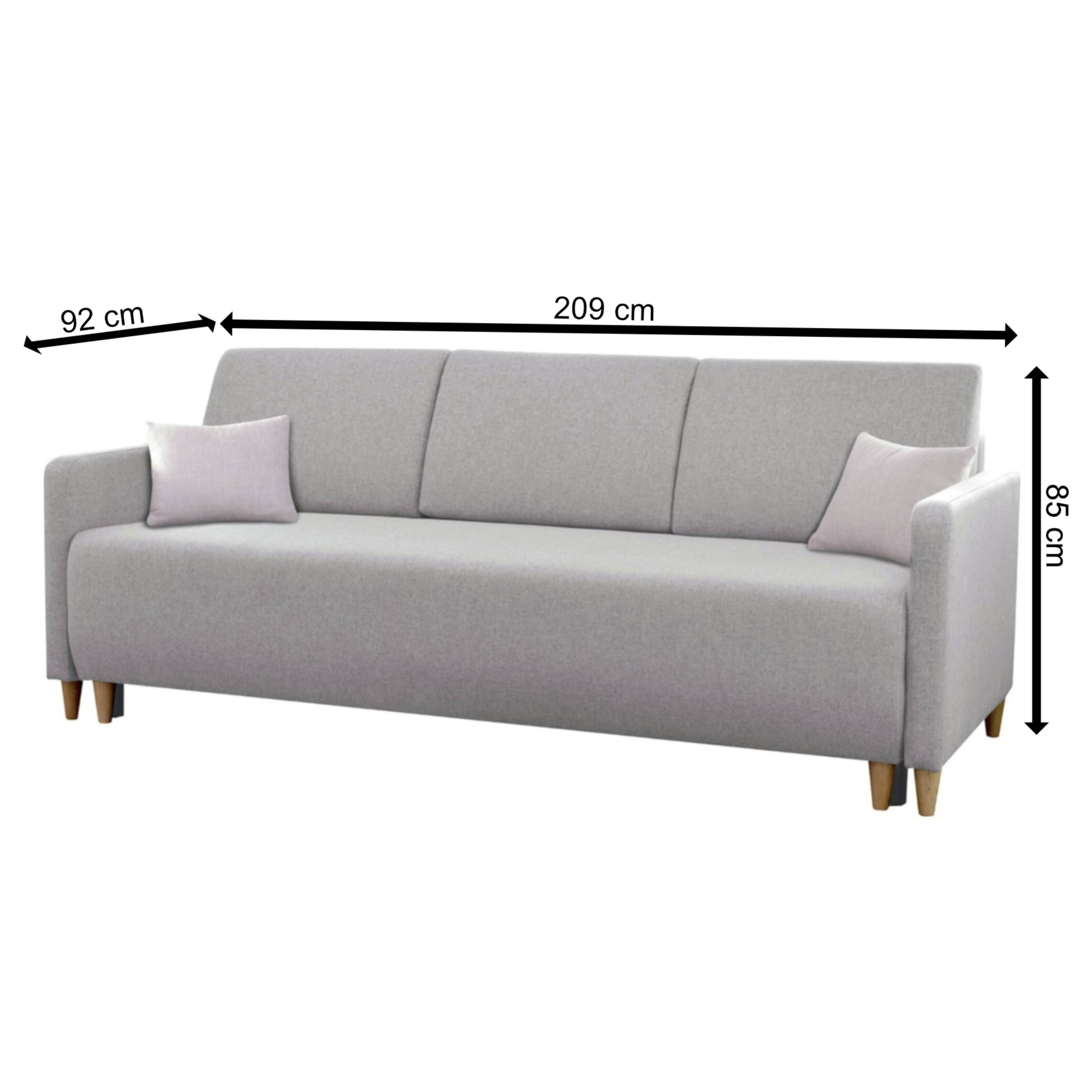 Reprezentatívny vzhľad ju predurčuje na využitie v mnohých interiéroch. Svojou veľkosťou poskytne miesto na sedenie až pre 3 osoby. Chrbtové a dekoračné vankúše poskytnú potrebnú oporu tela pri sedení. Bezpochyby oceníte aj jej variabilitu. Pohovku môžete rozložiť na lôžko v prípade, že u vás potrebuje prespať návšteva. Integrovaný úložný priestor poskytuje miesto na lôžkoviny, ktoré budete mať vždy po ruke. Drevené nôžky zdôrazňujú elegantný vzhľad gauča a zaistia jeho stabilitu. Celočalúnené vyhotovenie vám poskytne luxus, zvoliť si sami kam pohovku postavíte, či ku stene alebo do otvoreného priestoru.