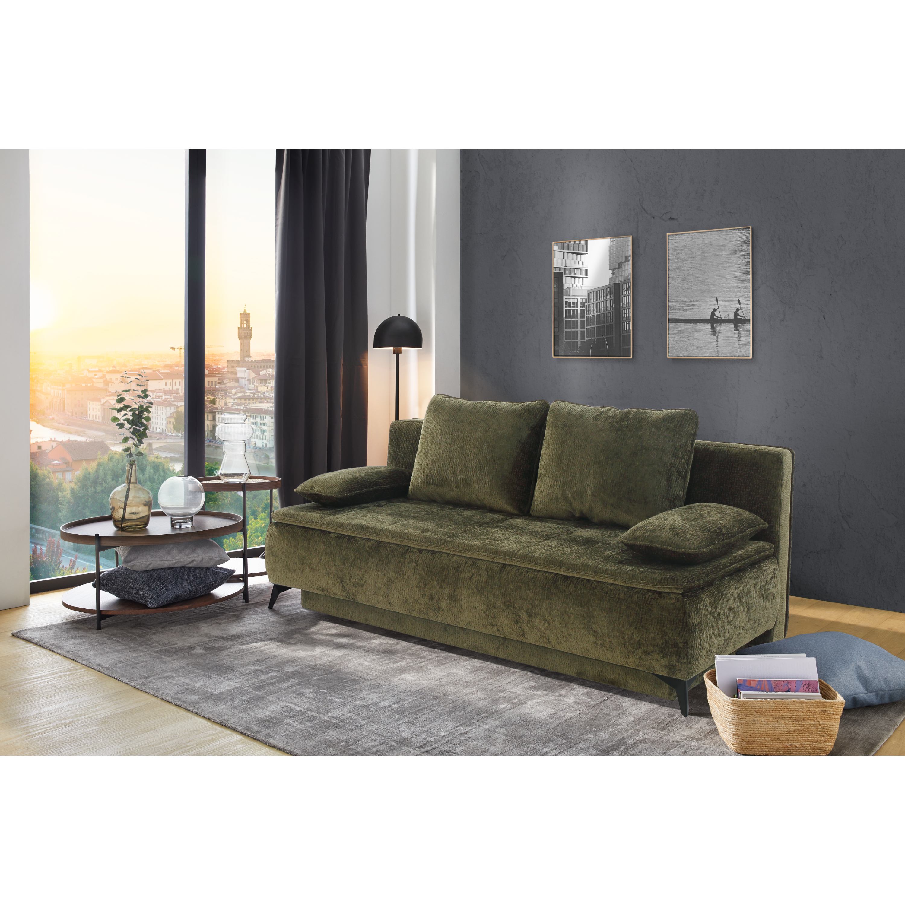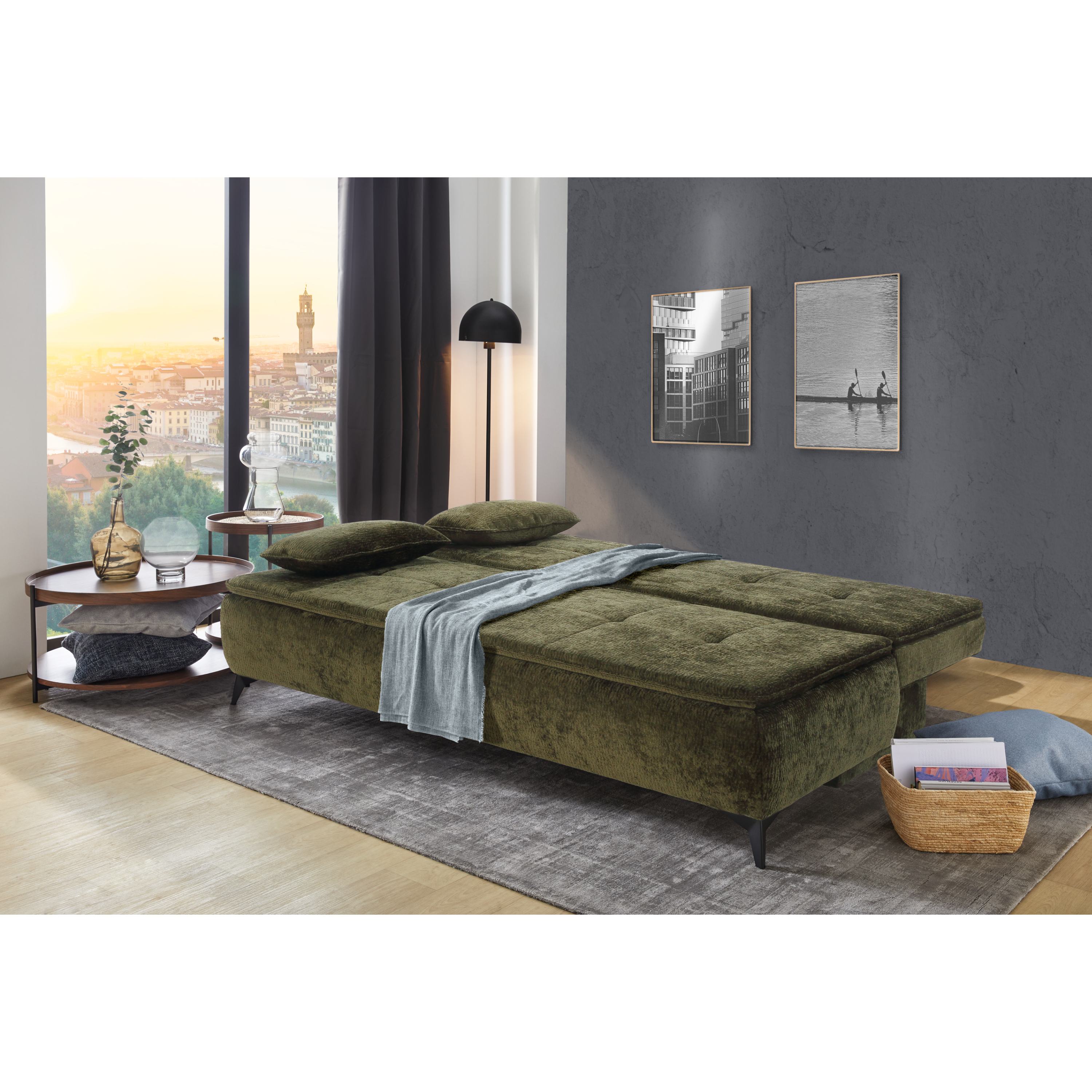 Sedák je vyrobený z vysoko kvalitných vlnových pružín v kombinácii s polyuretánovou penou, ktoré zaručujú výnimočné pohodlie pri sedení. Pohovku je možné v prípade potreby premeniť na miesto na príležitostné spanie. V úložnom priestore uschováte lôžkoviny, ktoré tak budete mať v prípade potreby opäť poruke, aj odnímateľné vankúše, ktoré navyše môžete využiť aj na spanie. Vďaka čalúnenému chrbtu bude pohovka vyzerať skvele aj uprostred miestnosti.