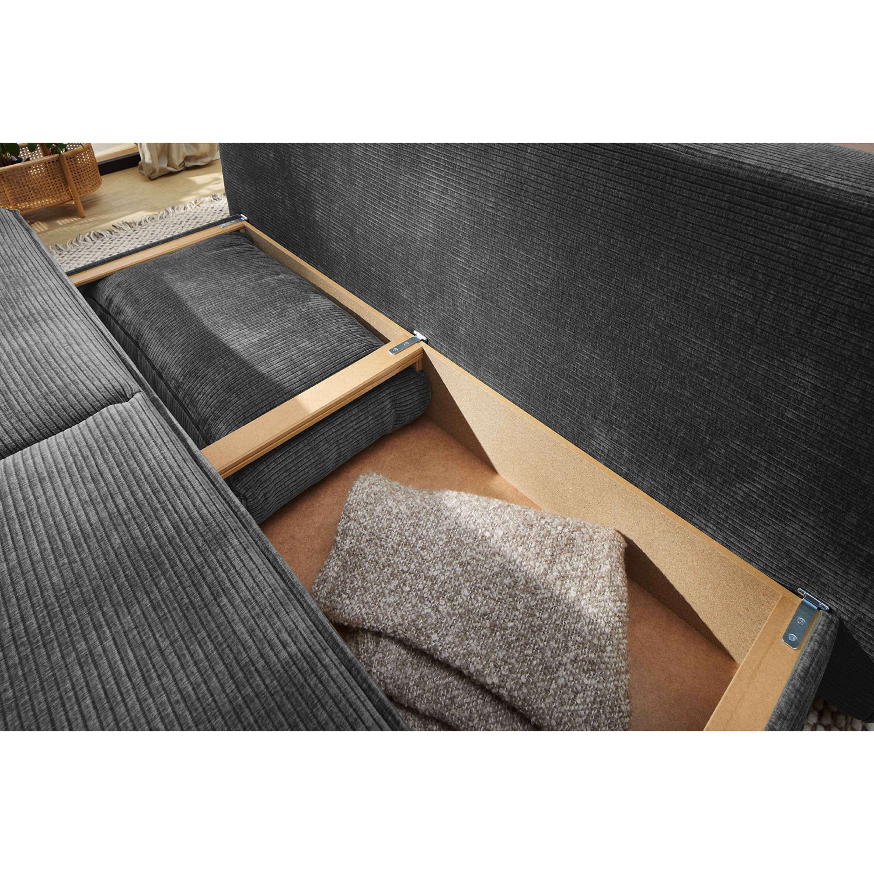 Sedák je vyrobený z vysoko kvalitných vlnových a taštičkových pružín v kombinácii s polyuretánovou penou, ktoré zaručujú výnimočné pohodlie pri sedení. Pohovku je možné v prípade potreby premeniť na miesto na každodenné spanie. V úložnom priestore uschováte lôžkoviny, ktoré tak budete mať v prípade potreby opäť poruke. Kovové nožičky dodávajú pohovke ľahkosť a elegantný charakter. Vďaka čalúnenému chrbtu bude pohovka vyzerať skvele aj uprostred miestnosti.