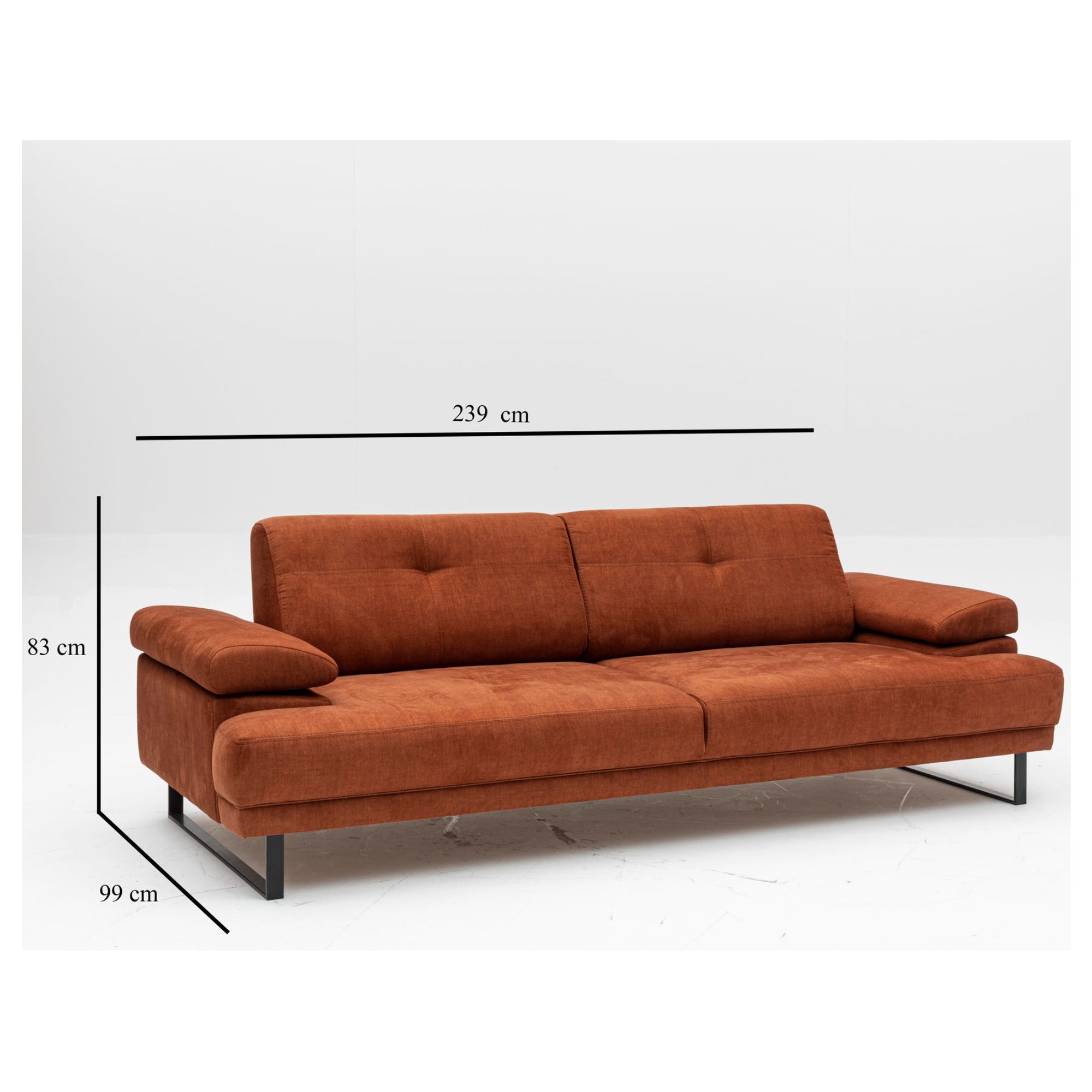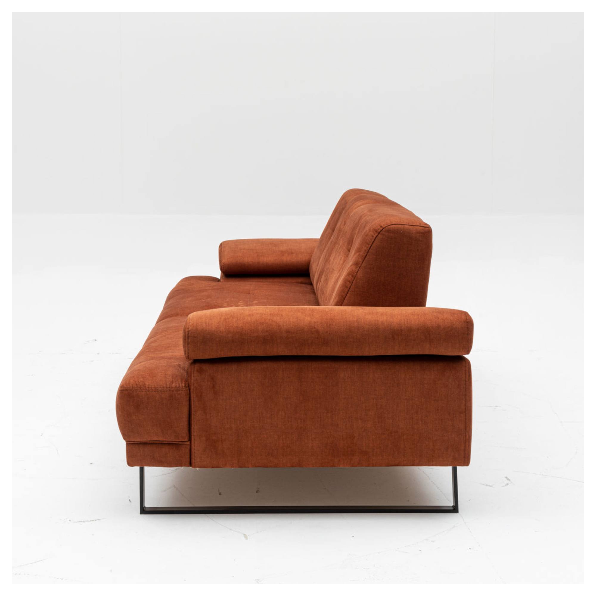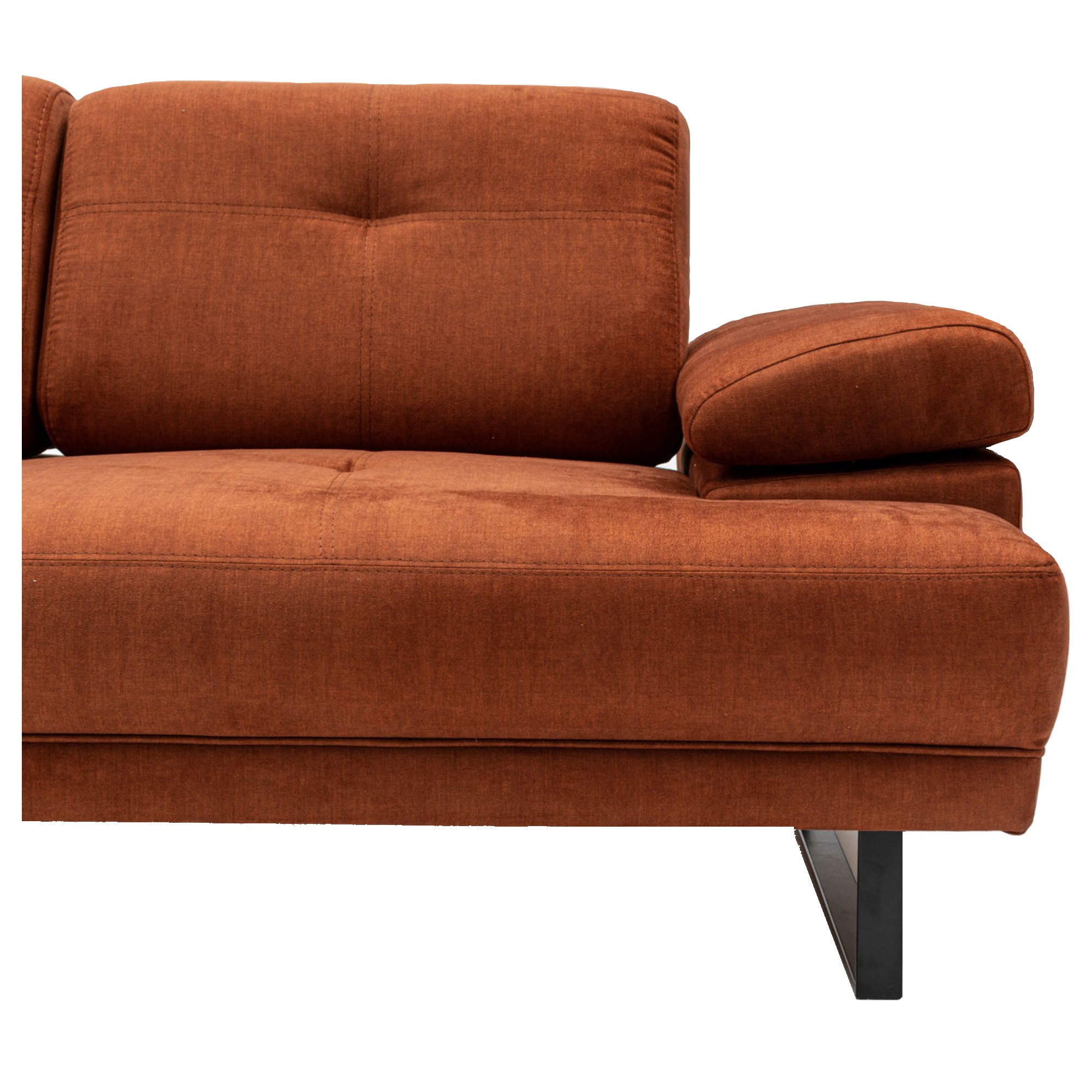 Pevná konštrukcia je potiahnutá príjemnou tkaninou zo 100 % polyesteru. Pohovka je v celočalúnenom vyhotovení, takže ju môžete umiestniť aj voľne do priestoru, pokiaľ vám to dispozícia obývacej izby dovolí. Vybavená je zabudovanými sedacími a chrbtovými vankúšmi s mäkkou penovou výplňou. Hodiť sa budú aj podrúčky na odloženie unavených rúk. Pre ešte väčšie pohodlie sú podrúčky a chrbtové operadlá nastaviteľné. Celkový vzhľad zvýrazňuje podnož z matného kovu v čiernej farbe.
