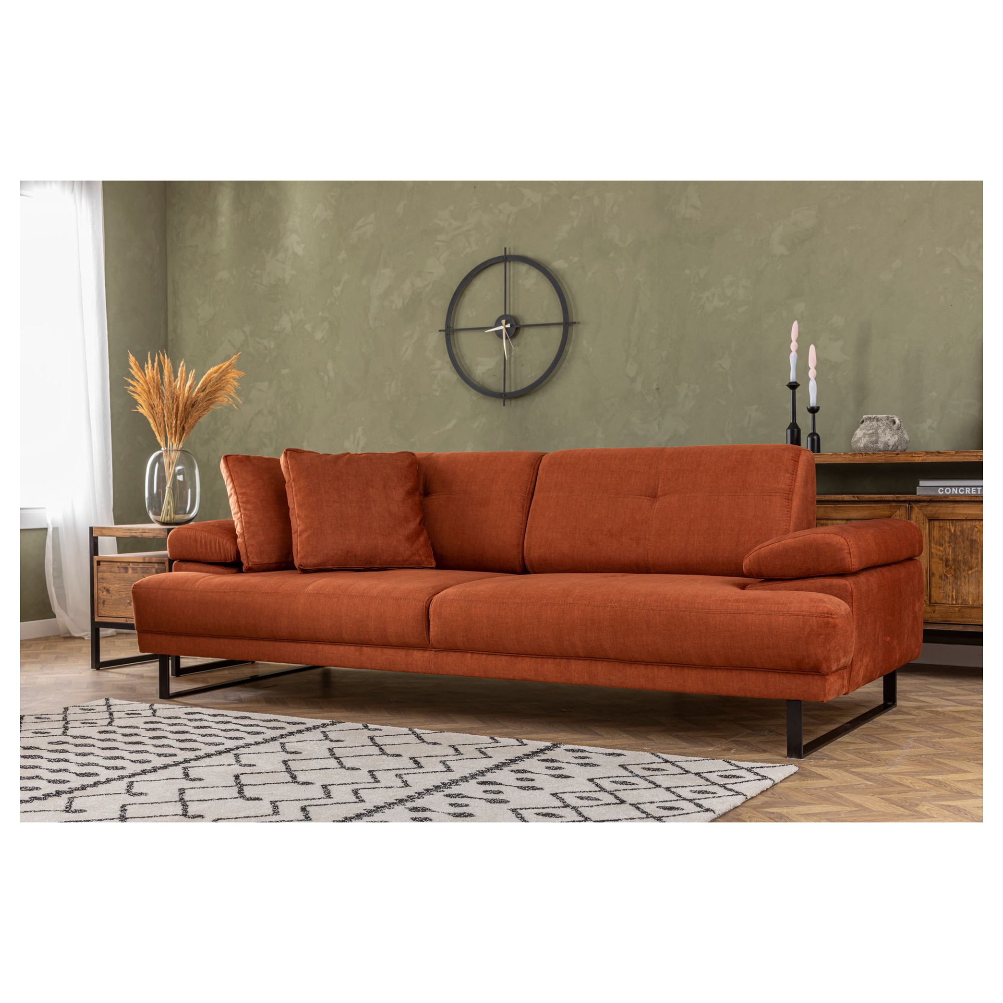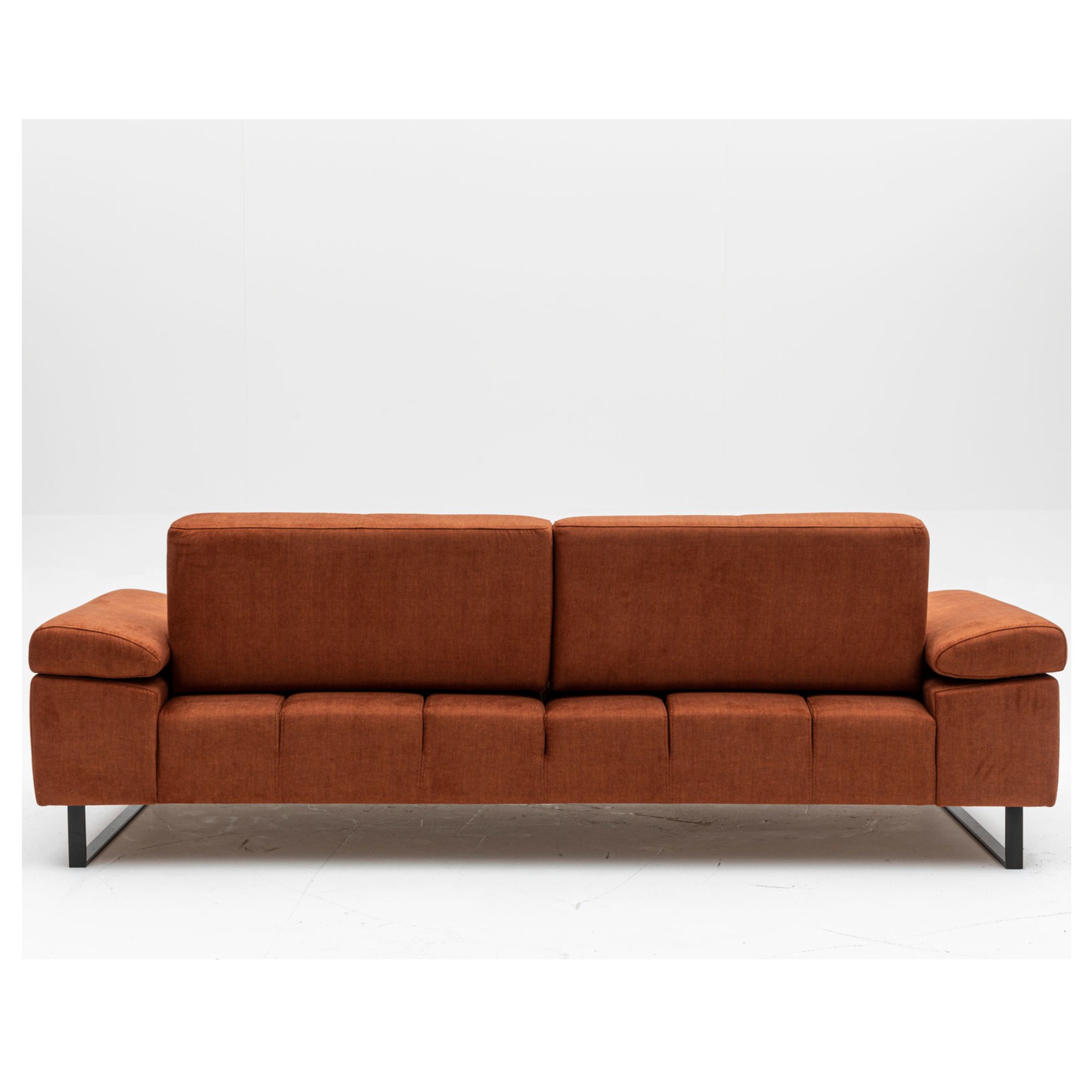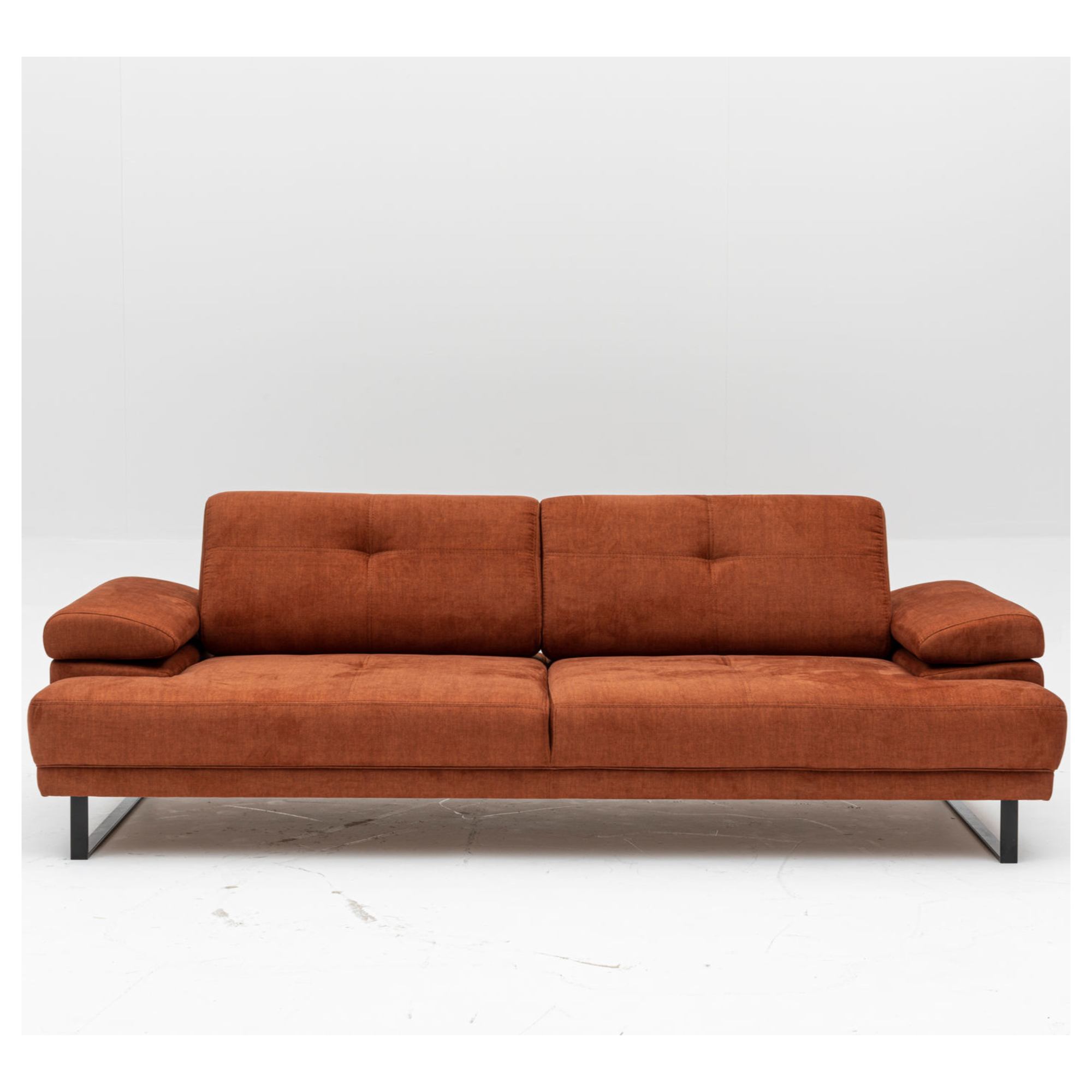 Pevná konštrukcia je potiahnutá príjemnou tkaninou zo 100 % polyesteru. Pohovka je v celočalúnenom vyhotovení, takže ju môžete umiestniť aj voľne do priestoru, pokiaľ vám to dispozícia obývacej izby dovolí. Vybavená je zabudovanými sedacími a chrbtovými vankúšmi s mäkkou penovou výplňou. Hodiť sa budú aj podrúčky na odloženie unavených rúk. Pre ešte väčšie pohodlie sú podrúčky a chrbtové operadlá nastaviteľné. Celkový vzhľad zvýrazňuje podnož z matného kovu v čiernej farbe.