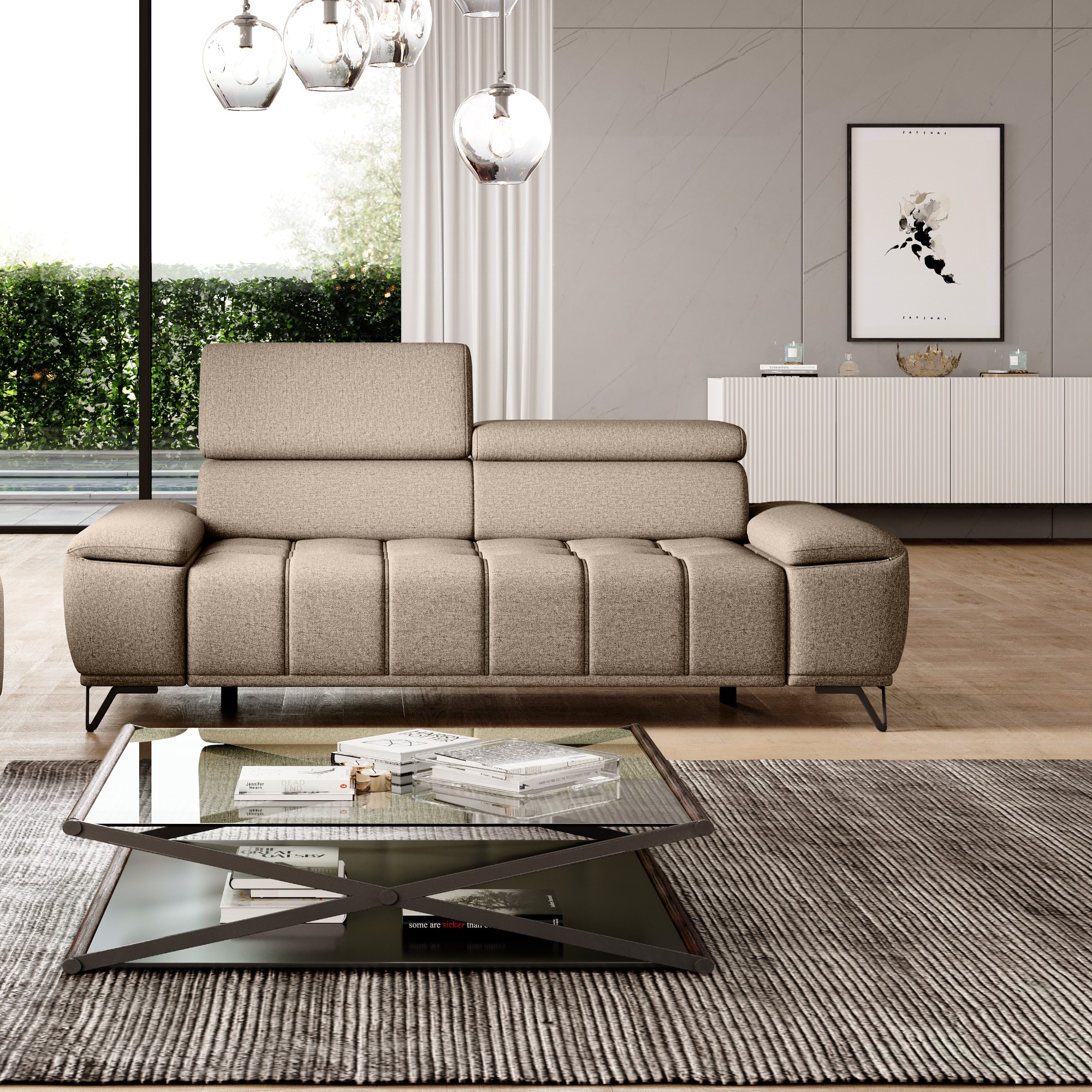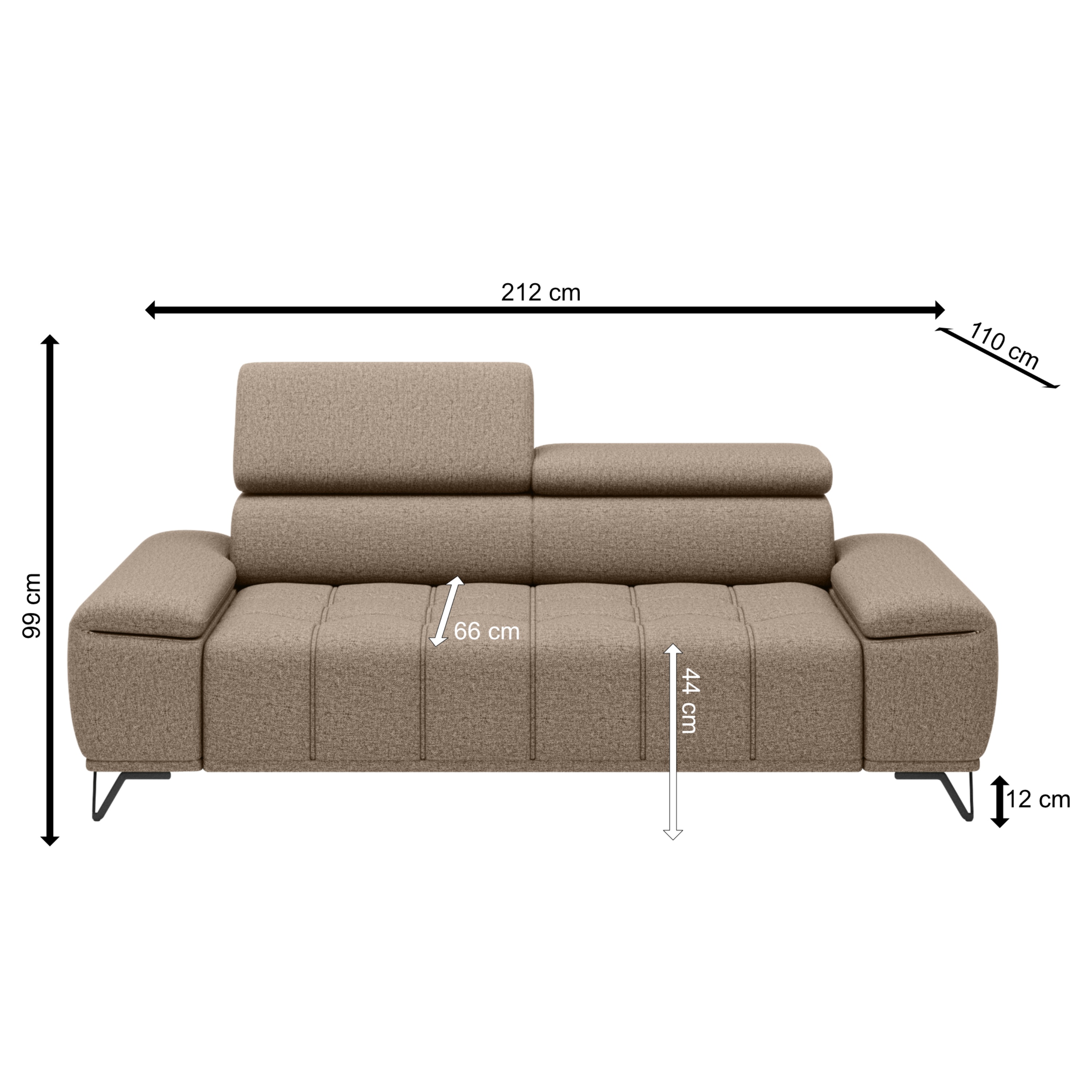Svojou veľkosťou poskytne dostatok priestoru na komfortné sedenie pre 3 osoby. O to pravé pohodlie sa postarajú aj polohovateľné opierky hlavy a elektrický vysúvací systém sedadla. Stačí len obyčajné stlačenie tlačidla a môžete si upraviť hĺbku sedu až o 27 cm. Tieto sofistikované funkcie dovedú váš pocit z relaxácie a odpočinku k dokonalosti. Vysoké kovové nôžky oceníte aj z praktického hľadiska. Priestor pod gaučom zostáva ľahko dostupný, a tak aj podlaha pod ním sa ľahko udržuje v čistote. Celočalúnené vyhotovenie vám dovolí umiestniť sedačku do priestoru aj ku stene.