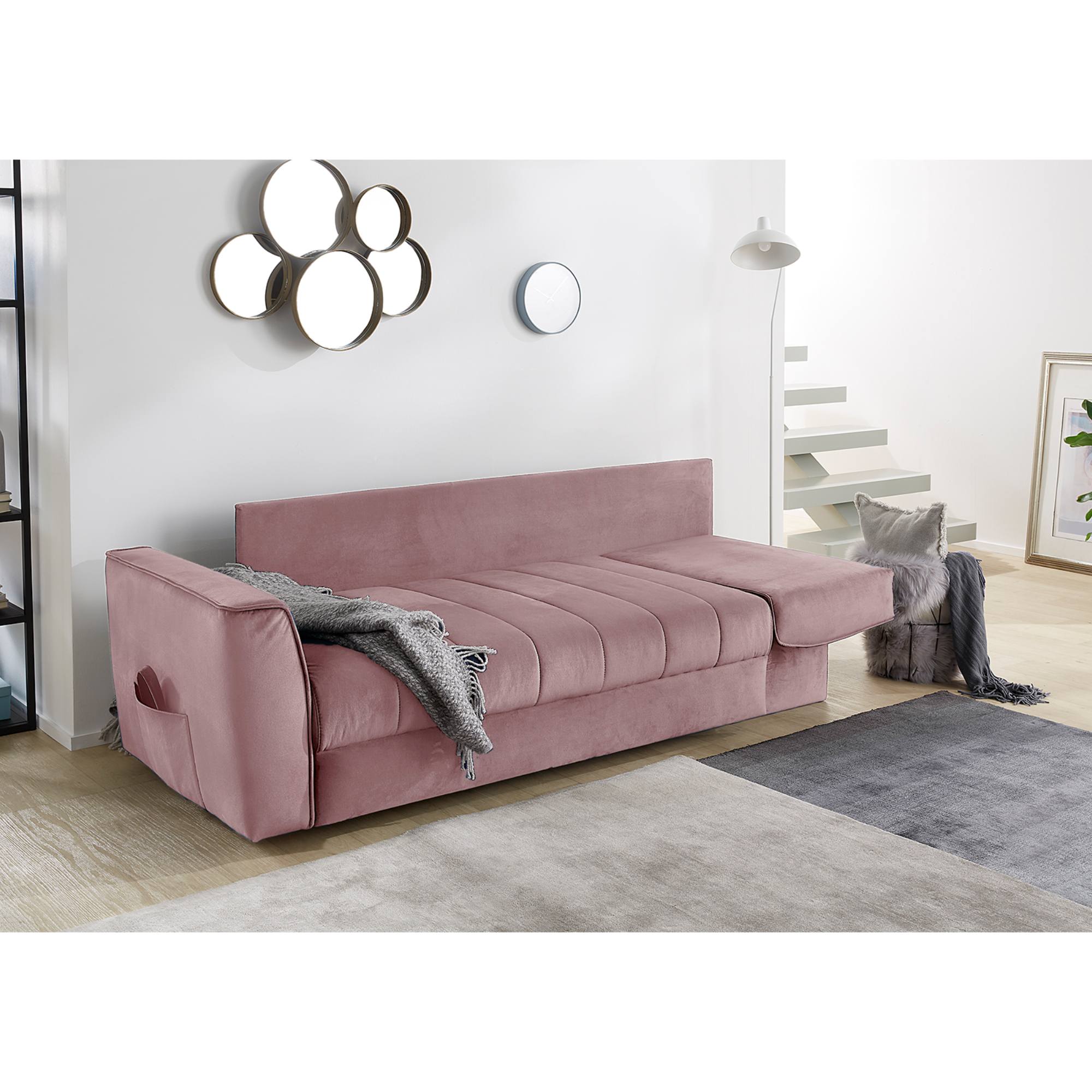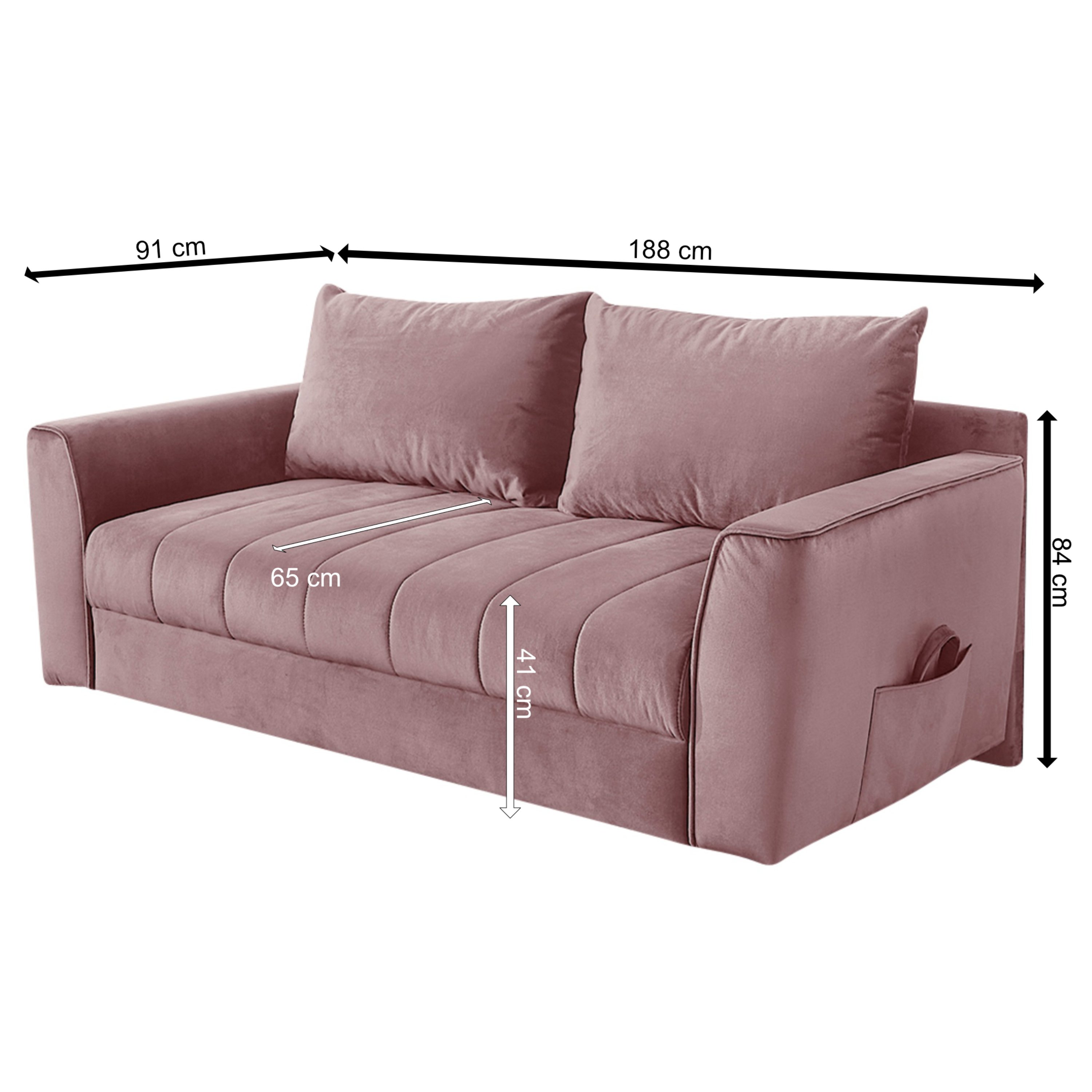 Pohovka s pružinovým jadrom je potiahnutá tkaninou zamatového vzhľadu, vďaka ktorej je veľmi príjemná na dotyk. Disponuje vyššími podrúčkami a chrbtovými vankúšmi, do ktorých sa môžete pohodlne zaboriť a dopriať si potrebný relax. Pohovku ľahko premeníte na dodatočné lôžko pre jednu osobu. Stačí sklopiť podrúčku a môžete si dopriať popoludňajšiu siestu alebo uložiť na prenocovanie návštevu. Integrovaný úložný priestor poskytne dostatočné miesto nielen na lôžkoviny, ktoré budete mať v prípade potreby hneď po ruke.