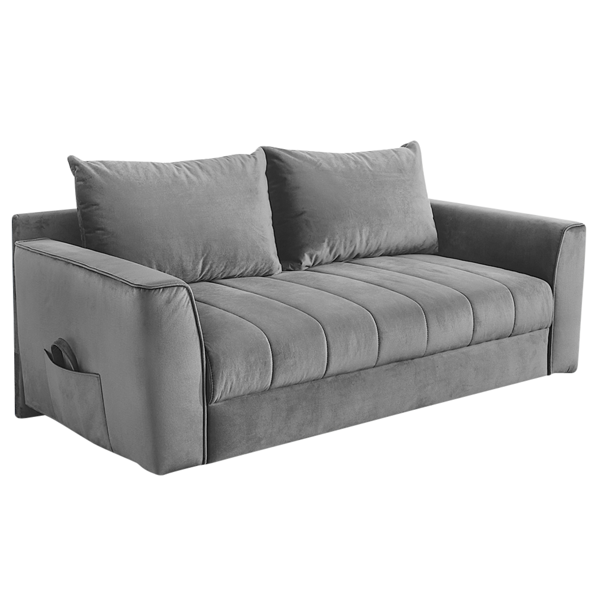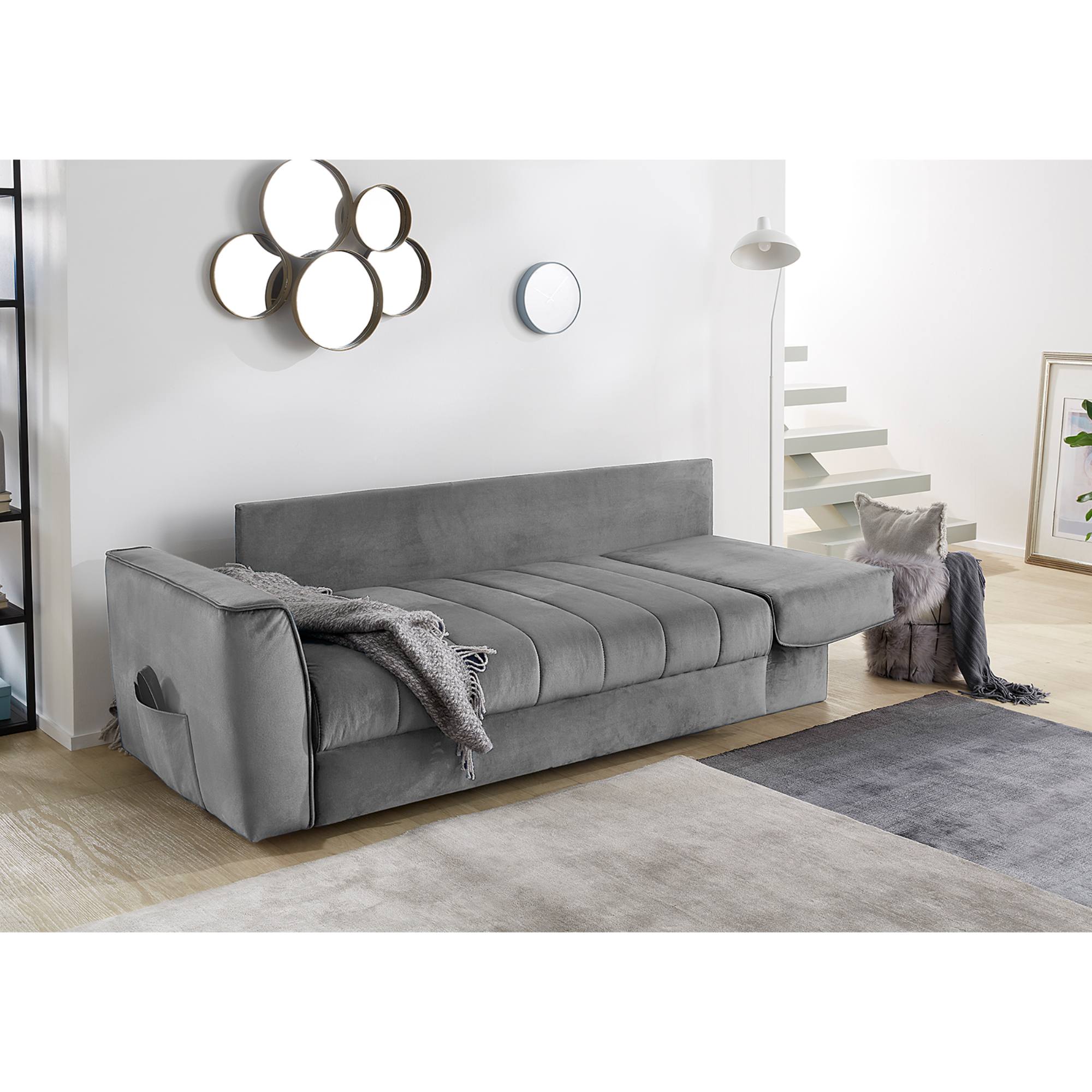 Pohovka s pružinovým jadrom je potiahnutá tkaninou zamatového vzhľadu, vďaka ktorej je veľmi príjemná na dotyk. Disponuje vyššími podrúčkami a chrbtovými vankúšmi, do ktorých sa môžete pohodlne zaboriť a dopriať si potrebný relax. Pohovku ľahko premeníte na dodatočné lôžko pre jednu osobu. Stačí sklopiť podrúčku a môžete si dopriať popoludňajšiu siestu alebo uložiť na prenocovanie návštevu. Integrovaný úložný priestor poskytne dostatočné miesto nielen na lôžkoviny, ktoré budete mať v prípade potreby hneď po ruke.