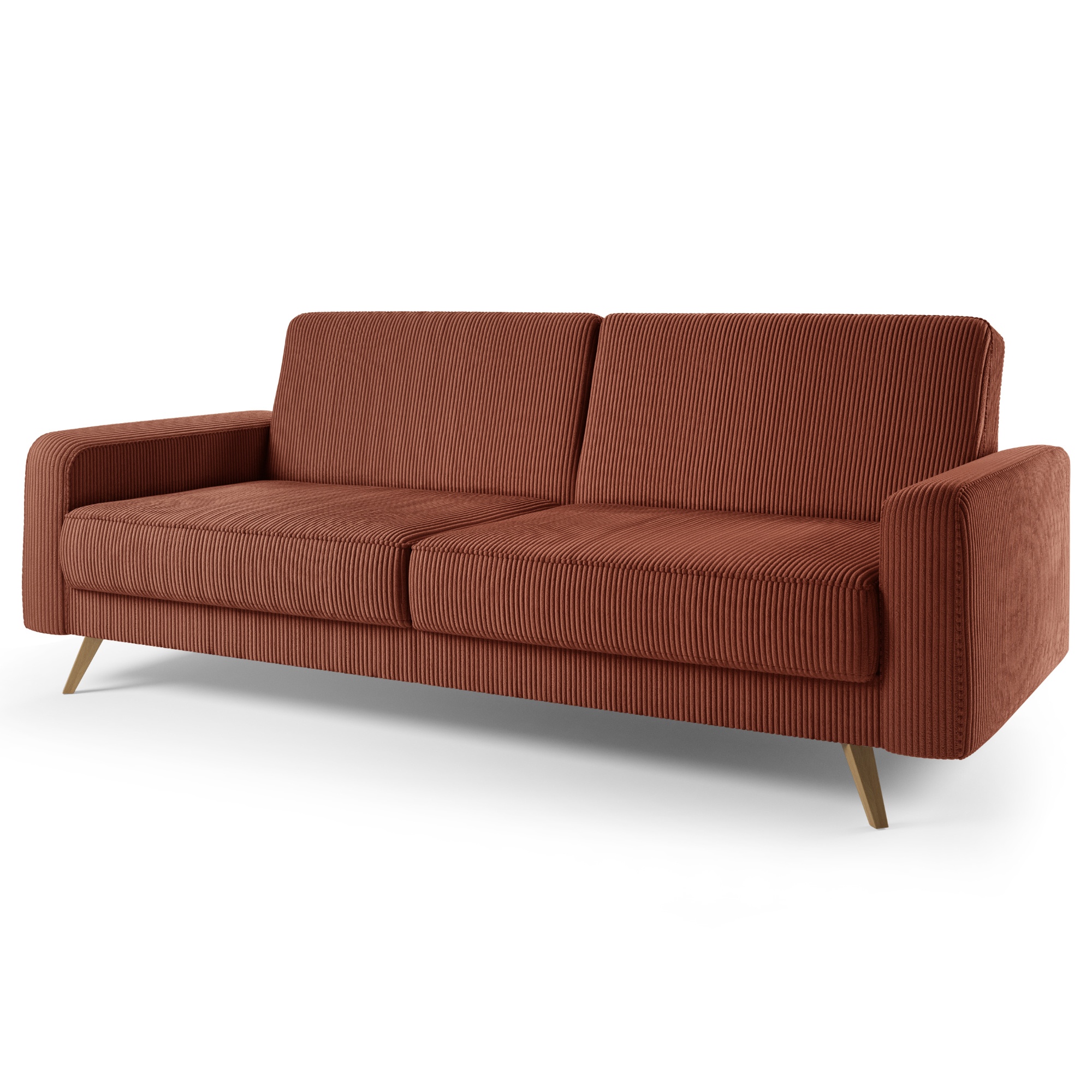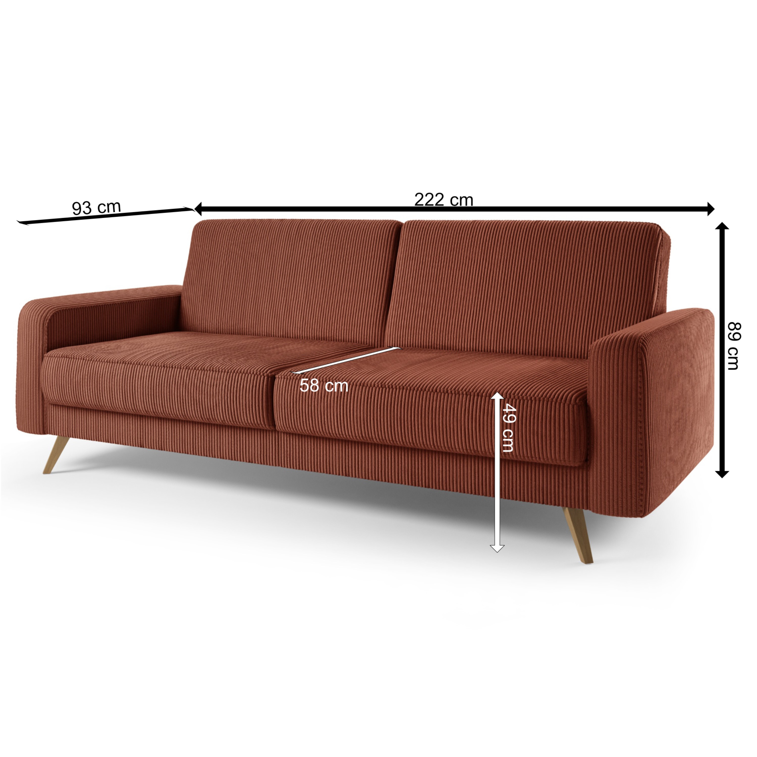 O vaše pohodlie sa postará kvalitný poťah z hladkej tkaniny menčestrového vzhľadu a mäkká penová výplň, čo oceníte pri dlhom leňošení. Vďaka možnosti rozloženia bez problémov vyrieši aj uloženie nečakanej návštevy a poskytne provizórne lôžko na prenocovanie. V ráme sa tiež nachádza praktický úložný priestor. Chrbát potiahnutý originálnou tkaninou vám dopraje luxus a umožní pohovku umiestniť do priestoru alebo k stene. Nohy z masívneho dubového dreva uľahčia udržanie poriadku pod pohovkou.