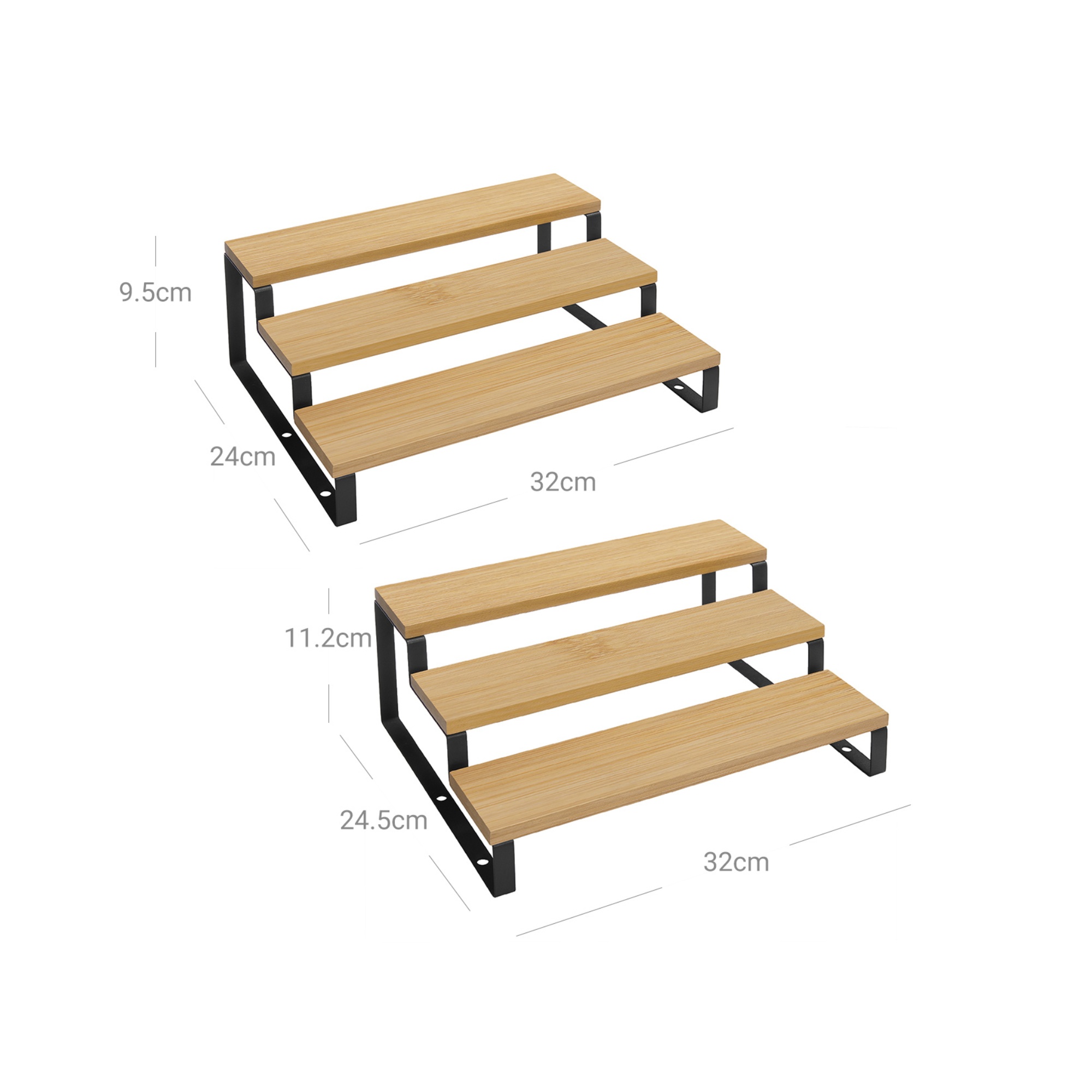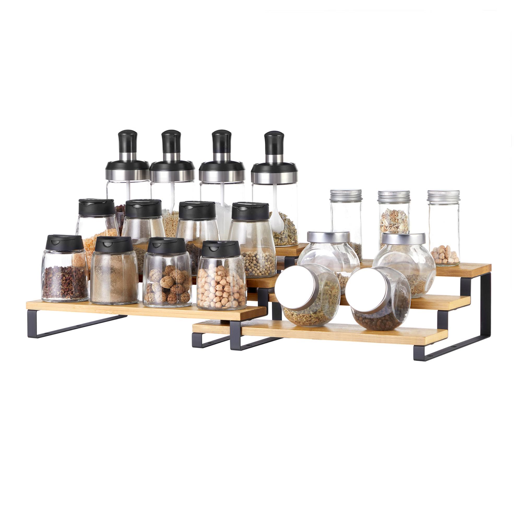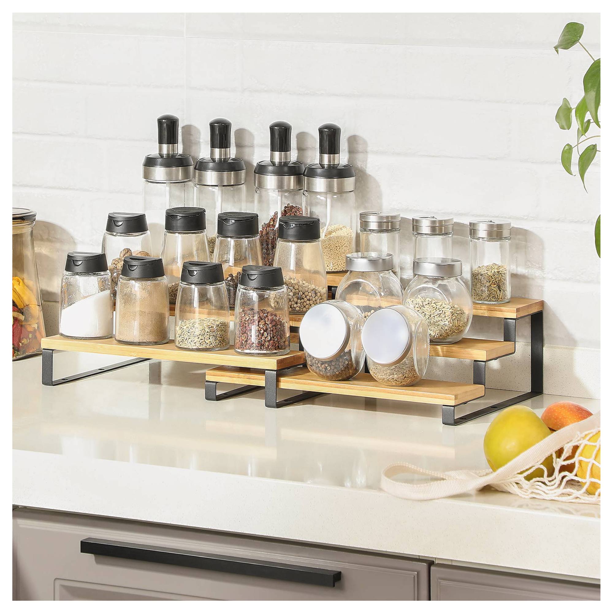 Dva robustné bambusové stojany na koreničky s kovovou konštrukciou disponujú tromi policami. Police, ktoré sa ľahko zostavujú, je možné využívať ako celok alebo samostatne. Táto sada tak ponúka dostatok miesta na usporiadanie všetkých vašich obľúbených ingrediencií.