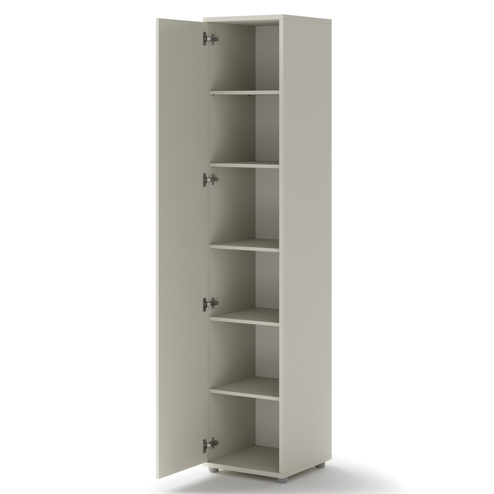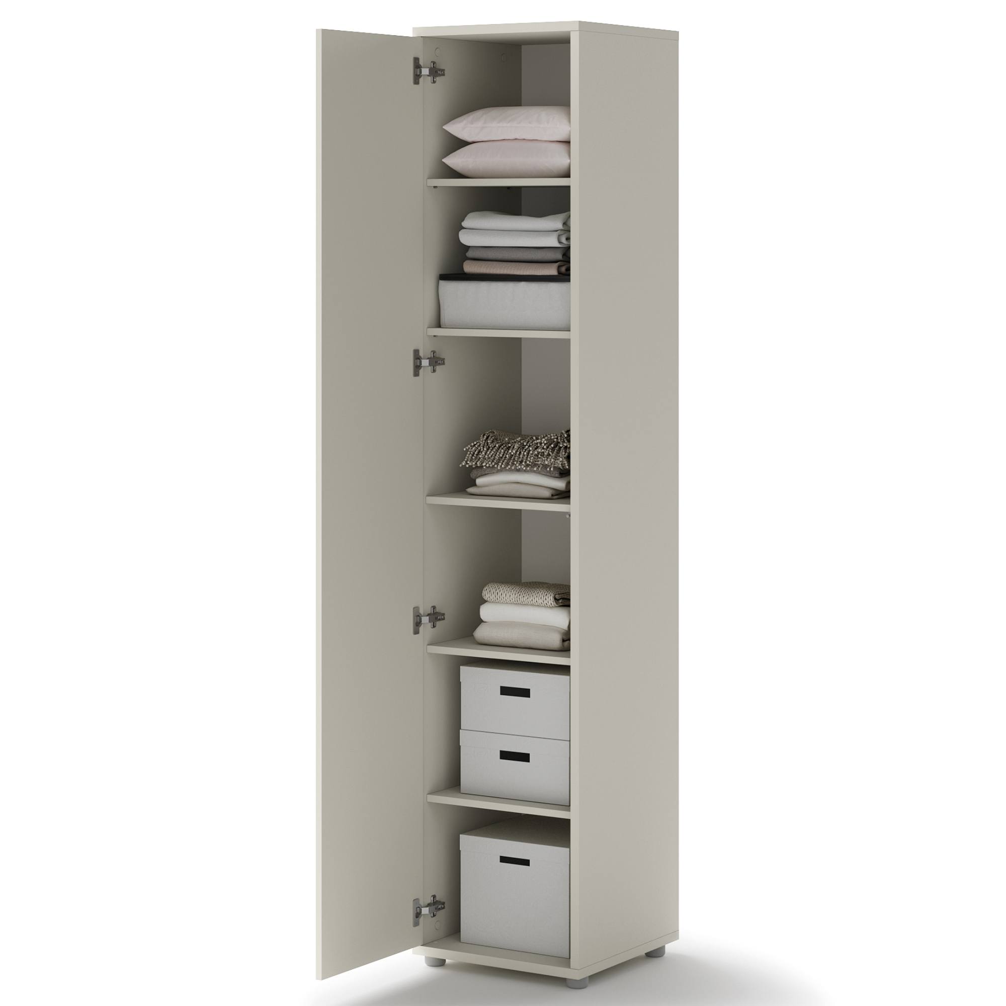 Skriňa disponuje otočnými dverami, ktoré sú vybavené systémom push to open na jednoduchú každodennú manipuláciu. Za dverami sa nachádza 5 vložených políc na prehľadné skladovanie oblečenia alebo aj kancelárskych potrieb. Celú konštrukciu podopierajú nízke plastové nôžky. Skriňa je vyrobená z laminovanej drevotriesky s povrchom nenáročným na údržbu.