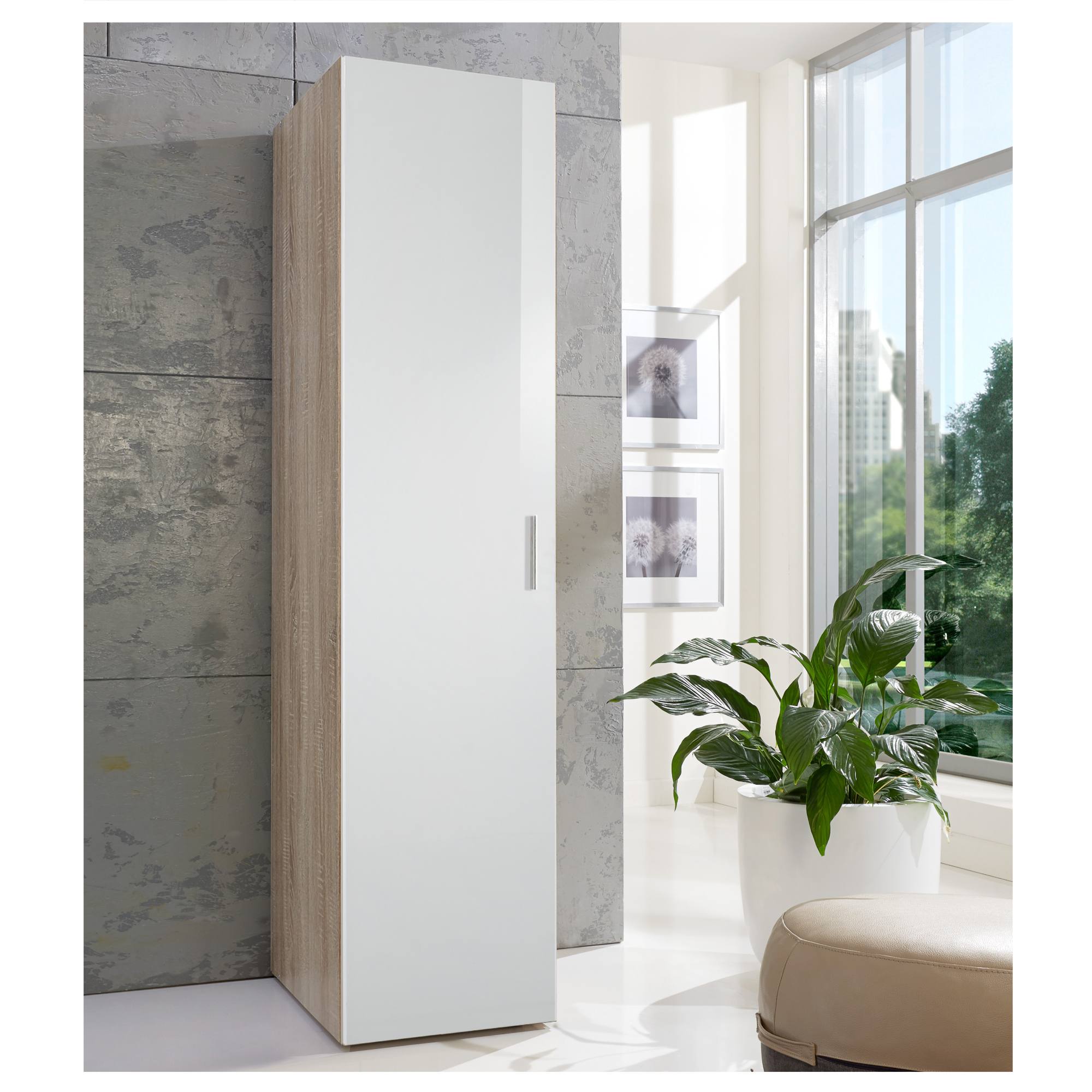Skriňa je vybavená otočnými dverami za ktorými sa nachádza prakticky členené vnútorné vybavenie vo forme 6 vložených políc. Dvere sú vybavené praktickou rúčkou vo farbe kovu na ľahšiu každodennú manipuláciu. Korpus skrine je vyrobený z laminovaného dreveného materiálu s povrchom nenáročným na údržbu. Skriňa umožňuje univerzálnu montáž dverí, takže sa môžu otvárať z ľavej alebo pravej strany podľa vašich preferencií.