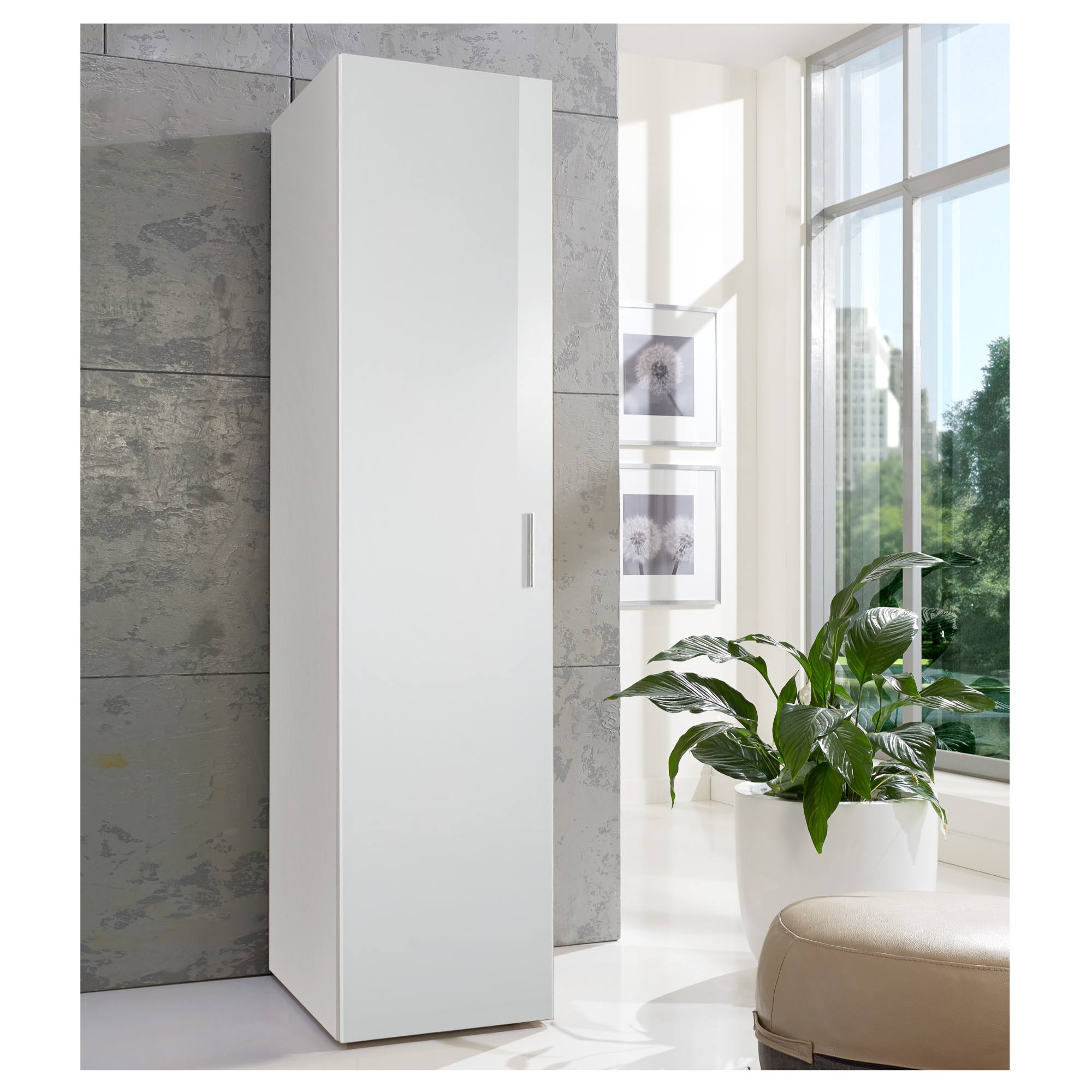 Skriňa je vybavená otočnými dverami za ktorými sa nachádza prakticky členené vnútorné vybavenie vo forme 6 vložených políc. Dvere sú vybavené praktickou rúčkou vo farbe kovu na ľahšiu každodennú manipuláciu. Korpus skrine je vyrobený z laminovaného dreveného materiálu s povrchom nenáročným na údržbu. Skriňa umožňuje univerzálnu montáž dverí, takže sa môžu otvárať z ľavej alebo pravej strany podľa vašich preferencií.