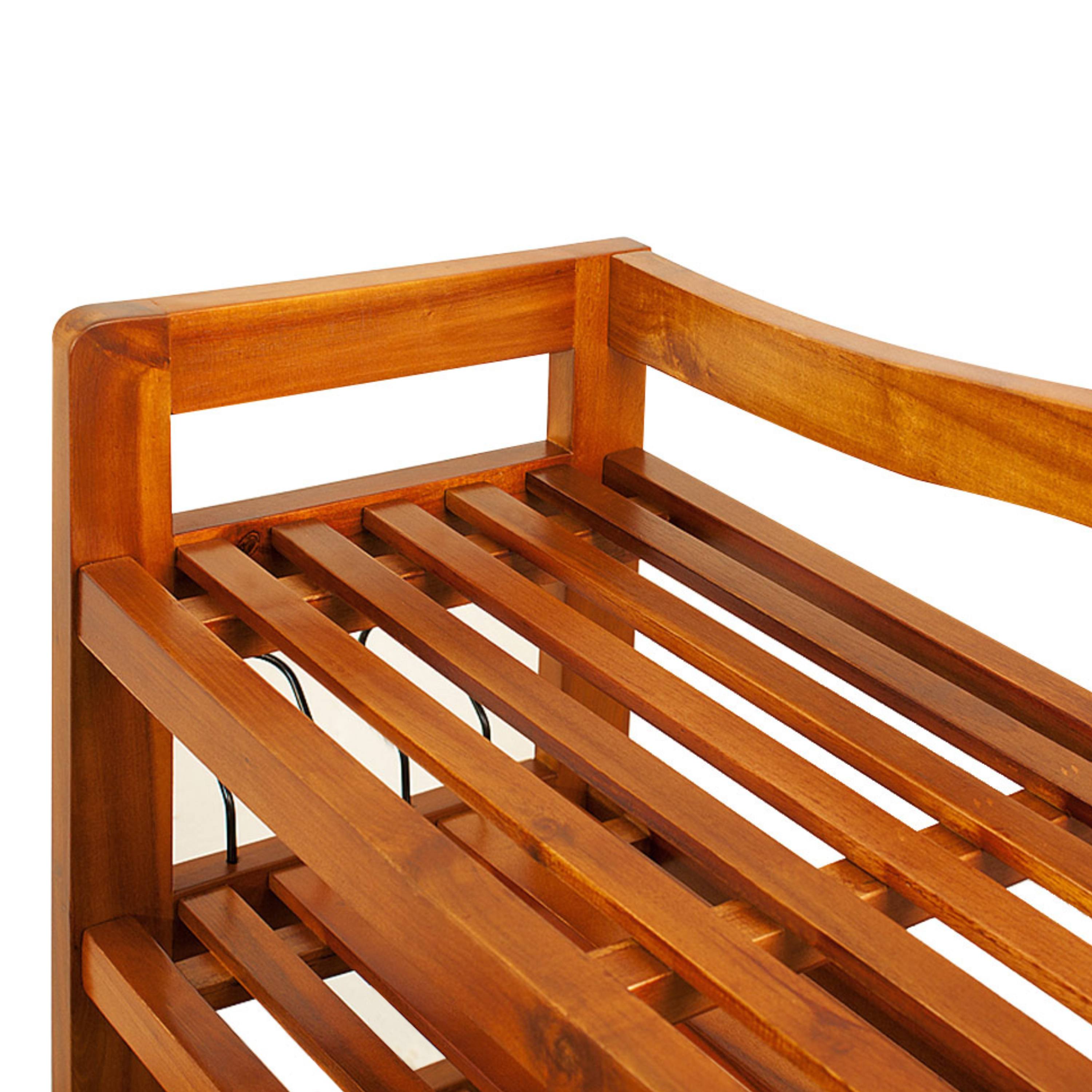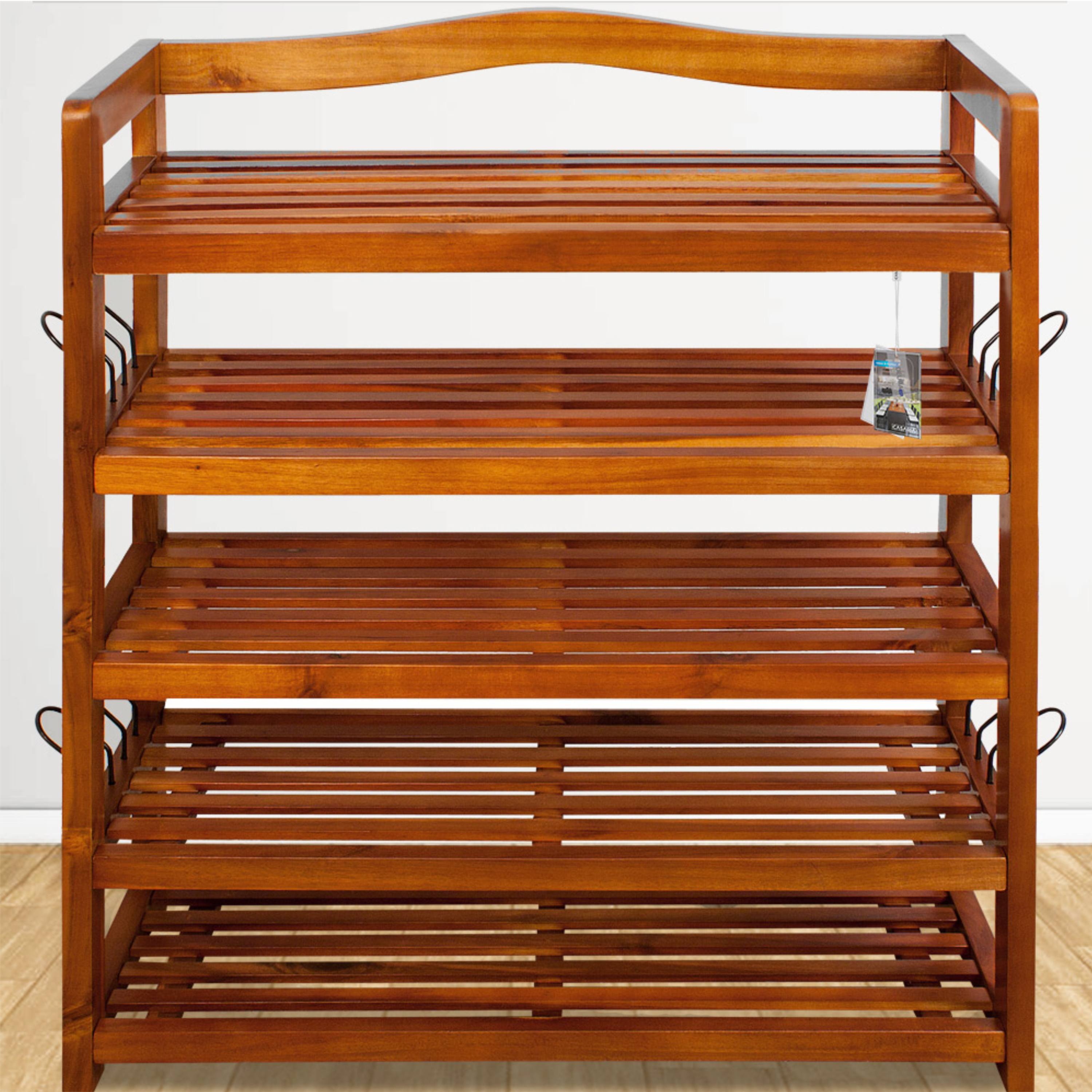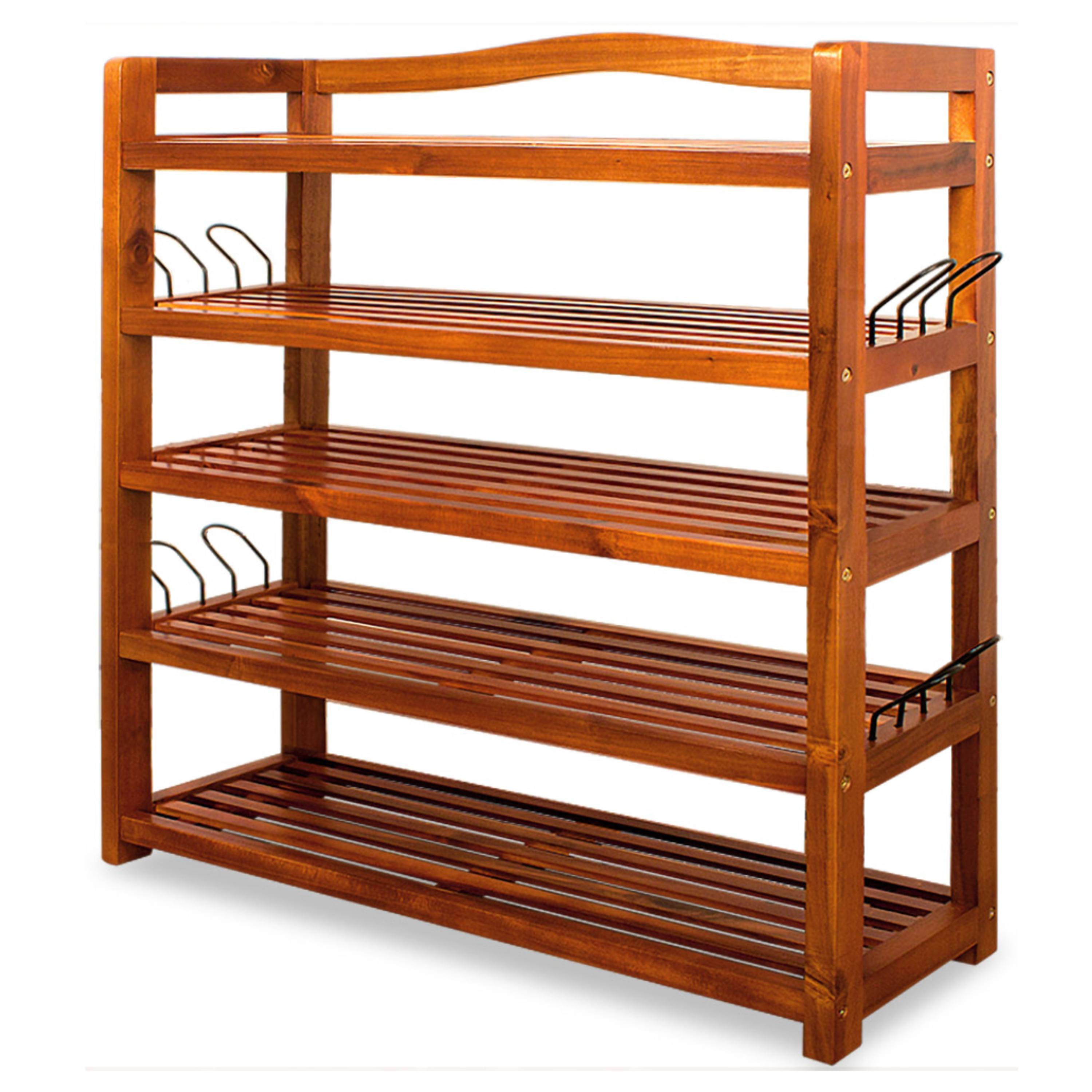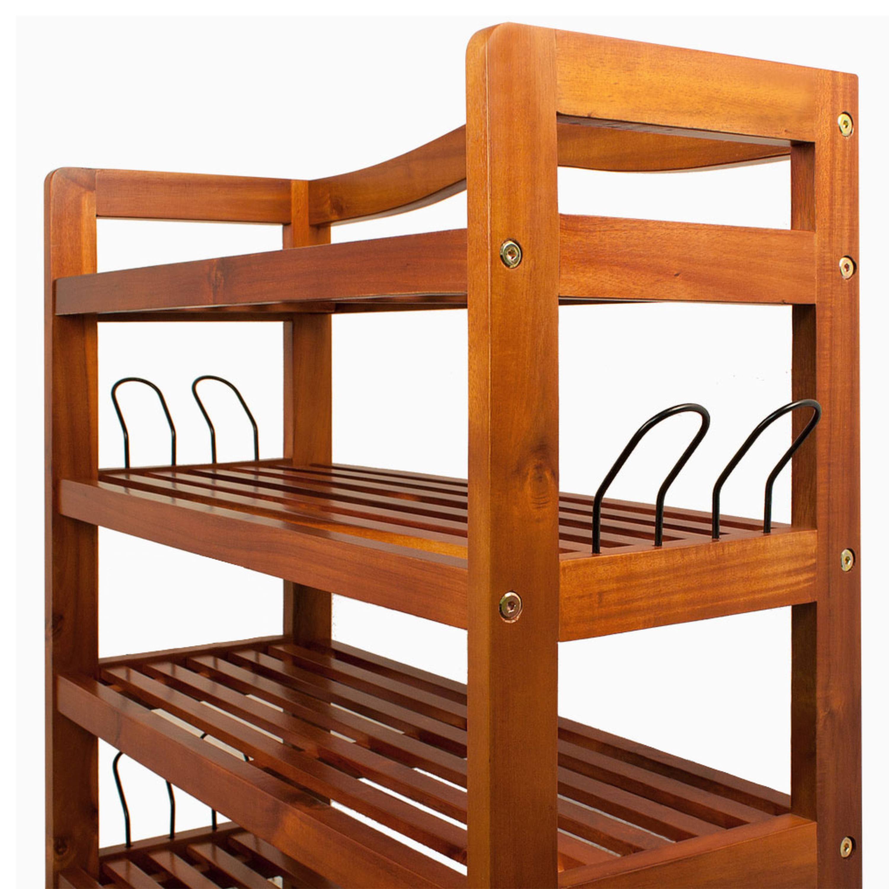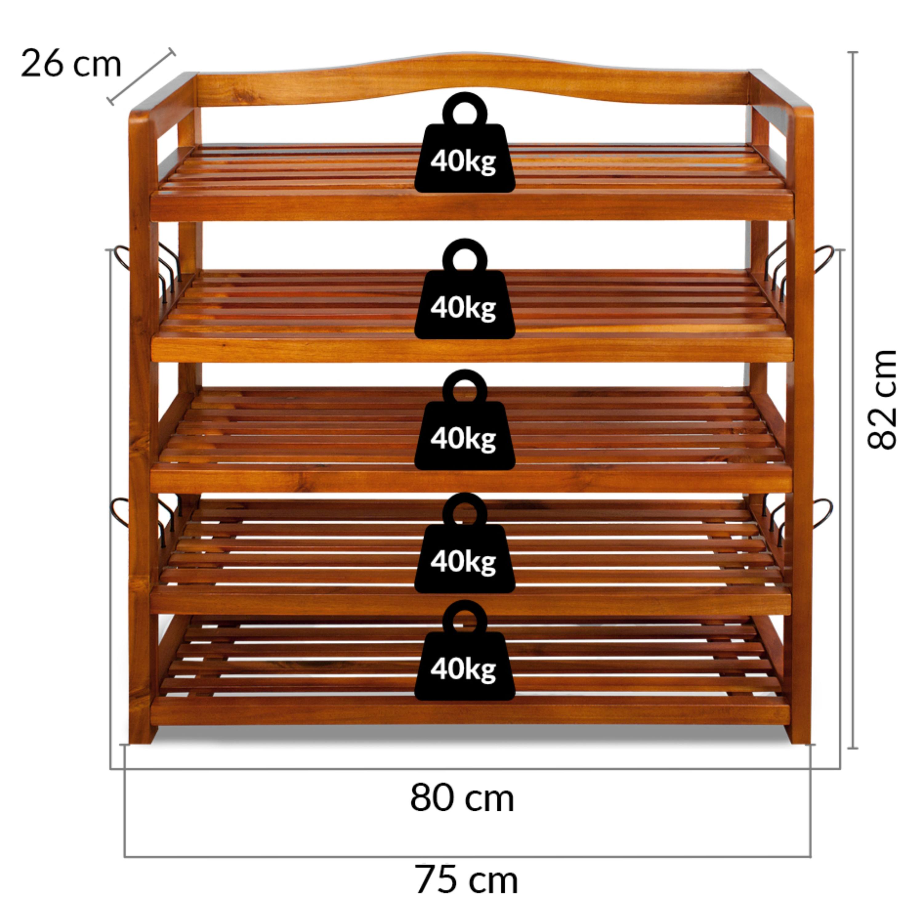 Skrinka na topánky je vyrobená z masívneho akáciového dreva, ktoré zabezpečuje potrebnú pevnosť a odolnosť. Teplý odtieň dreva dodáva priestoru útulnosť a zároveň pôsobí elegantným nadčasovým dojmom. Skrinka na topánky disponuje 5 otvorenými policami, ktoré poskytujú dostatok miesta až pre 30 párov topánok. Každá polica má nosnosť až 40 kg, takže bez problémov unesie aj ťažšie predmety. Otvorené prevedenie navyše zabezpečuje dobrú cirkuláciu vzduchu a prehľadné skladovanie s jednoduchým prístupom. Praktickým doplnkom sú kovové bočné držiaky, ktoré možno využiť napríklad na uloženie ďalšej obuvi či menších doplnkov.