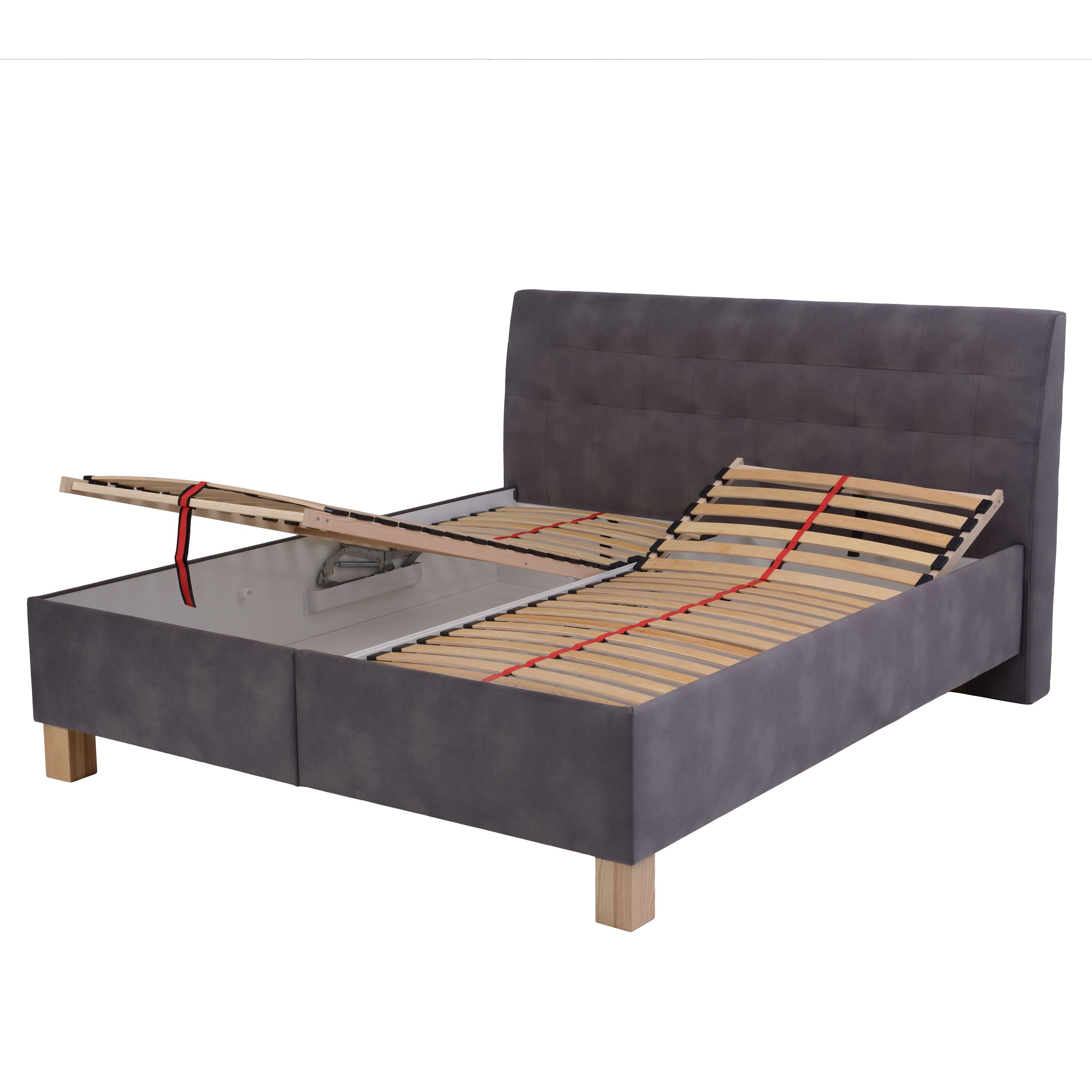 Dominantným prvkom je vysoké čelo s decentným dekoratívnym prešívaním, ktoré okrem estetickej funkcie umožňuje pohodlné opretie. Posteľ je dodávaná vrátane 2 lamelových roštov, ktoré sú polohovateľné pod hlavou do 5 rôznych relaxačných polôh a navyše pri nohách ich možno zdvihnúť do zvýšenej pozície na uvoľnenie unavených nôh. Posteľ ponúka tiež praktický úložný priestor v ráme s jednoduchým čelným prístupom. Celkový vzhľad postele podčiarkujú nohy z bukového dreva v prírodnom odtieni.