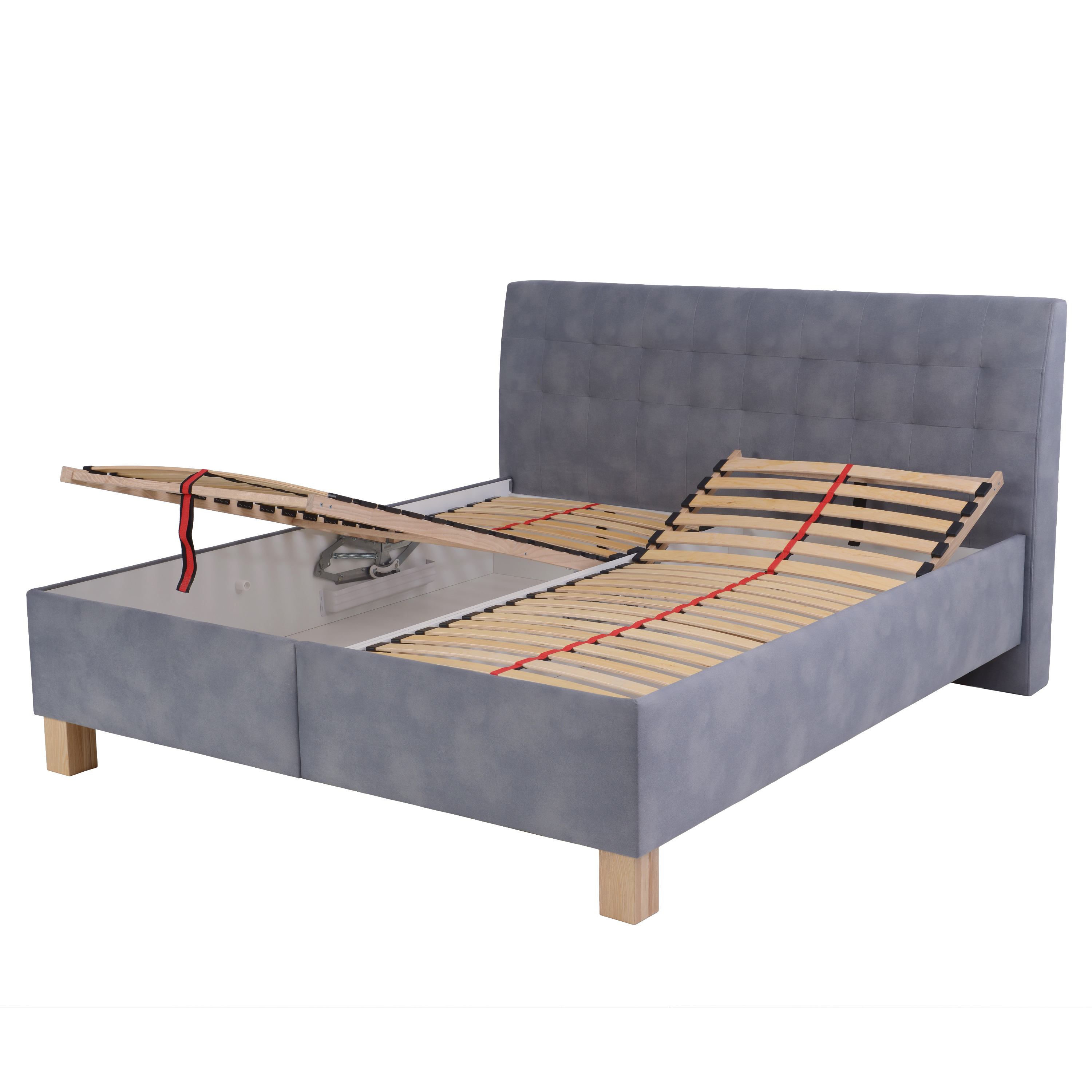 Dominantným prvkom je vysoké čelo s decentným dekoratívnym prešívaním, ktoré okrem estetickej funkcie umožňuje pohodlné opretie. Posteľ je dodávaná vrátane 2 lamelových roštov, ktoré sú polohovateľné pod hlavou do 5 rôznych relaxačných polôh a navyše pri nohách ich možno zdvihnúť do zvýšenej pozície na uvoľnenie unavených nôh. Posteľ ponúka tiež praktický úložný priestor v ráme s jednoduchým čelným prístupom. Celkový vzhľad postele podčiarkujú nohy z bukového dreva v prírodnom odtieni.