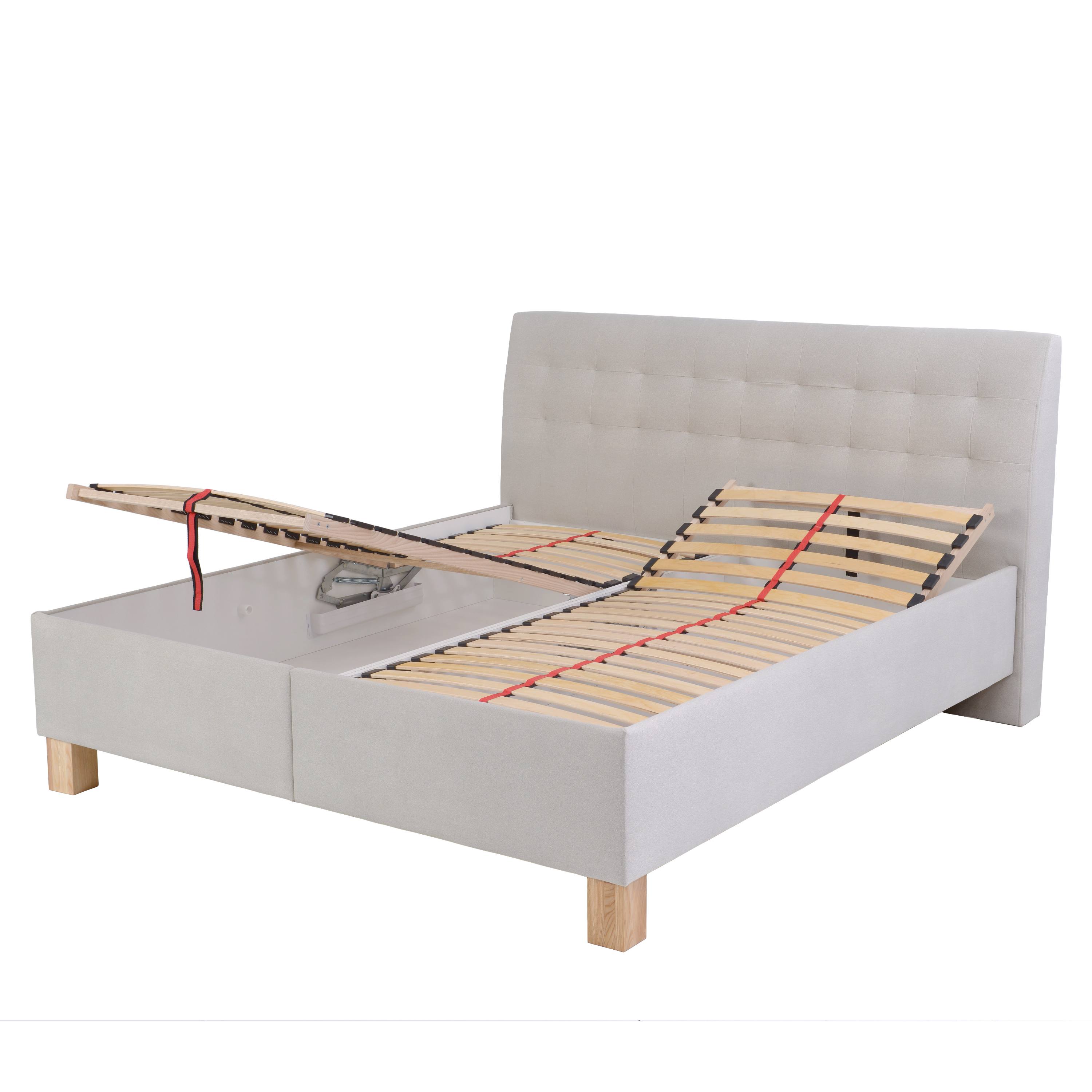 Dominantným prvkom je vysoké čelo s decentným dekoratívnym prešívaním, ktoré okrem estetickej funkcie umožňuje pohodlné opretie. Posteľ je dodávaná vrátane 2 lamelových roštov, ktoré sú polohovateľné pod hlavou do 5 rôznych relaxačných polôh a navyše pri nohách ich možno zdvihnúť do zvýšenej pozície na uvoľnenie unavených nôh. Posteľ ponúka tiež praktický úložný priestor v ráme s jednoduchým čelným prístupom. Celkový vzhľad postele podčiarkujú nohy z bukového dreva v prírodnom odtieni.