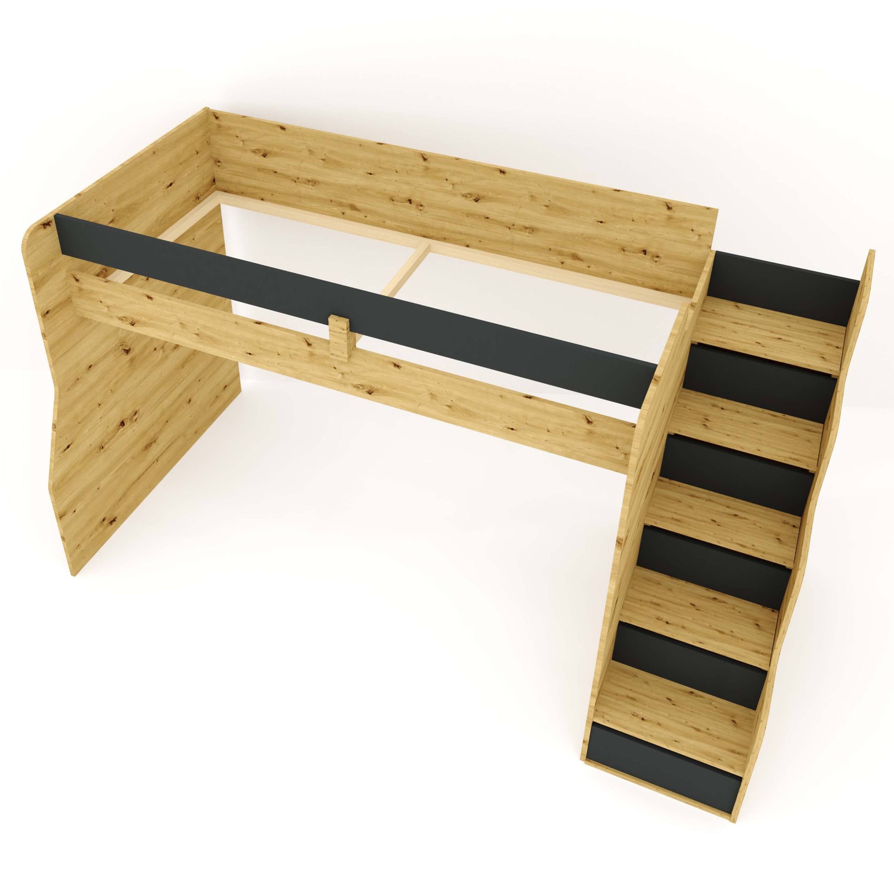 Jej konštrukcia je vyrobená z laminovanej drevotriesky v prírodnom dekore duba artisan v kombinácii s kontrastnou farbou. Lôžko s veľkosťou plochy na spanie 90×200 cm je ľahko prístupné vďaka praktickým schodíkom. Každý schod v sebe navyše ukrýva úložný priestor zakrytý výklopnými dvierkami. Pre bezpečie vášho dieťaťa je lôžko vybavené bezpečnostnou zábranou. Voľný priestor pod ložnou plochou môžete využiť na vytvorenie kútika s obľúbenými hračkami. Posteľ sa dodáva bez matraca a roštu. Odporúčaná celková výška roštu a matraca je maximálne 16 cm.