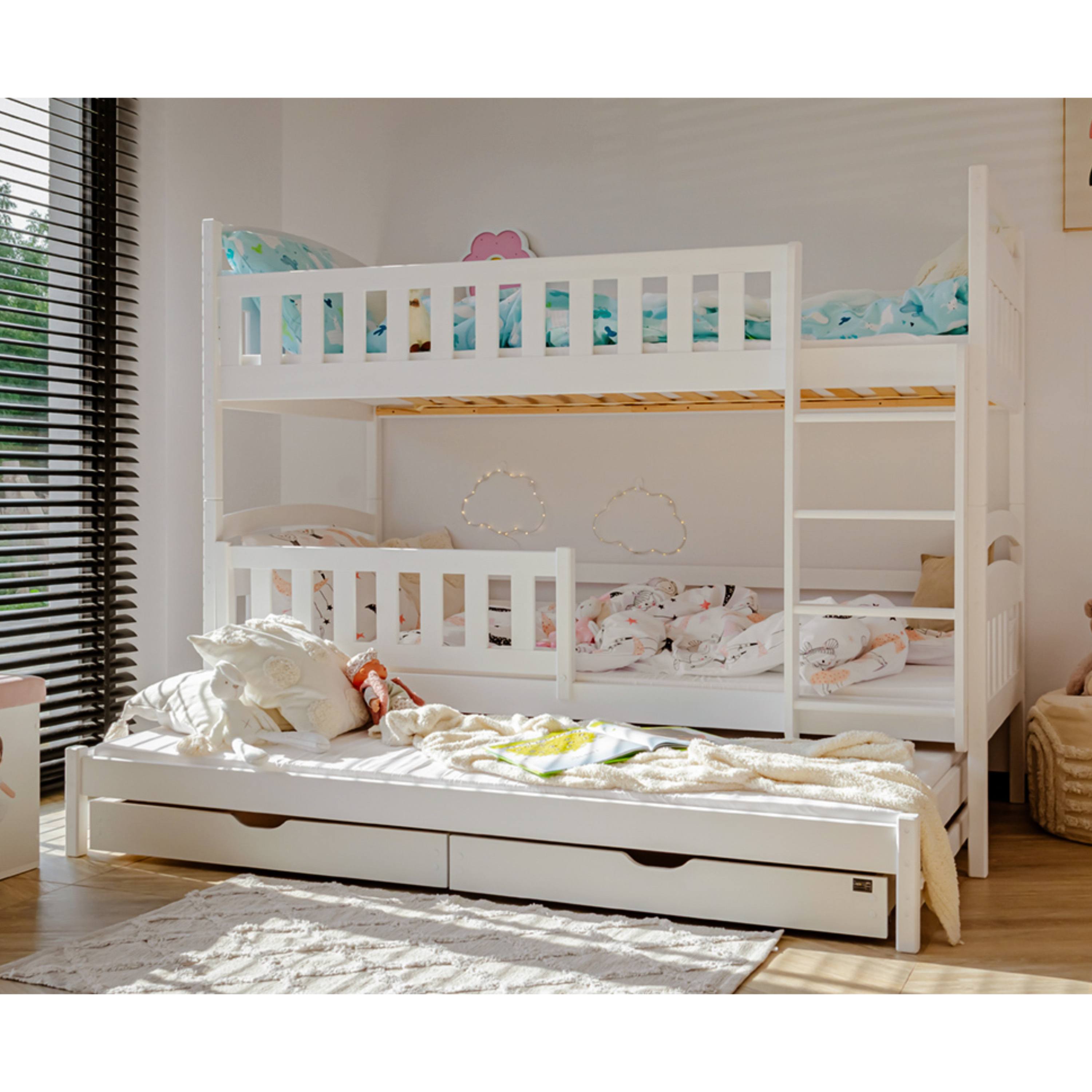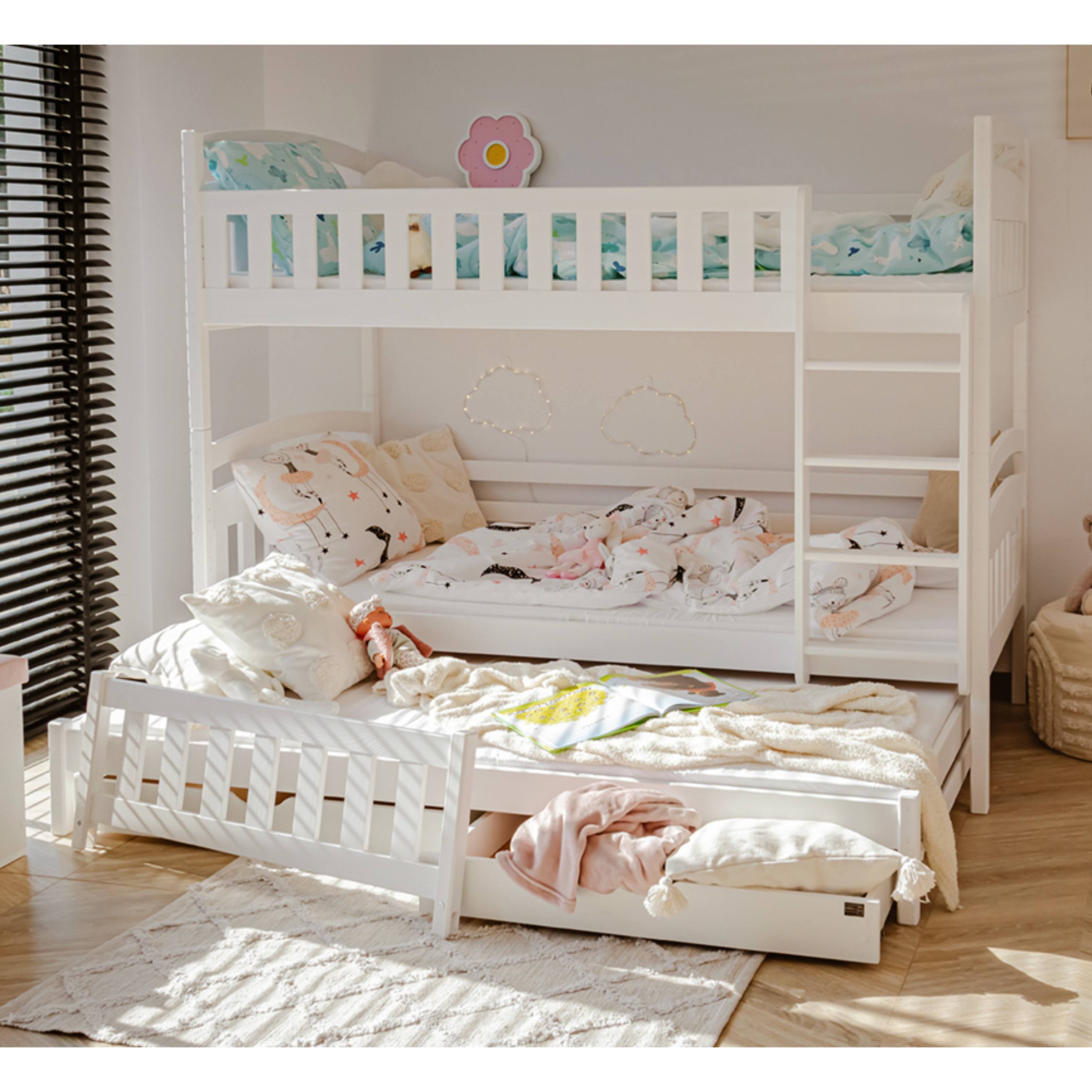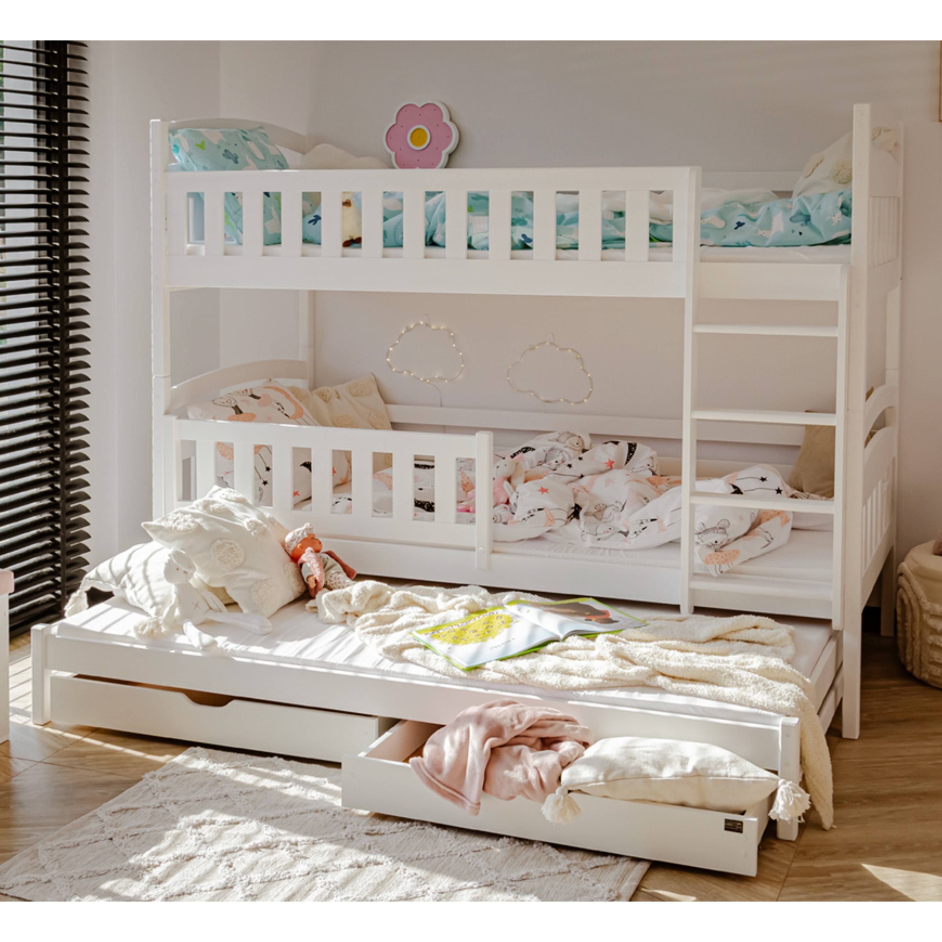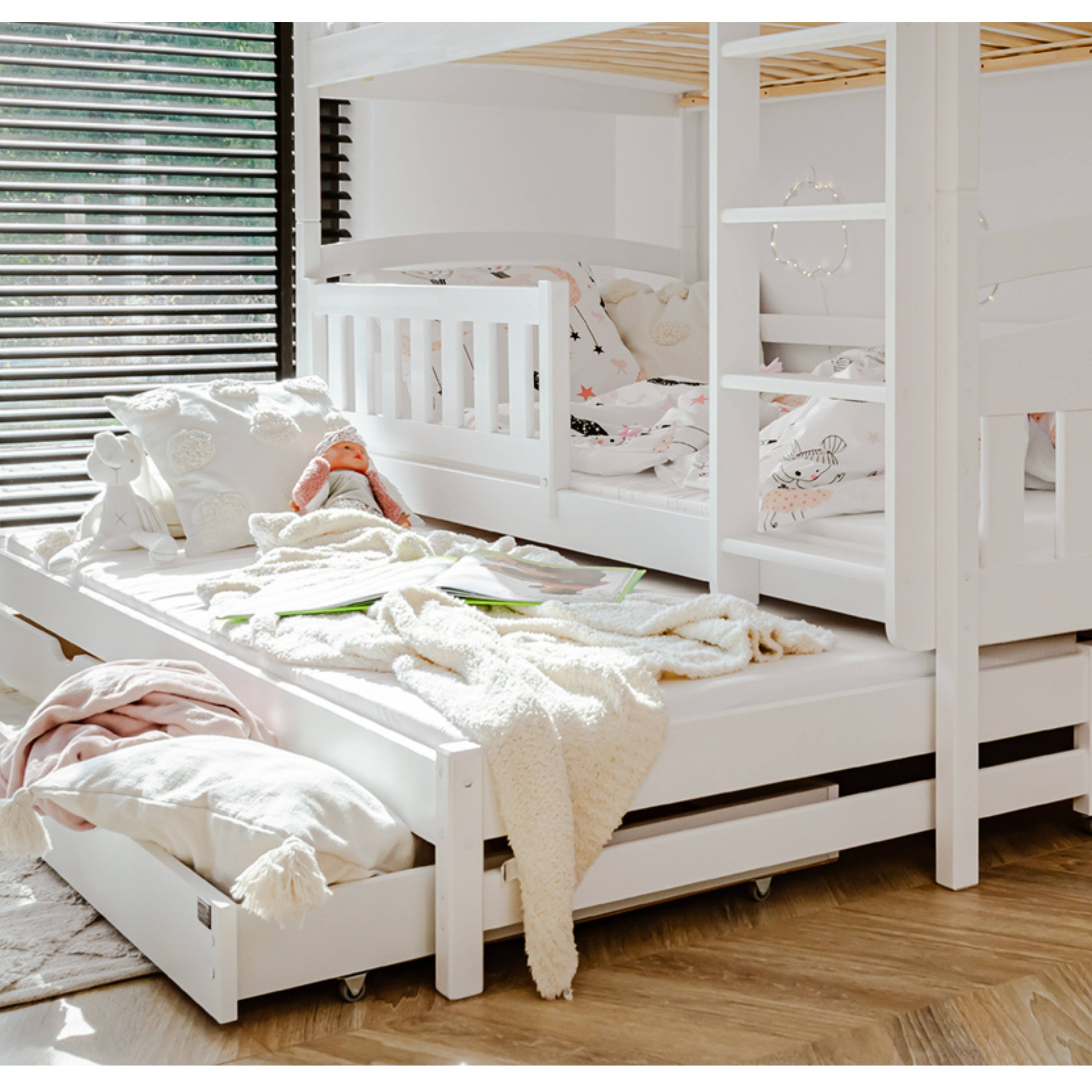 Posteľ určite oceníte aj pre jej praktickosť, pretože môžete jednotlivé poschodia využívať aj ako samostatné lôžka. Dodávaná je vrátane 3 roštov, ale matrac je nutné dokúpiť samostatne podľa potrieb vašich detí. Odporúčaná maximálna výška hlavných matracov je maximálne 13 cm a pri výsuvnom lôžku maximálne 8 cm.