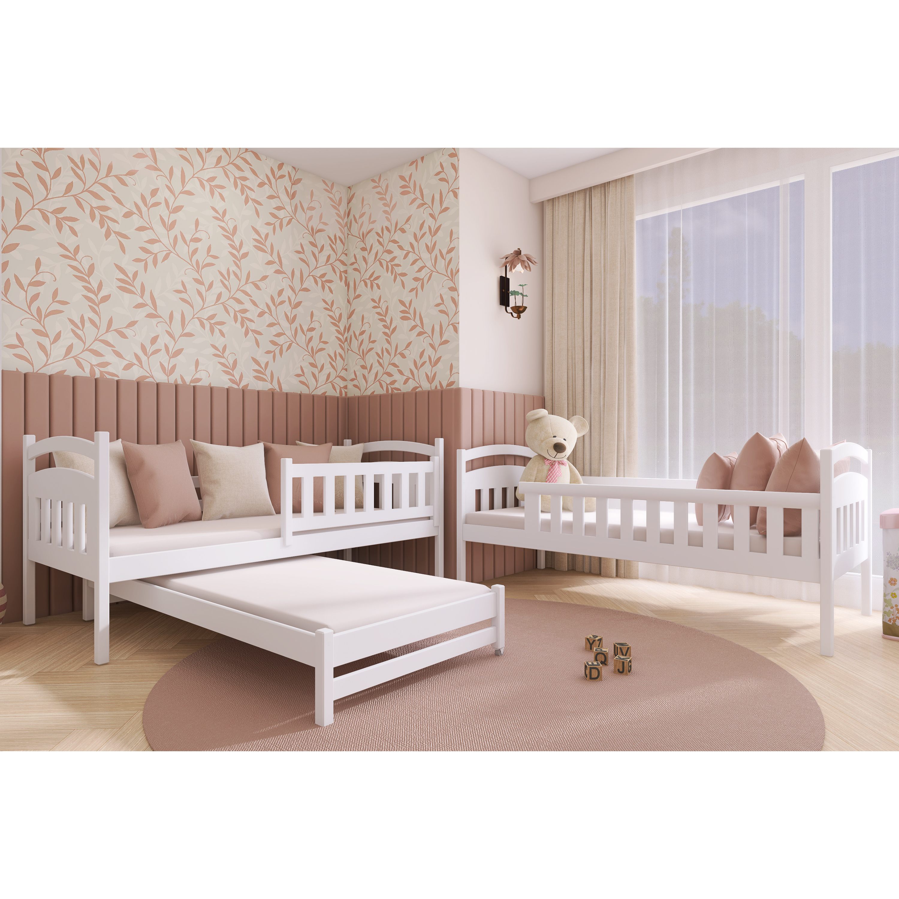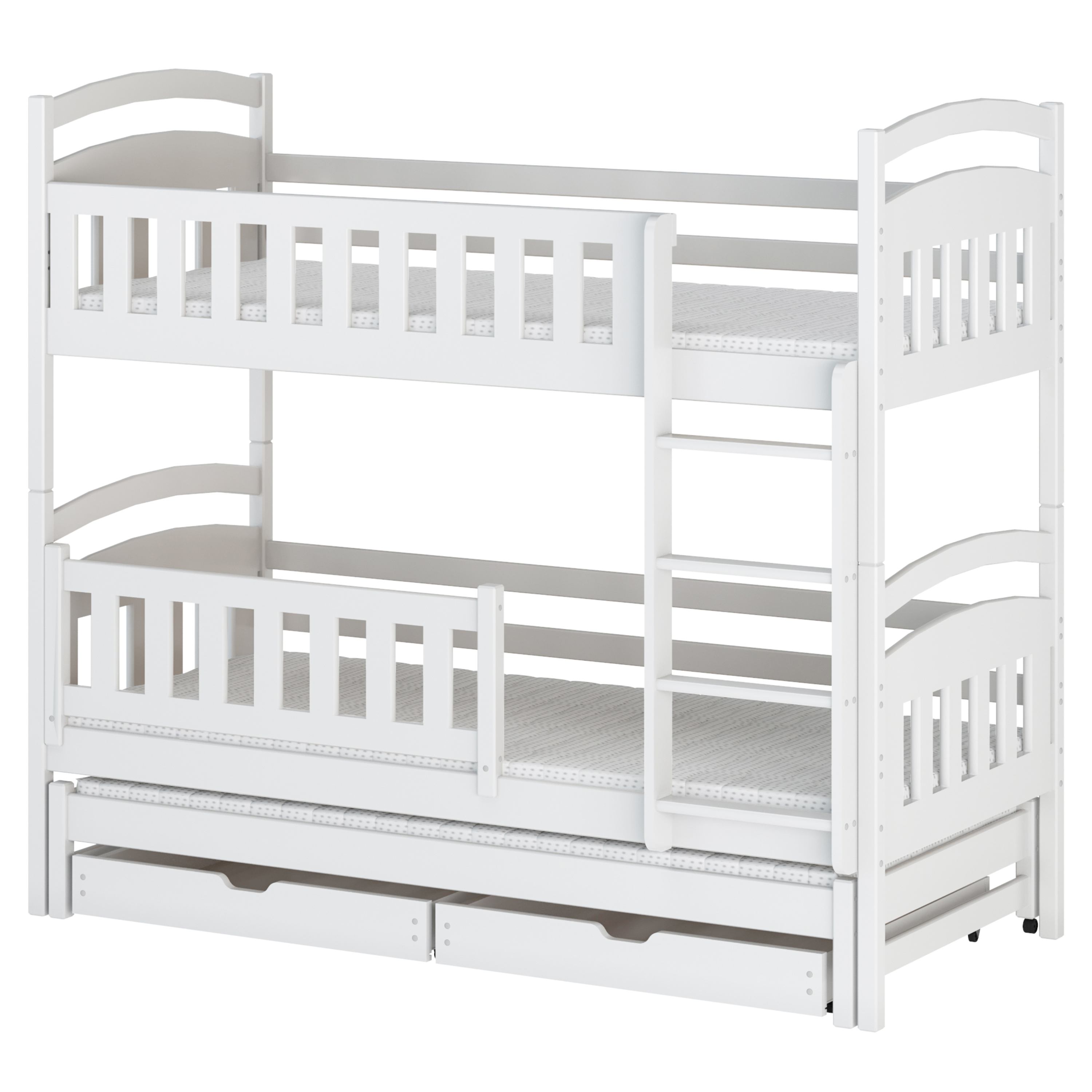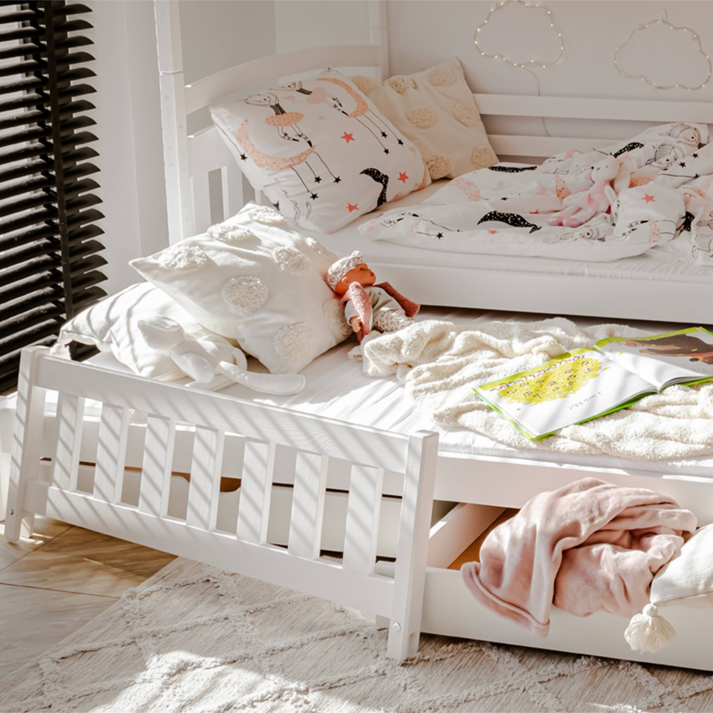Posteľ určite oceníte aj pre jej praktickosť, pretože môžete jednotlivé poschodia využívať aj ako samostatné lôžka. Dodávaná je vrátane 3 roštov, ale matrac je nutné dokúpiť samostatne podľa potrieb vašich detí. Odporúčaná maximálna výška hlavných matracov je maximálne 13 cm a pri výsuvnom lôžku maximálne 8 cm.