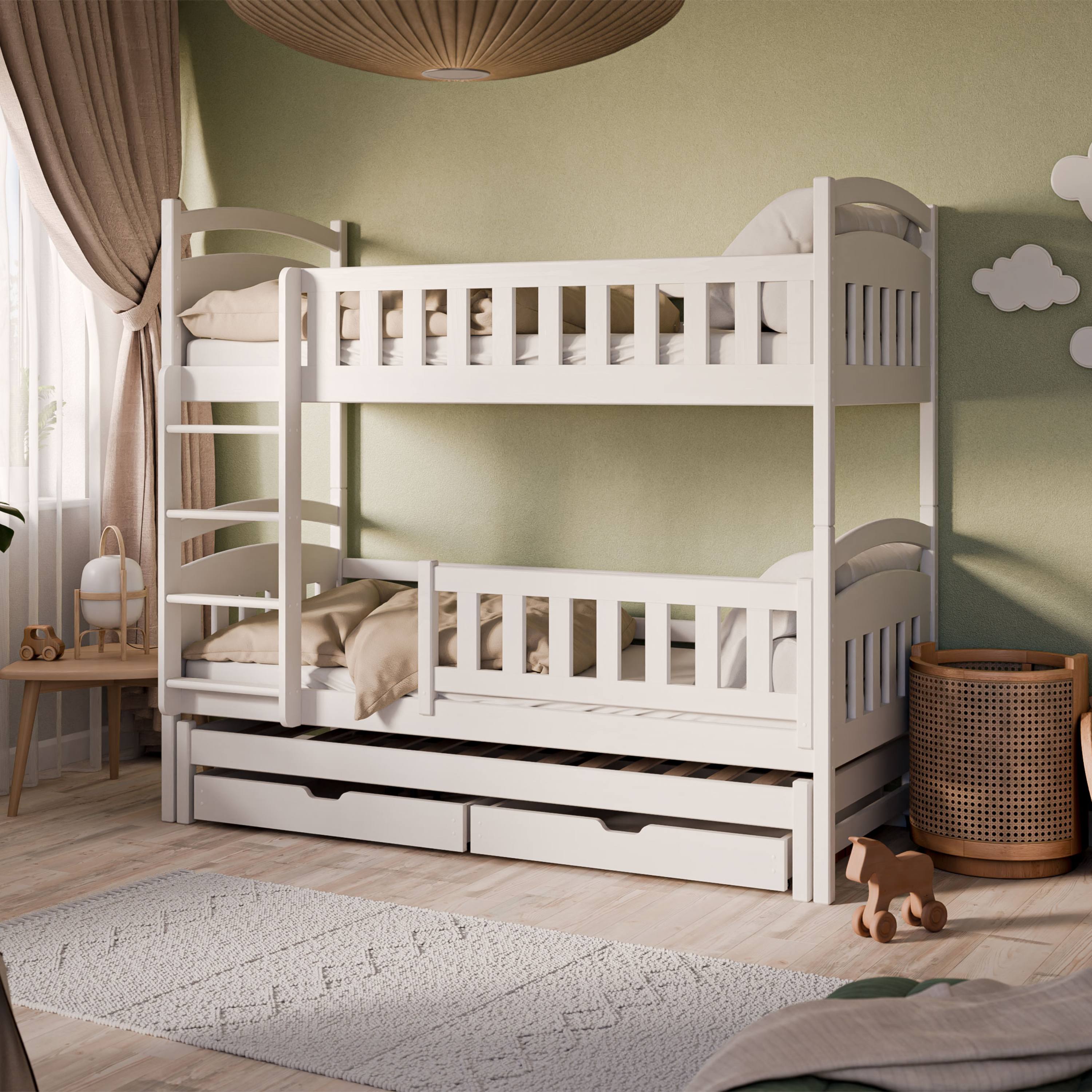 Jej pevná a stabilná konštrukcia je vyrobená z masívneho borovicového dreva v lakovanej úprave. Posteľ ponúka celkom 3 ložné plochy z toho 2 pevné a 1 výsuvnú. Vrchné poschodie je ľahko prístupné vďaka univerzálnemu rebríku so širokými stupienkami. Samozrejmosťou sú bezpečnostné zábrany, ktoré je možné odňať, keď už ich nebudete potrebovať. Aktuálne nepoužívané lôžkoviny a iné predmety môžete uložiť do 2 zásuviek z drevotriesky v spodnej časti postele.