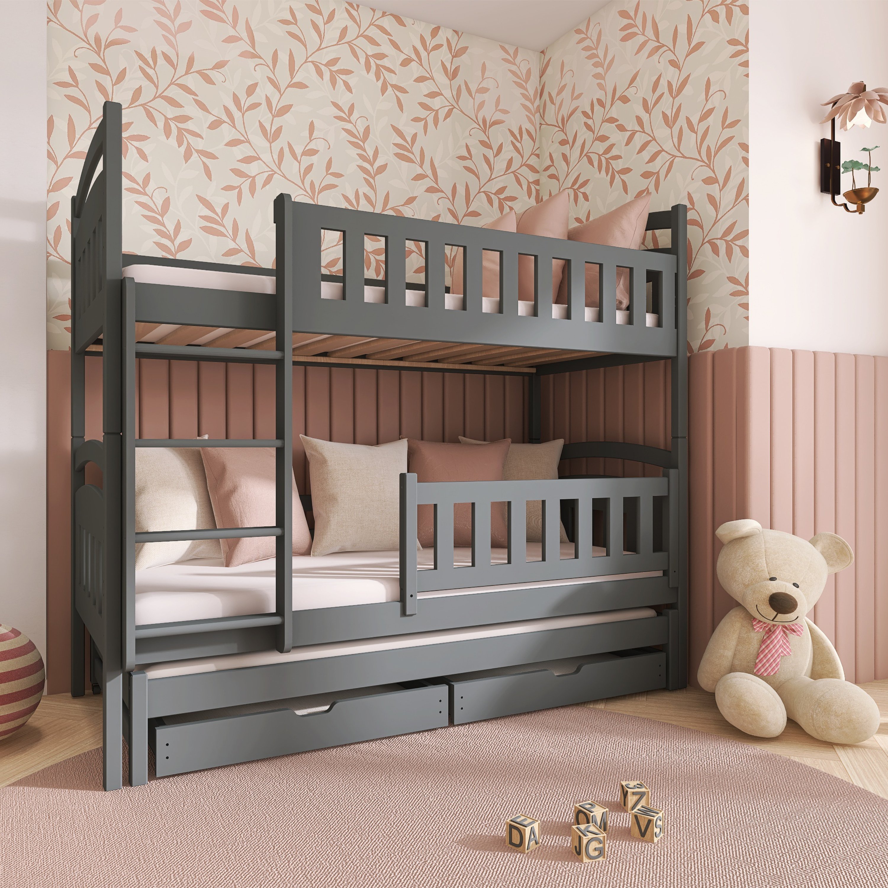 Posteľ určite oceníte aj pre jej praktickosť, pretože môžete jednotlivé poschodia využívať aj ako samostatné lôžka. Dodávaná je vrátane 3 roštov, ale matrac je nutné dokúpiť samostatne podľa potrieb vašich detí. Odporúčaná maximálna výška hlavných matracov je maximálne 13 cm a pri výsuvnom lôžku maximálne 8 cm.