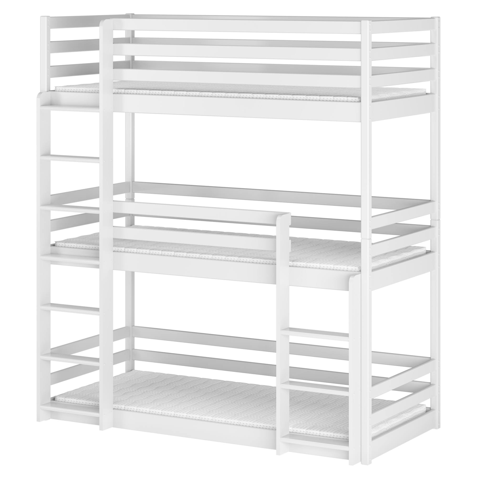 Jej konštrukcia je vyrobená z masívneho borovicového dreva, ktoré je pevné a má dlhú životnosť. Doplnená je navyše o praktické, bezpečnostné prvky ako sú zaoblené rohy alebo univerzálne rebríky so širokými stupienkami. Posteľ ponúka celkom 3 lôžka, kedy spodné lôžko môže byť využívané aj ako základňa na hranie a zábavu. Dodávaná je vrátane 3 roštov, ale matrac je nutné dokúpiť samostatne podľa potrieb vašich detí. Odporúčaná maximálna výška matracov je 13 cm.