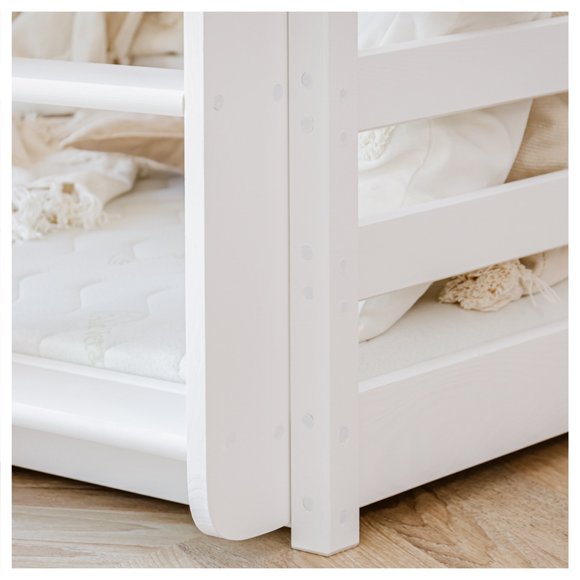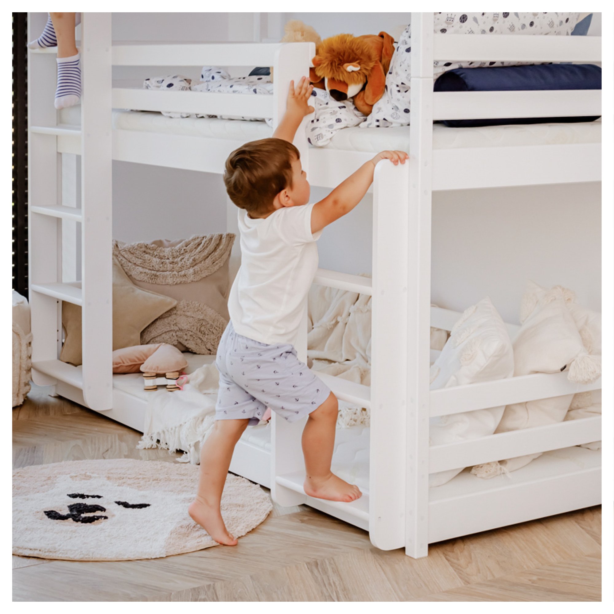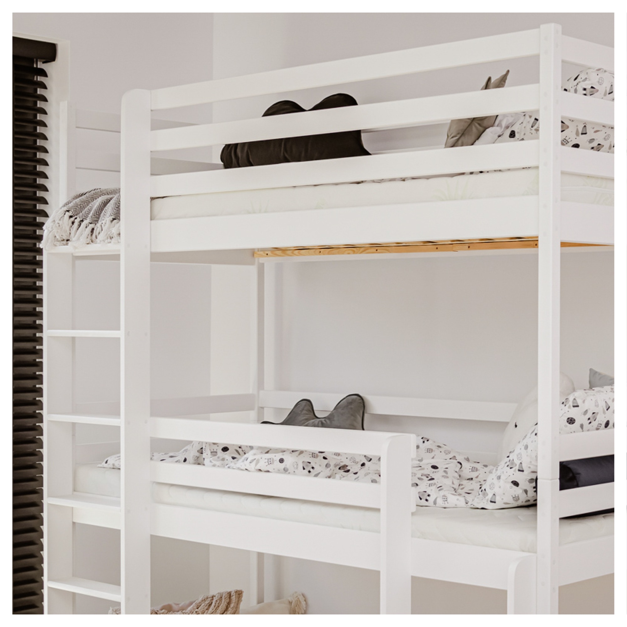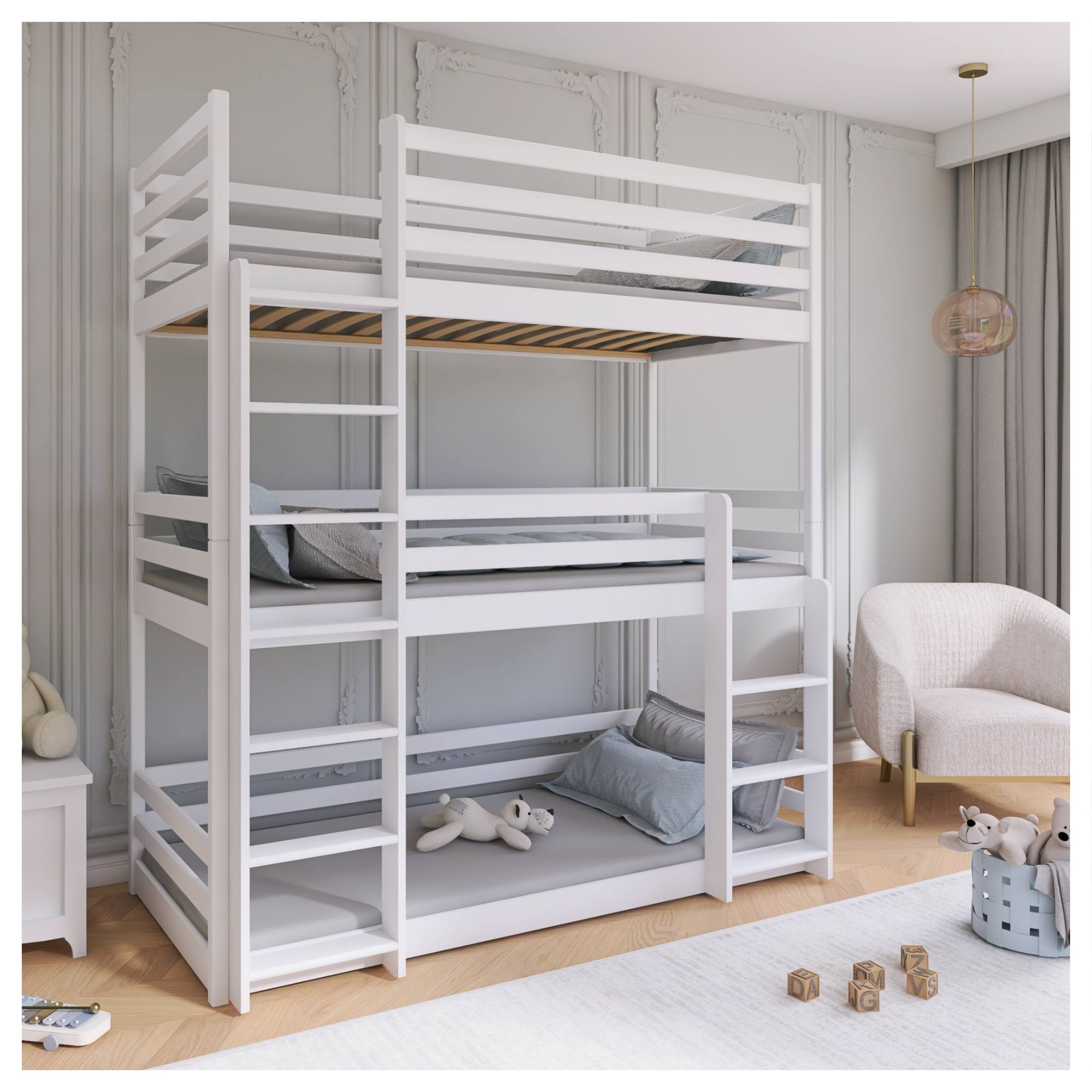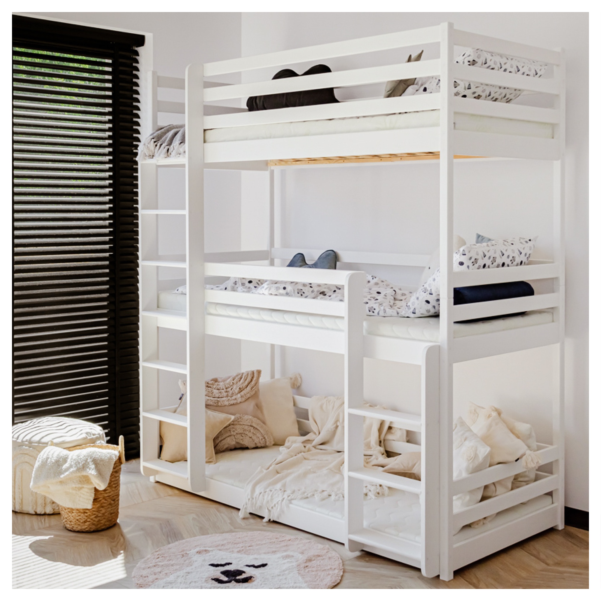 Jej konštrukcia je vyrobená z masívneho borovicového dreva, ktoré je pevné a má dlhú životnosť. Doplnená je navyše o praktické, bezpečnostné prvky ako sú zaoblené rohy alebo univerzálne rebríky so širokými stupienkami. Posteľ ponúka celkom 3 lôžka, kedy spodné lôžko môže byť využívané aj ako základňa na hranie a zábavu. Dodávaná je vrátane 3 roštov, ale matrac je nutné dokúpiť samostatne podľa potrieb vašich detí. Odporúčaná maximálna výška matracov je 13 cm.