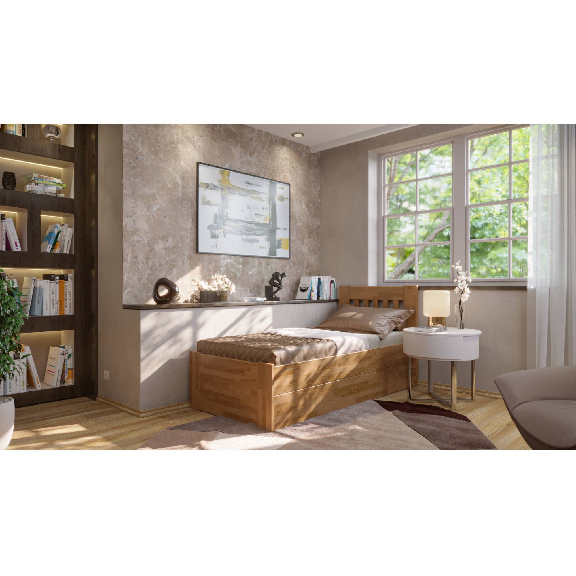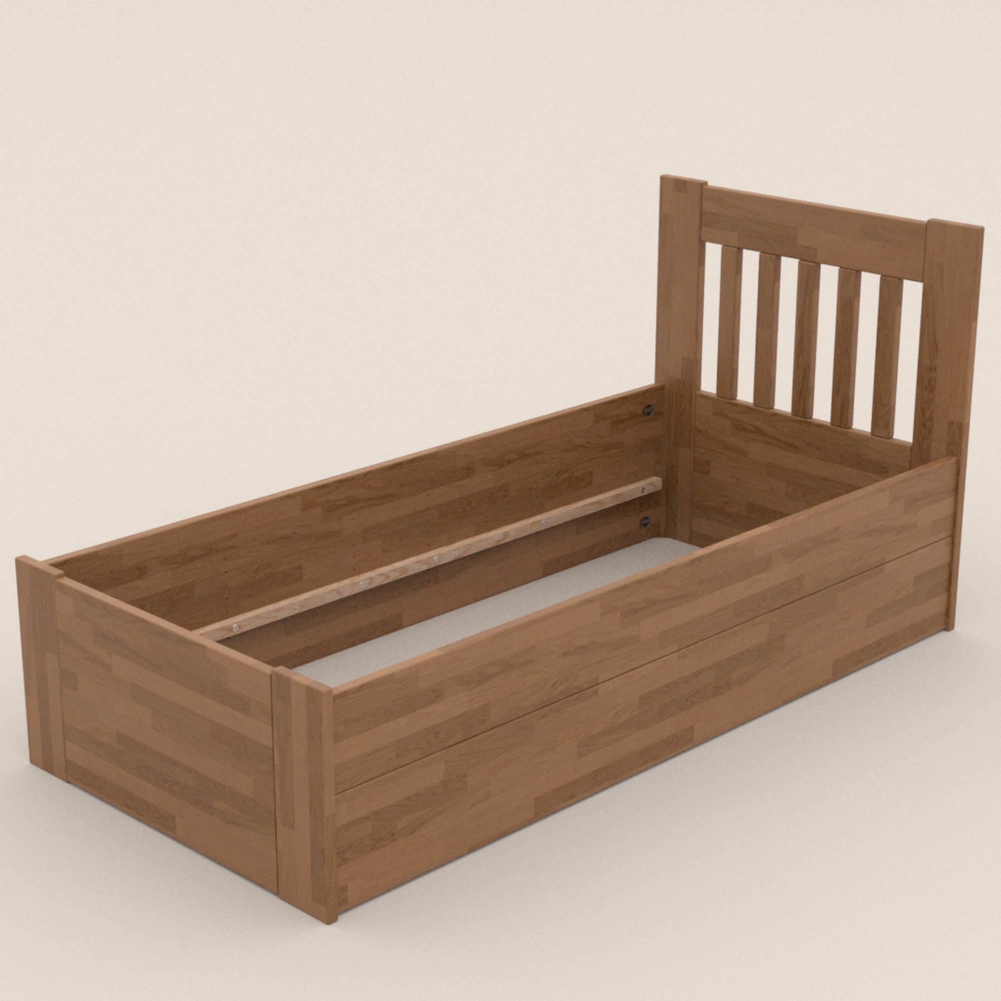 Konštrukcia je vyrobená z kvalitného masívneho dreva, ktoré sa môže pochváliť svojou pevnosťou, odolnosťou, vysokou nosnosťou a dlhou životnosťou. Povrchová olejovaná úprava jeho životnosť ešte predlžuje a tiež zvyšuje odolnosť proti oteru. Vďaka tejto úprave nie sú škrabance toľko vidieť a dajú sa ľahšie odstrániť. Posteľ je dodávaná bez matraca a roštu, ale veríme, že si tie ideálne na skompletizovanie lôžka vyberiete z nášho širokého sortimentu.