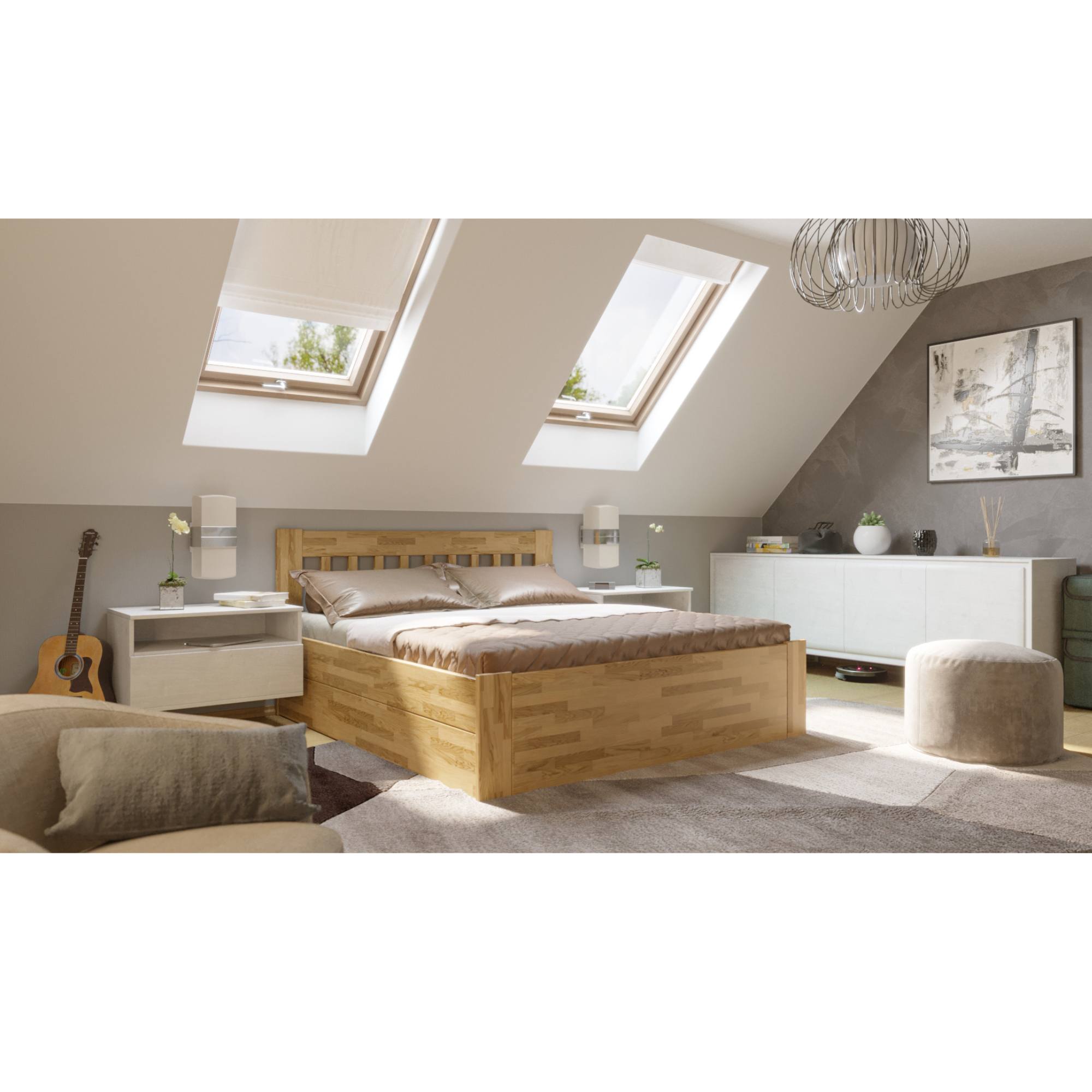 Drevená konštrukcia zaisťuje pevnosť, odolnosť, vysokú nosnosť a dlhšiu životnosť postele. Povrchová olejovaná úprava zvyšuje odolnosť proti oteru. Vďaka nej nie sú škrabance na prvý pohľad viditeľné a dajú sa odstrániť čistením či lokálnou opravou. Matrace a rošt je nutné dokúpiť samostatne, ale veríme, že si tie ideálne pre vás vyberiete z nášho širokého sortimentu.