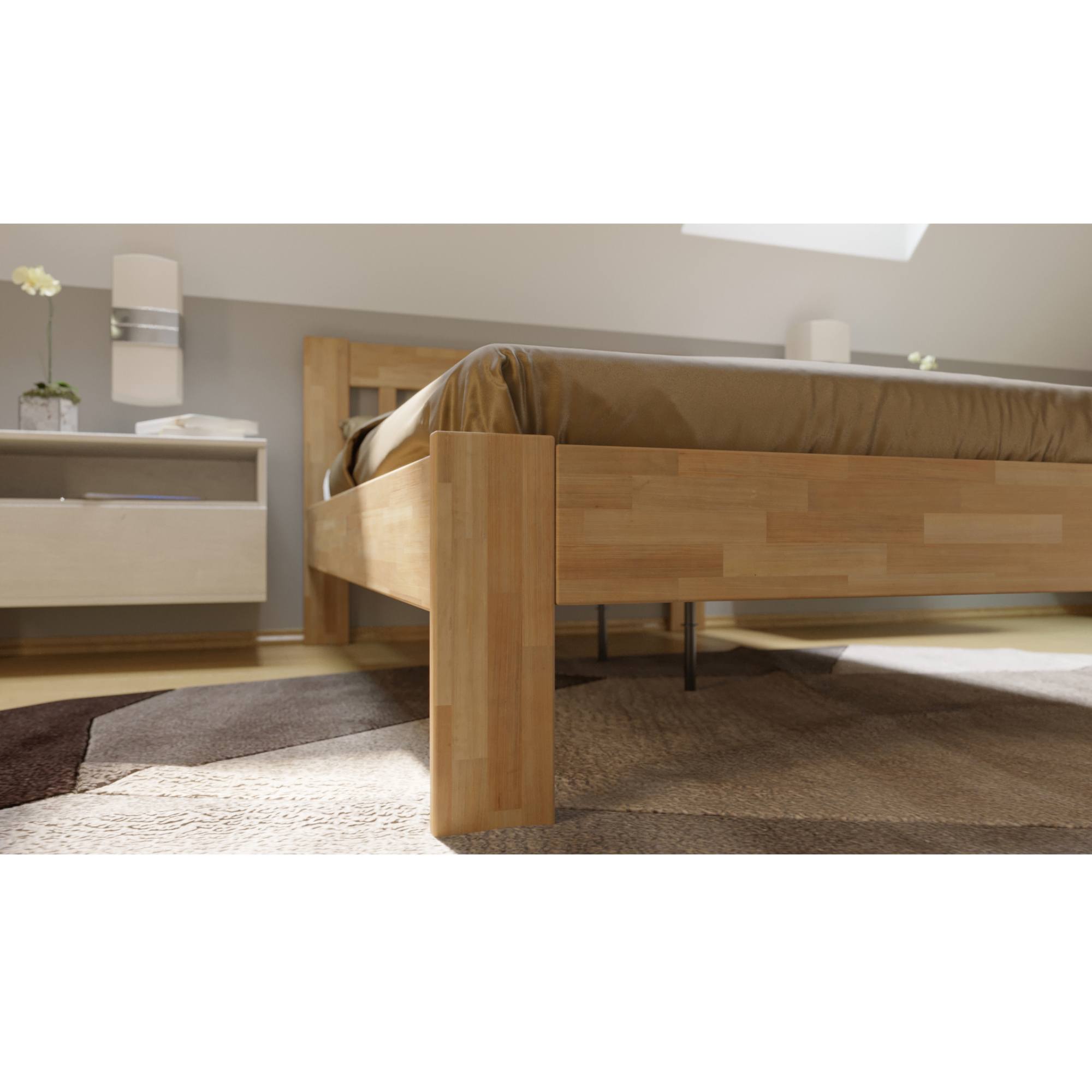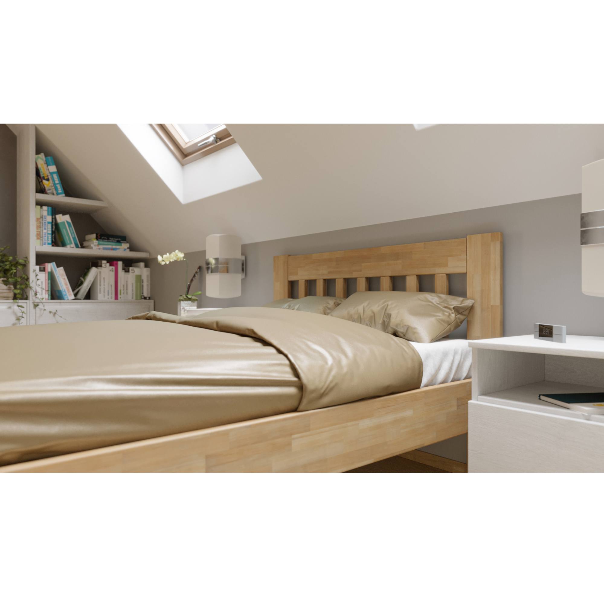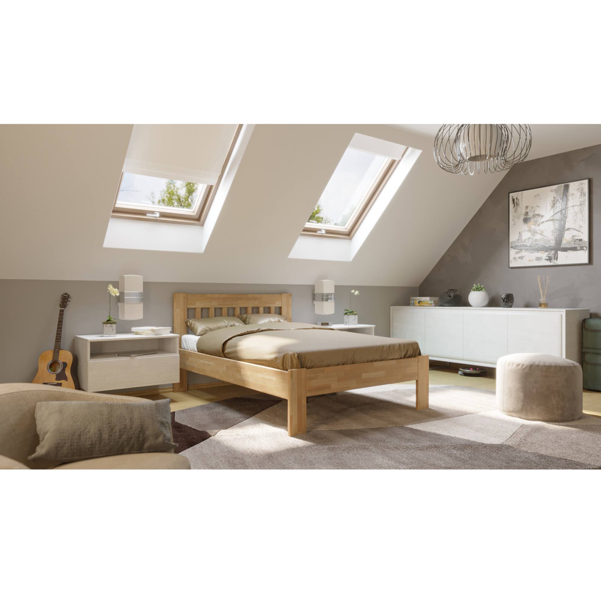 Drevená konštrukcia zaisťuje pevnosť, odolnosť, vysokú nosnosť a dlhšiu životnosť postele. Povrchová olejovaná úprava dodáva na odolnosti proti oteru. Vďaka nej nie sú škrabance na prvý pohľad viditeľné a dajú sa odstrániť čistením či lokálnou opravou. Vysoké, drevené nohy zaisťujú celkovú stabilitu postele a priestor pod ňou môžete ľahko upratať pomocou robotického vysávača. Matrace a rošt je nutné dokúpiť samostatne, ale veríme, že si tie perfektné priamo pre vás vyberiete z nášho širokého sortimentu.