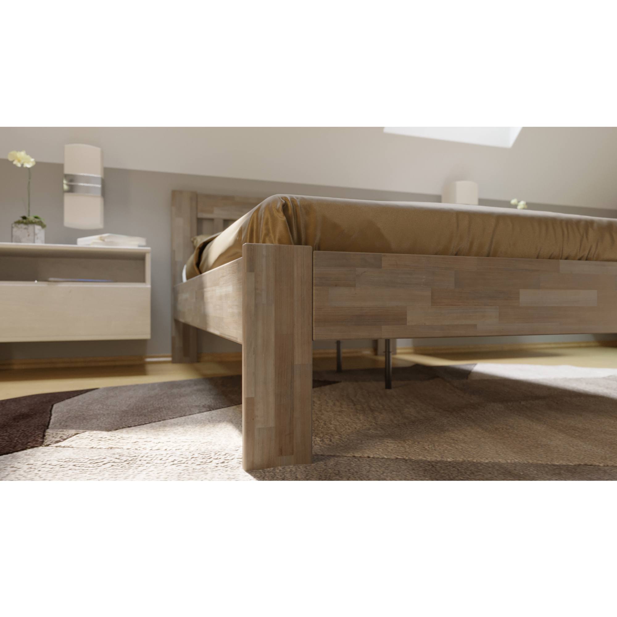 Drevená konštrukcia zaisťuje pevnosť, odolnosť, vysokú nosnosť a dlhšiu životnosť postele. Povrchová olejovaná úprava dodáva na odolnosti proti oteru. Vďaka nej nie sú škrabance na prvý pohľad viditeľné a dajú sa odstrániť čistením či lokálnou opravou. Vysoké, drevené nohy zaisťujú celkovú stabilitu postele a priestor pod ňou môžete ľahko upratať pomocou robotického vysávača. Matrace a rošt je nutné dokúpiť samostatne, ale veríme, že si tie perfektné priamo pre vás vyberiete z nášho širokého sortimentu.