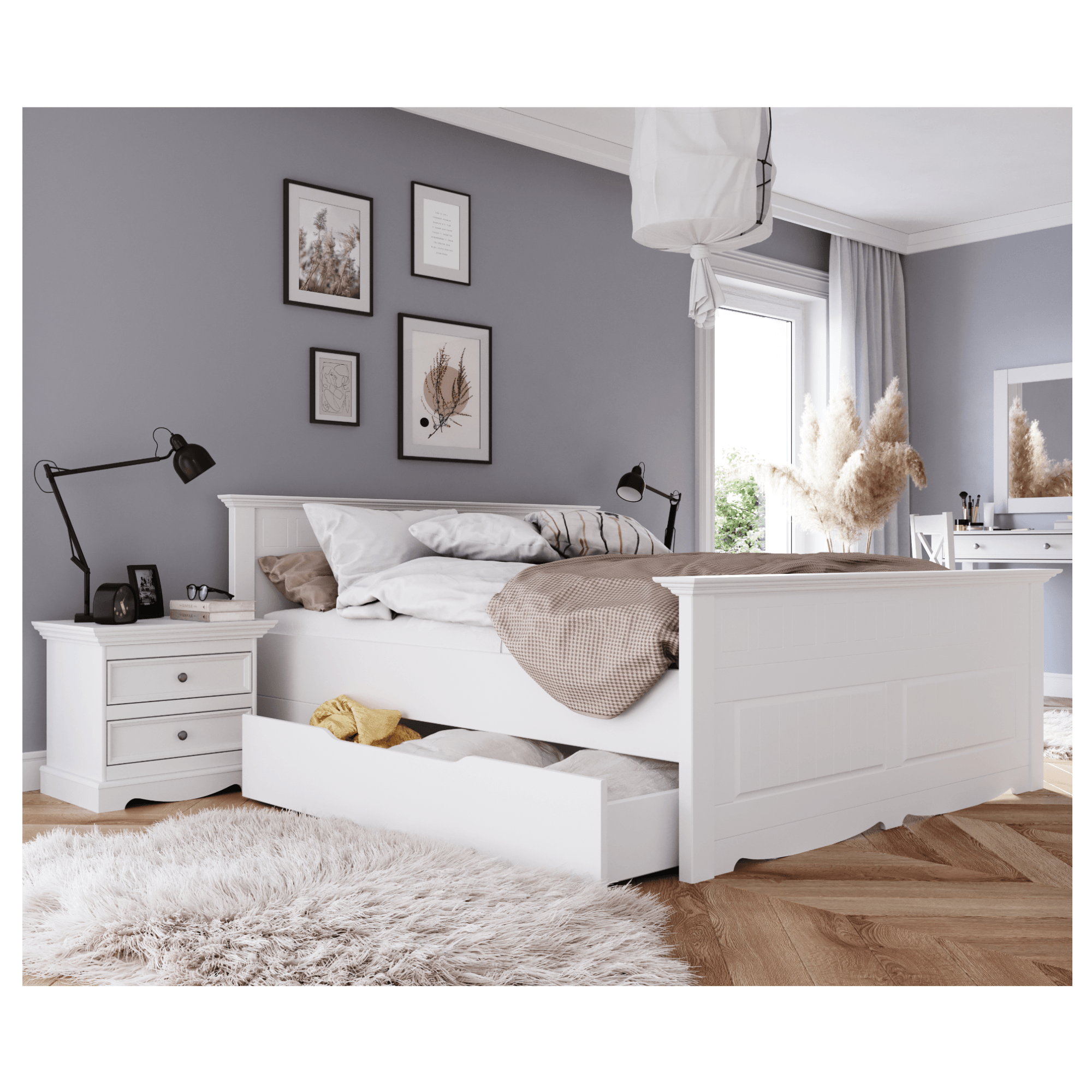 Manželská posteľ BELLU v bielom nadčasovom vyhotovení je ozdobená množstvom ozdobných prvkov ako je dekoratívne frézovanie alebo ozdobné pilastre. Vďaka týmto detailom nábytok pôsobí zaujímavým, romantickým dojmom. Vzhľadom na jej čistý vzhľad ju ľahko skombinujete s ďalším vybavením spálne.