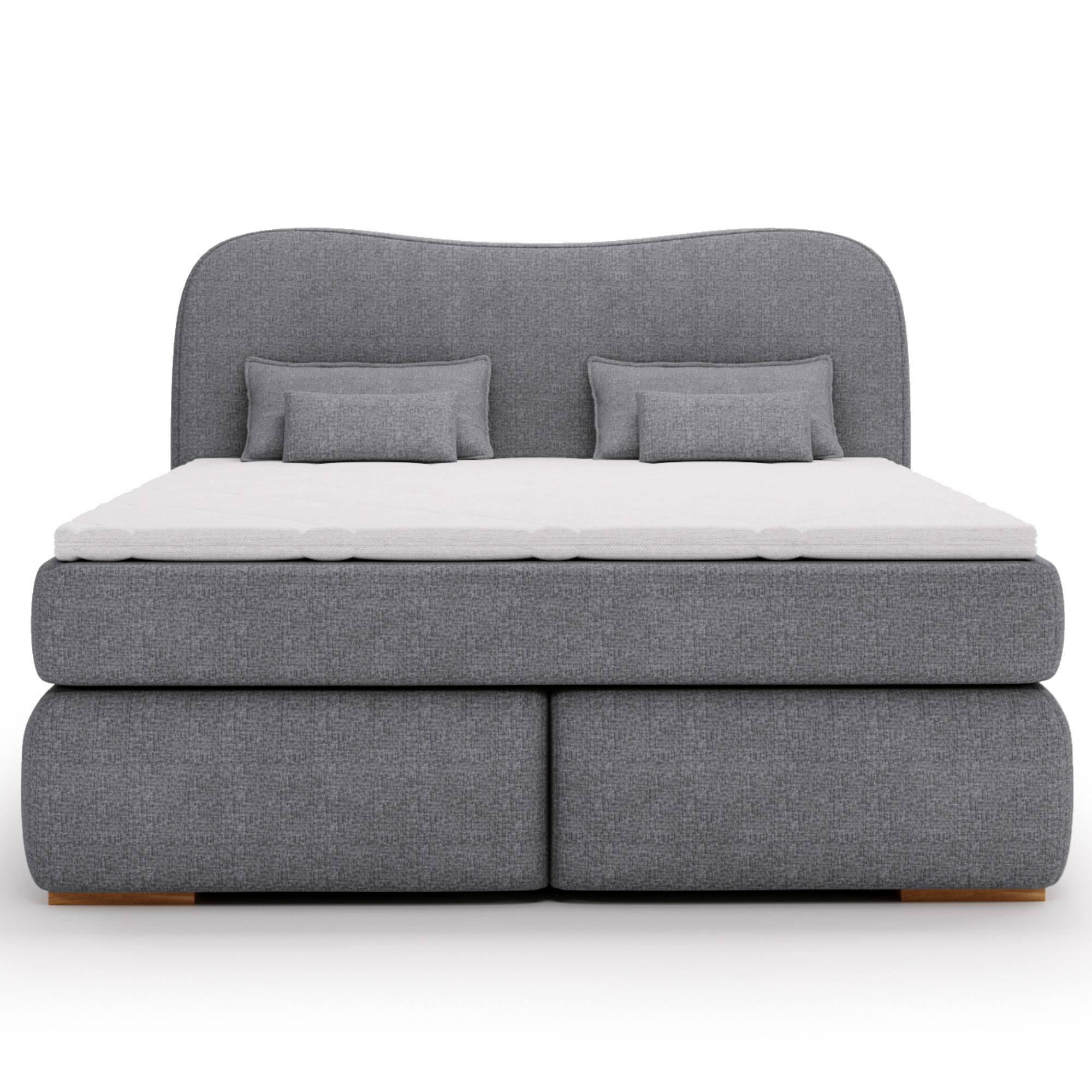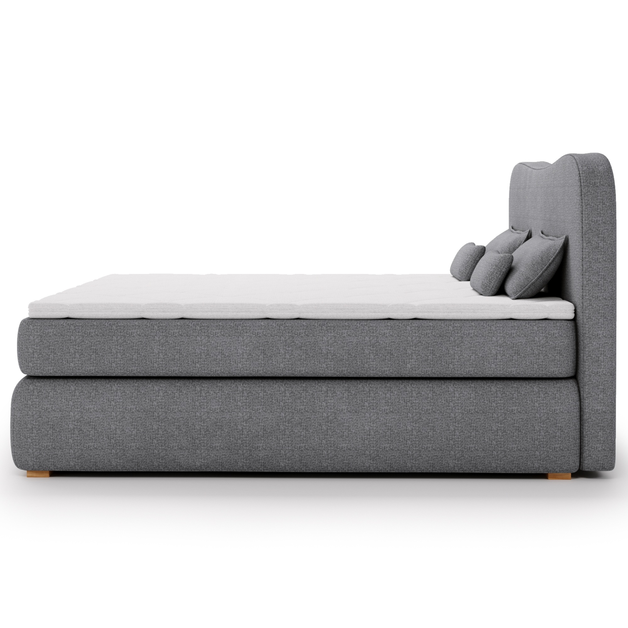 Dvojlôžková boxspring posteľ ISLA COMFORT so zaobleným čelom je potiahnutá jemnou tkaninou v tlmenom farebnom vyhotovení.