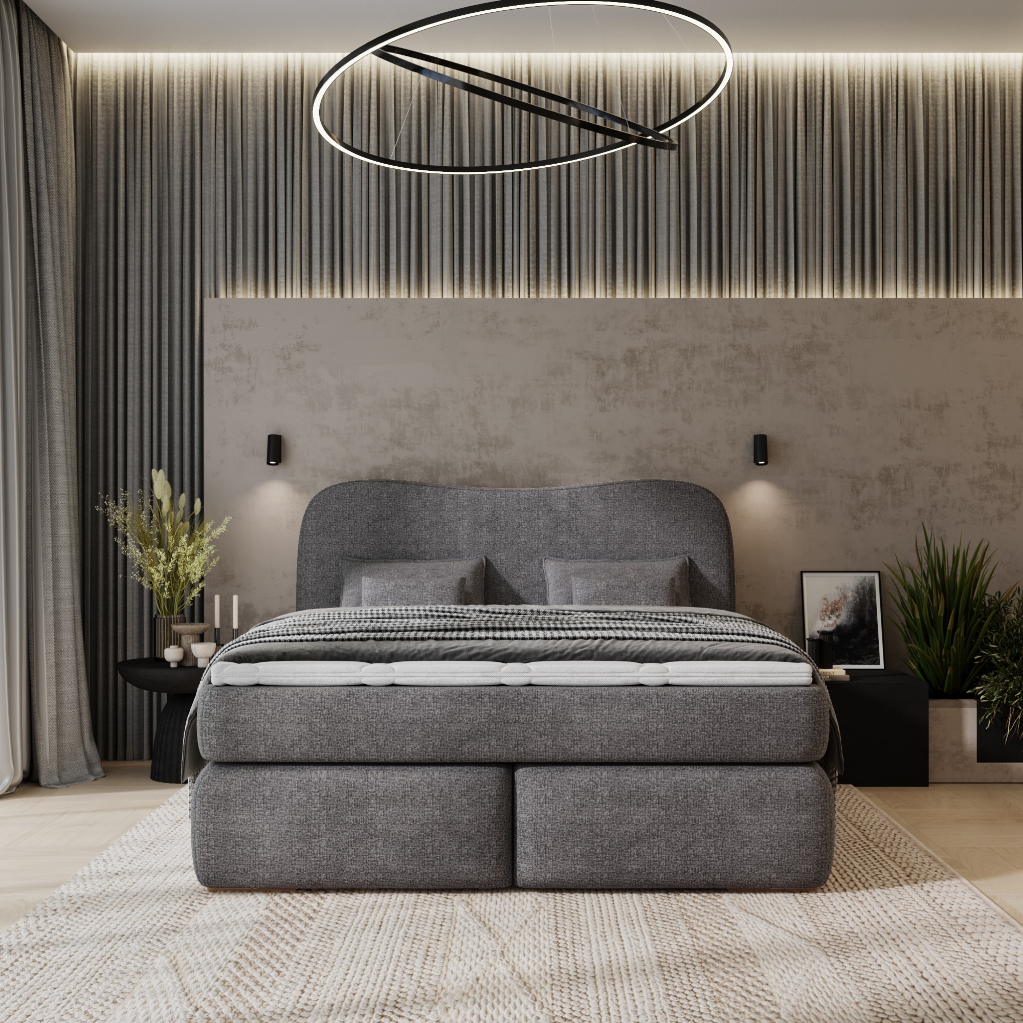 Dvojlôžková boxspring posteľ ISLA COMFORT so zaobleným čelom je potiahnutá jemnou tkaninou v tlmenom farebnom vyhotovení.