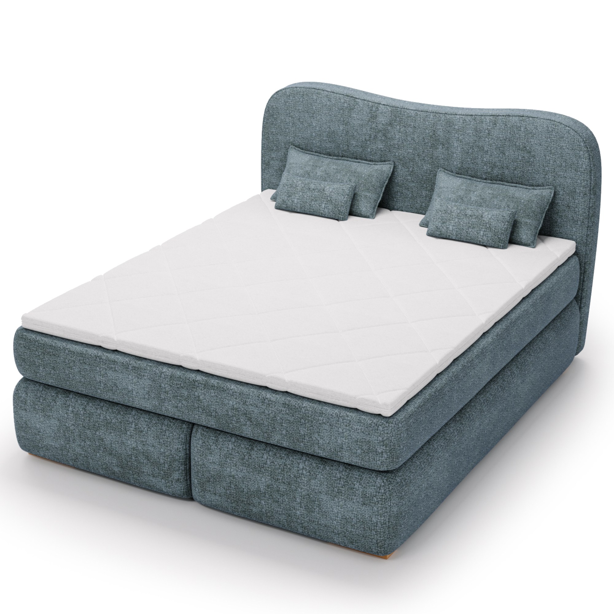 Dvojlôžková boxspring posteľ ISLA COMFORT so zaobleným čelom je potiahnutá jemnou tkaninou v tlmenom farebnom vyhotovení.