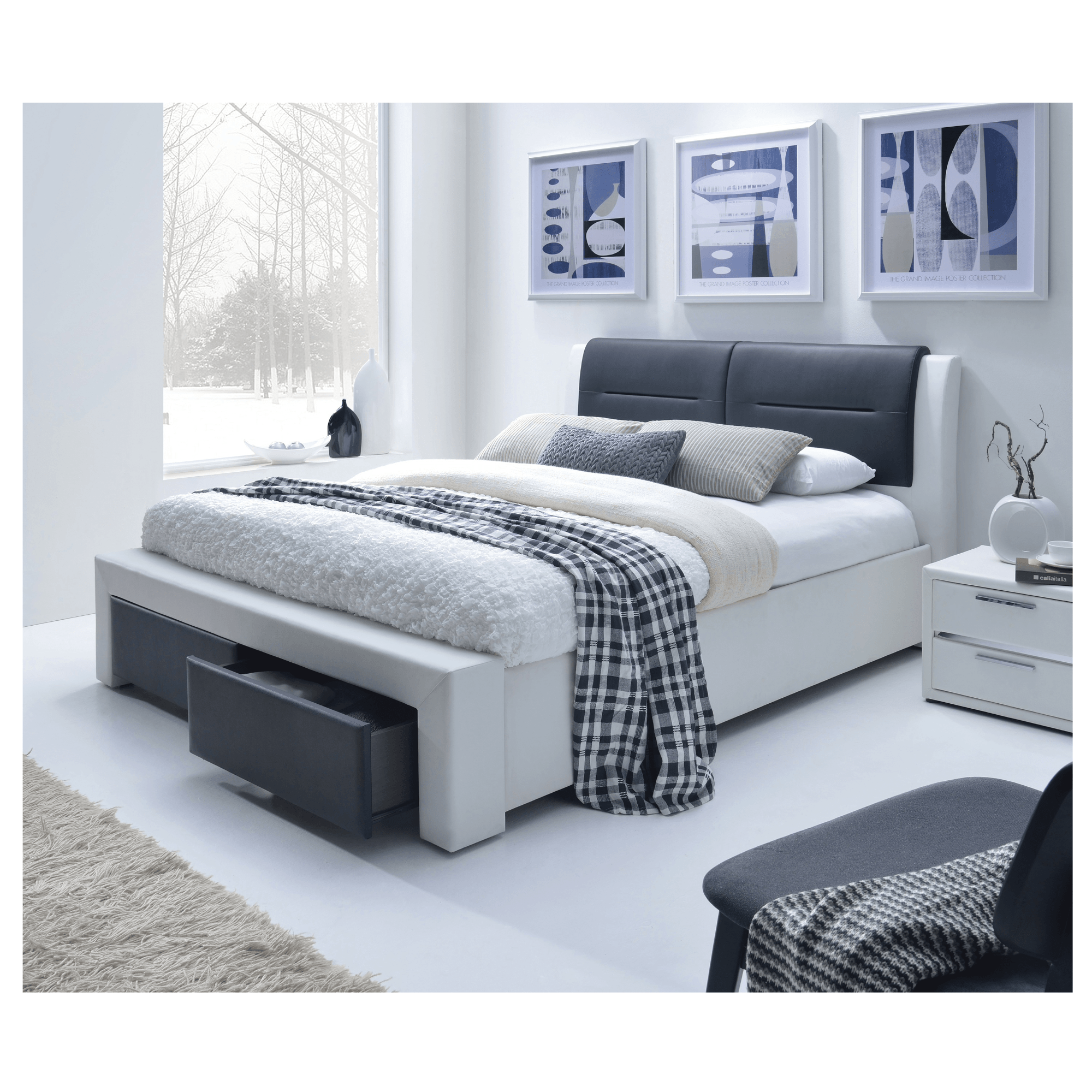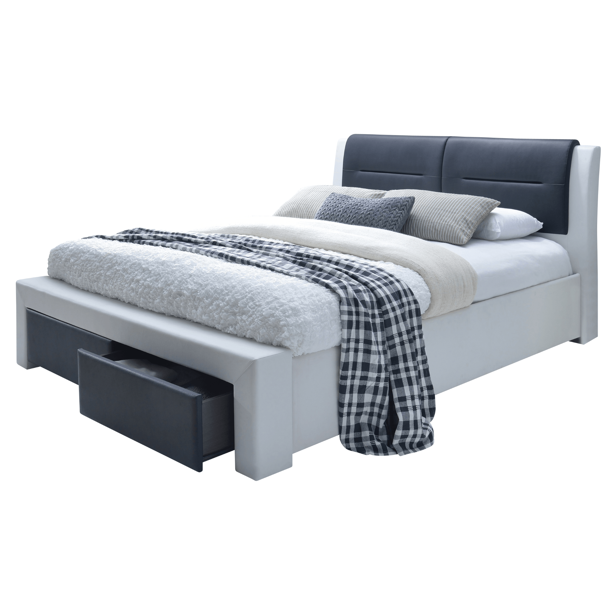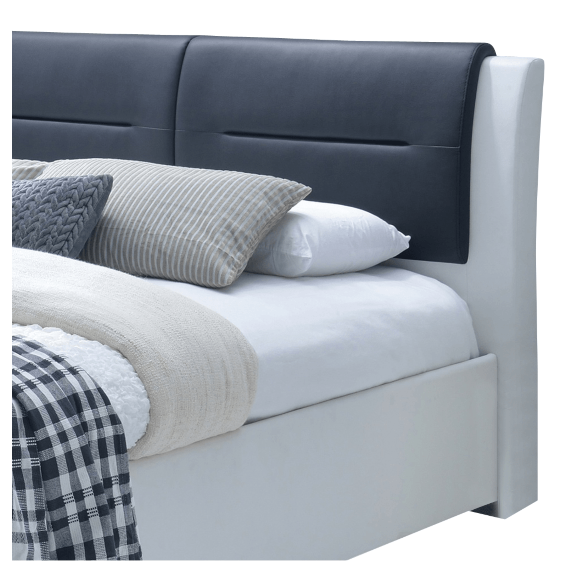 Pevná a stabilná konštrukcia je čalúnená syntetickou kožou v bieločiernej farebnej kombinácii. Povrch je tak ľahko udržiavateľný, pretože ho v prípade znečistenia stačí ľahko umyť. Najvýraznejším prvkom je kontrastné, vysoké čelo s decentným prešívaním. Čelo zaistí dokonalú oporu počas večerného relaxu a zároveň ochráni stenu za posteľou pred odretím či ušpinením. V prednej časti postele sa nachádzajú 2 integrované posteľové zásuvky, ktoré zaisťujú dostatok úložného priestoru. Posteľ je dodávaná vrátane lamelového roštu, ktorý zvyšuje komfort počas spánku. Matrac je nutné dokúpiť zvlášť, ale veríme, že si ten perfektný vyberiete z našej širokej ponuky.