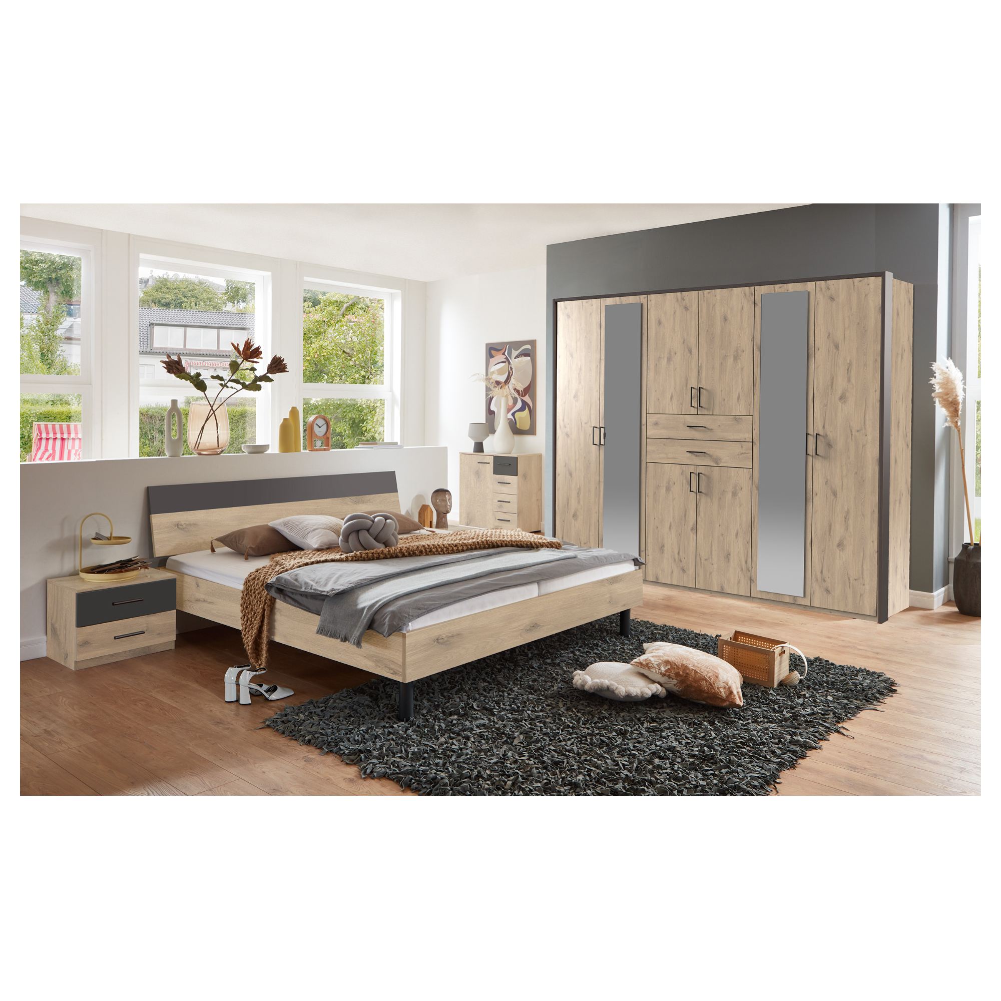 Moderná manželská posteľ DEANNA v neutrálnom farebnom vyhotovení v kombinácii s prírodným dubovým dekorom dodá vašej spálni hrejivý, útulný nádych.