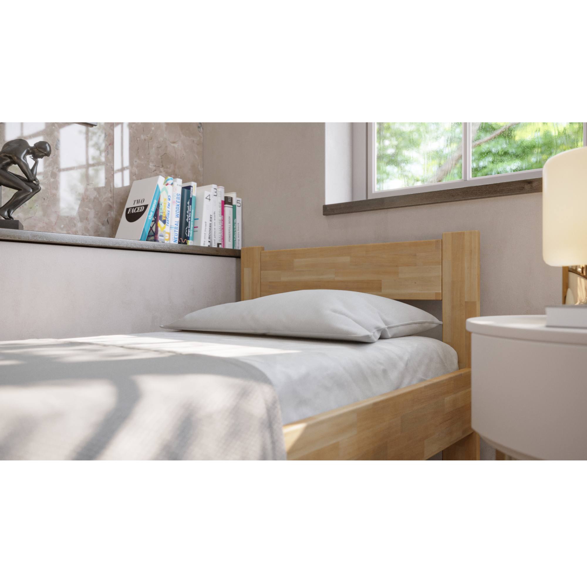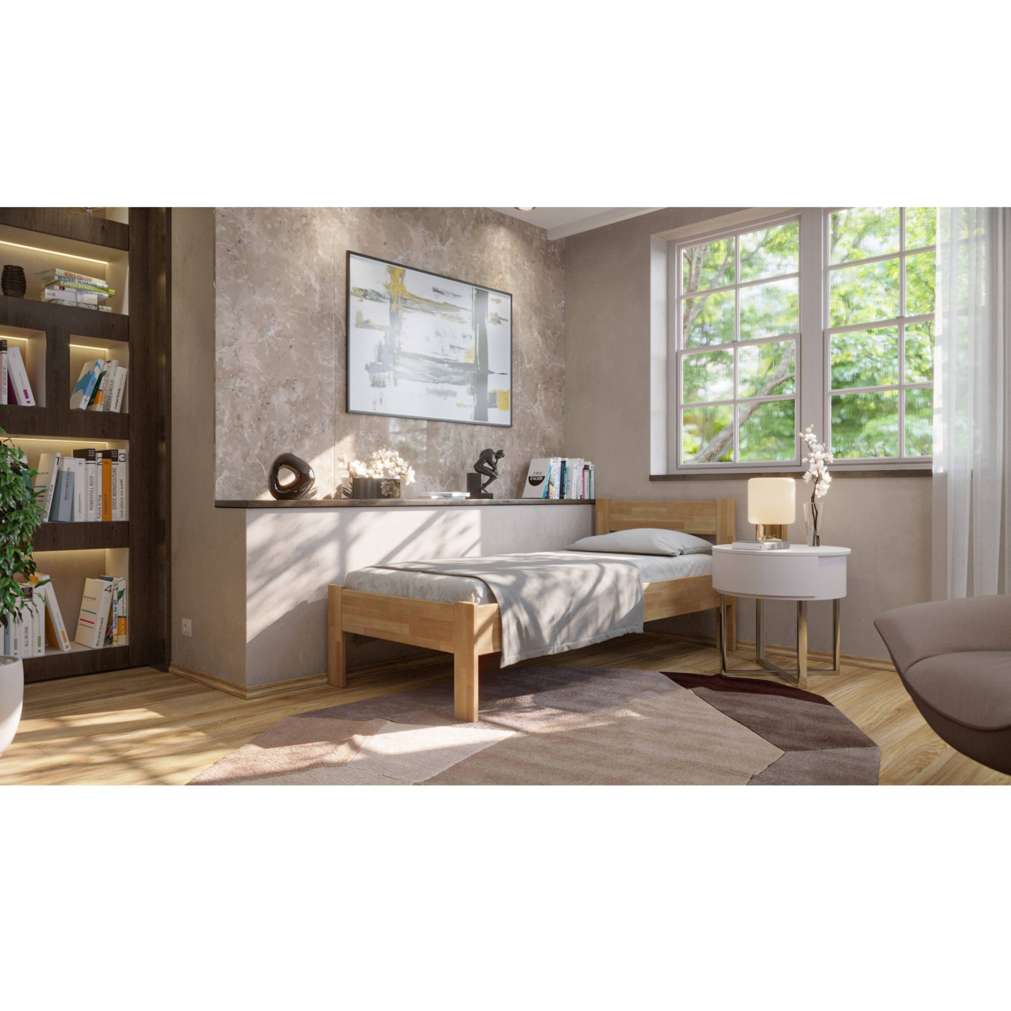 Odolná konštrukcia z bukového masívu je pevná, má vysokú nosnosť a dlhú životnosť.** Olejovaná povrchová úprava** jeho životnosť ešte predlžuje a dodáva mu odolnosť proti povrchovým oterom. Vyššie čelo vám poskytne ideálnu oporu počas čítania obľúbenej knihy či sledovania seriálu. Celkovú stabilitu postele zaisťuje štvorica pevných drevených nôh, ktoré zároveň umožňujú ľahké upratovanie pod posteľou. Posteľ je dodávaná bez matraca a roštu, ale veríme, že si tie ideálne vyberiete z nášho širokého sortimentu.