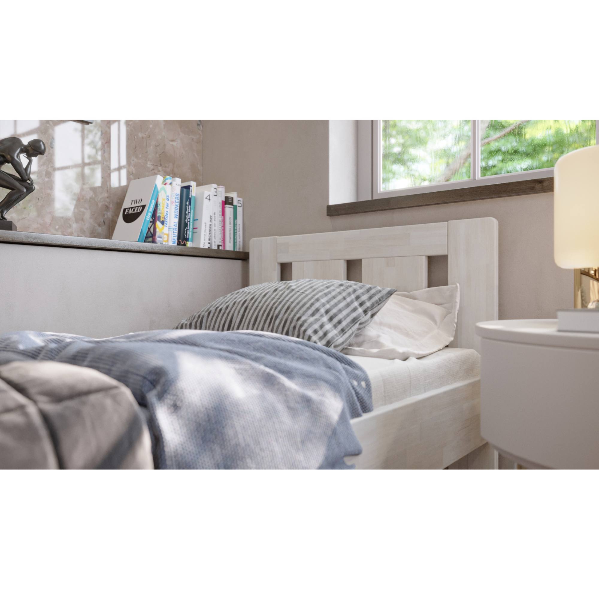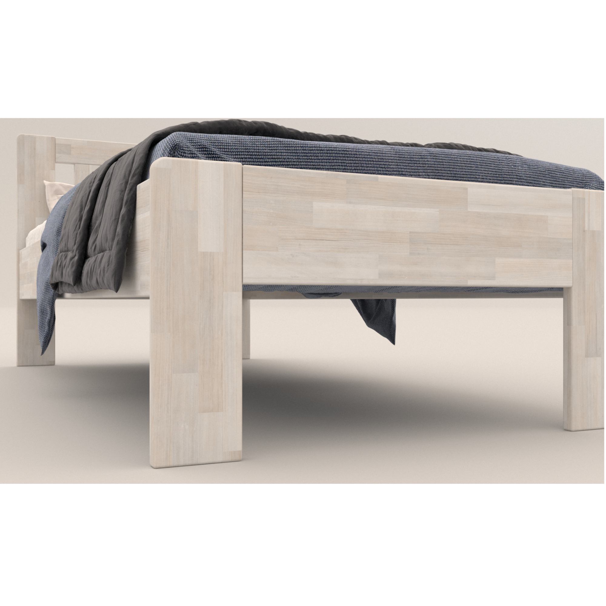 - Doplňujúca poznámka: Maximálna nosnosť celej postele je 130 kg. Posteľ z bukového masívneho dreva je morená do bieleho odtieňa.