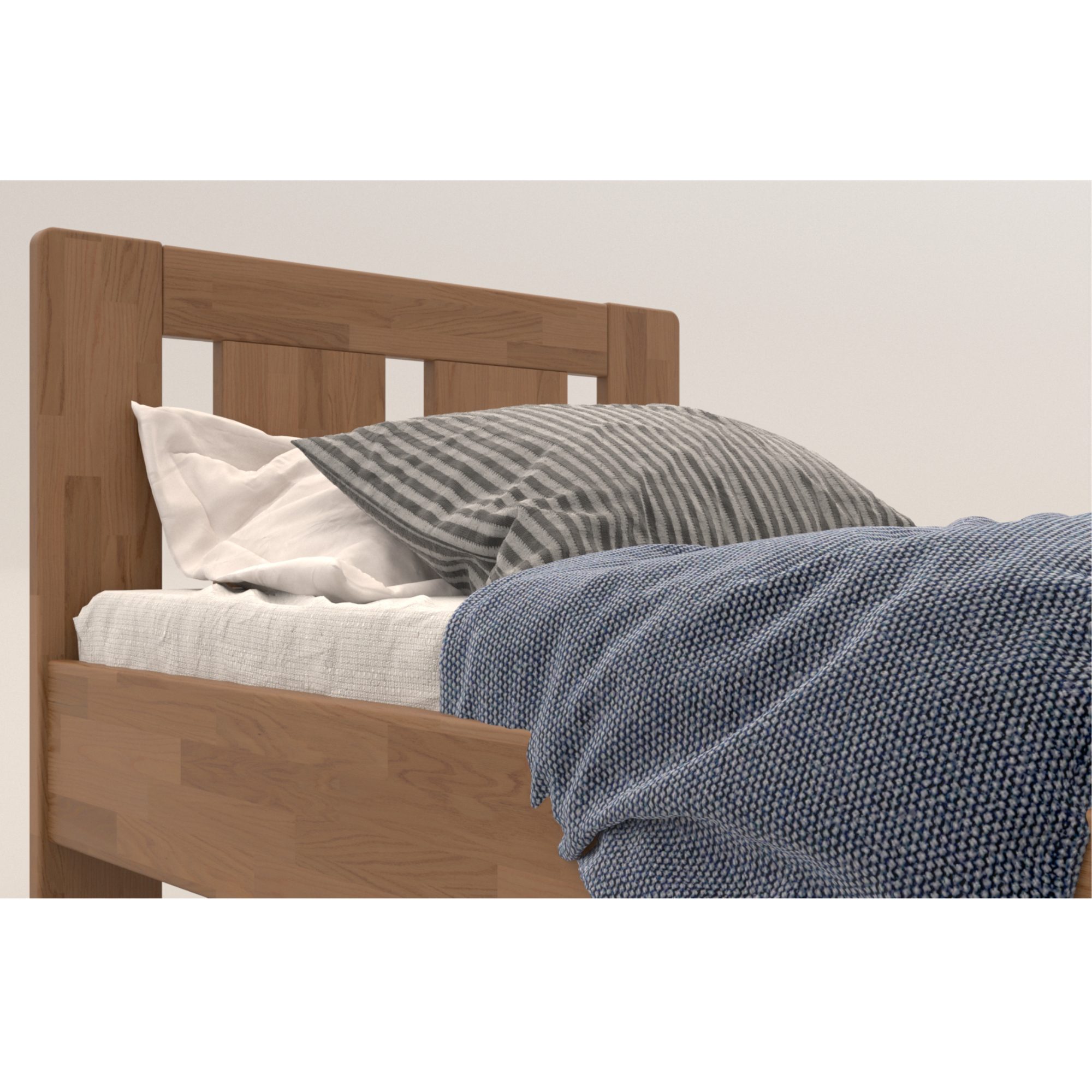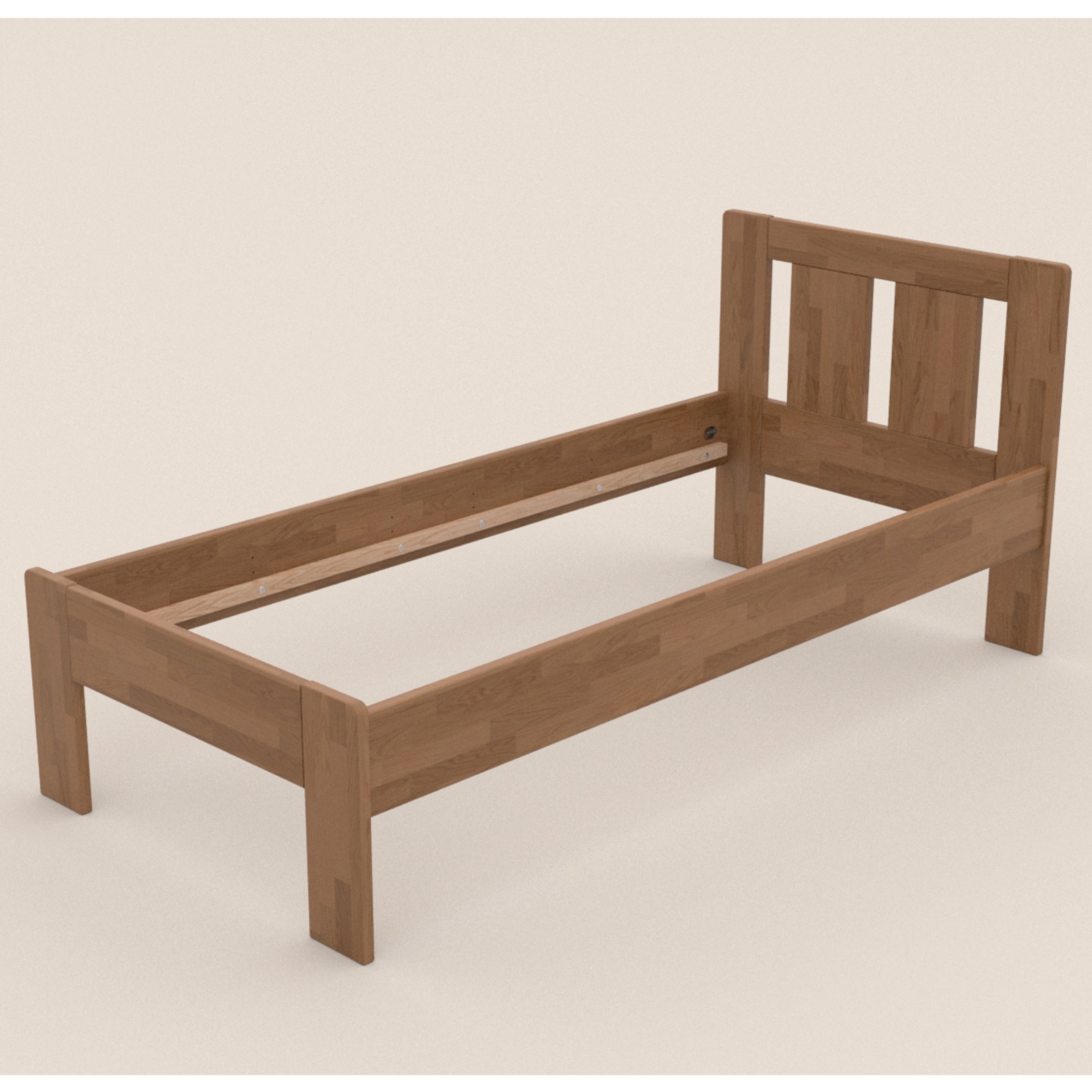 Konštrukcia je vyrobená z masívneho bukového či dubového dreva, záleží len na vás, aký typ dreva si vyberiete. Drevo sa môže pochváliť svojou pevnosťou, odolnosťou, vysokou nosnosťou a dlhou životnosťou. Povrchová olejovaná úprava jeho životnosť ešte predlžuje a tiež zvyšuje odolnosť proti oteru. Vďaka tejto úprave nie sú škrabance toľko vidieť a dajú sa ľahšie odstrániť. Pod posteľou sa vám bude ľahko upratovať vďaka vysokým, pevným nohám. Posteľ je dodávaná bez matraca a roštu, ale veríme, že si tie ideálne na skompletizovanie lôžka vyberiete z nášho širokého sortimentu.