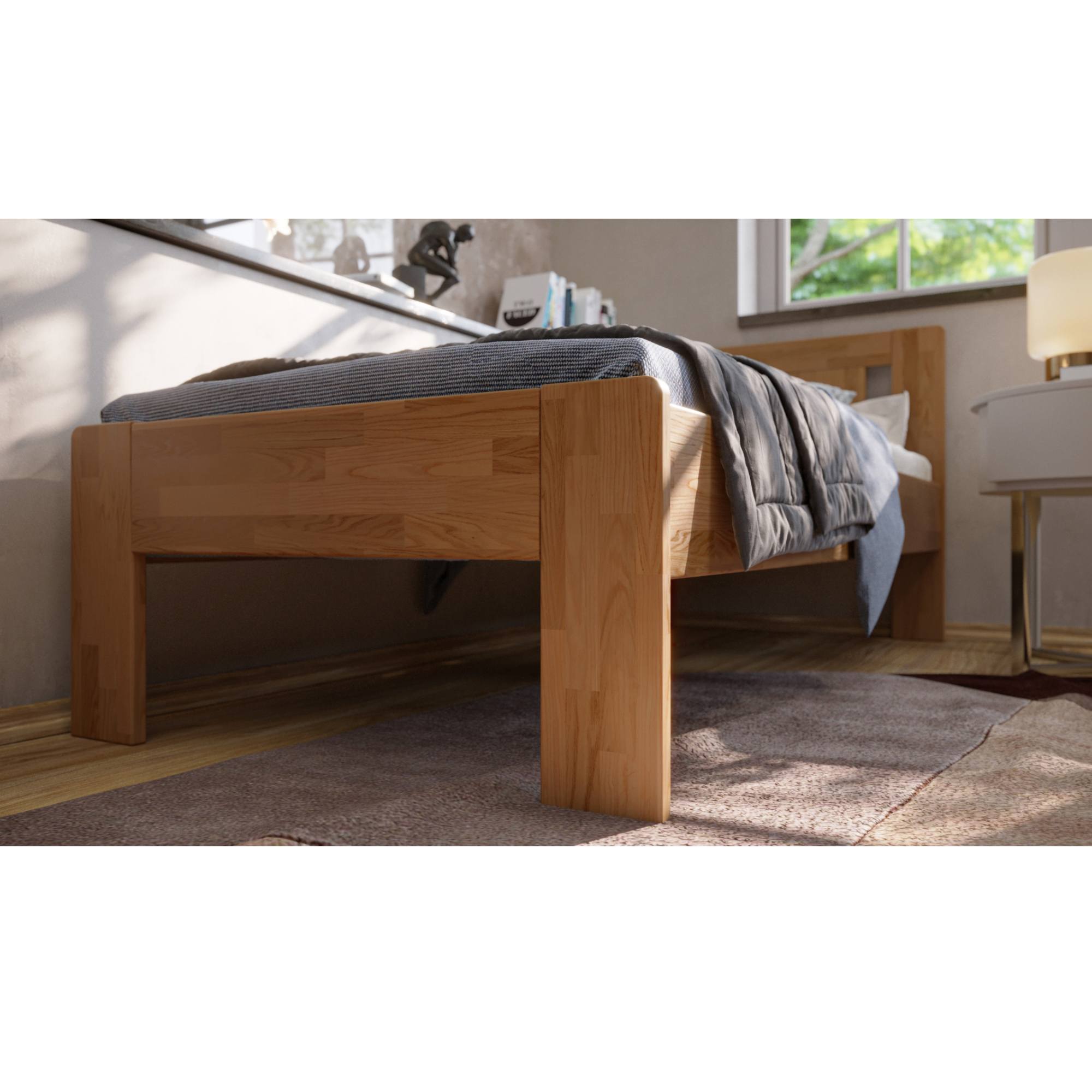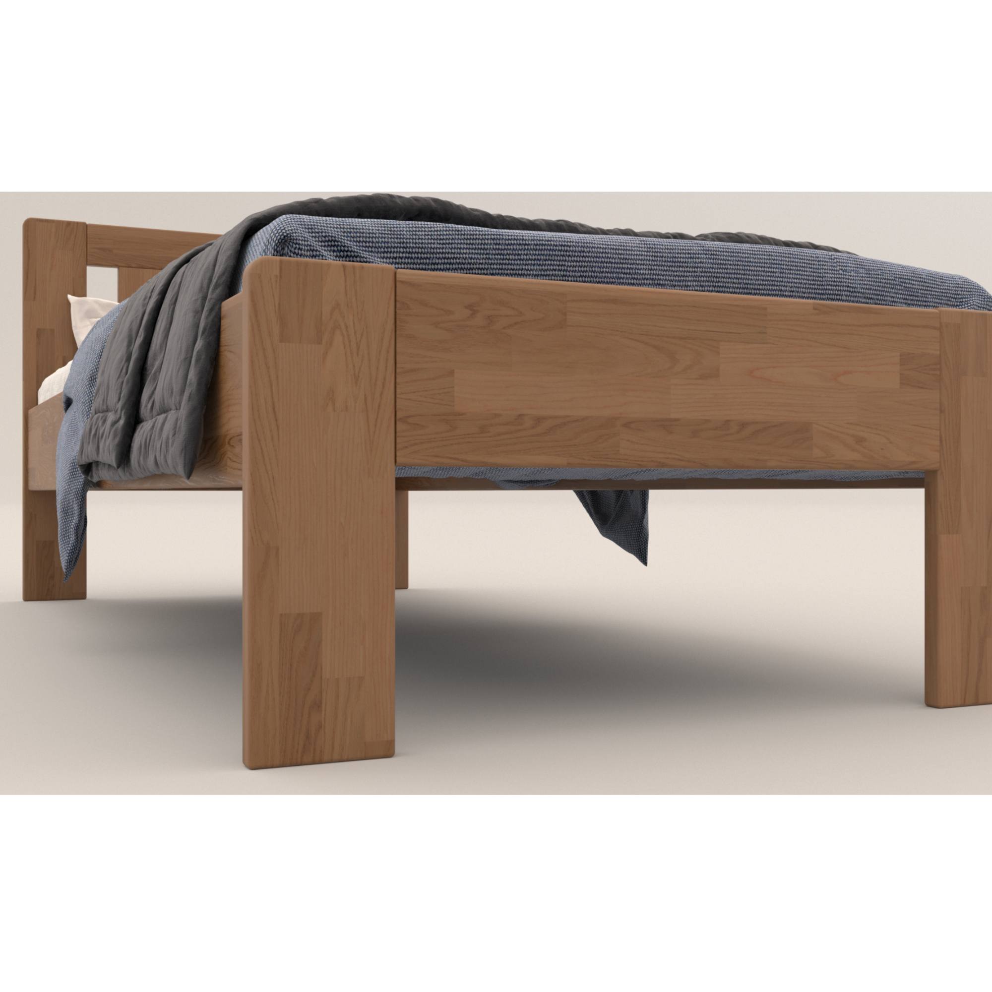 Konštrukcia je vyrobená z masívneho bukového či dubového dreva, záleží len na vás, aký typ dreva si vyberiete. Drevo sa môže pochváliť svojou pevnosťou, odolnosťou, vysokou nosnosťou a dlhou životnosťou. Povrchová olejovaná úprava jeho životnosť ešte predlžuje a tiež zvyšuje odolnosť proti oteru. Vďaka tejto úprave nie sú škrabance toľko vidieť a dajú sa ľahšie odstrániť. Pod posteľou sa vám bude ľahko upratovať vďaka vysokým, pevným nohám. Posteľ je dodávaná bez matraca a roštu, ale veríme, že si tie ideálne na skompletizovanie lôžka vyberiete z nášho širokého sortimentu.