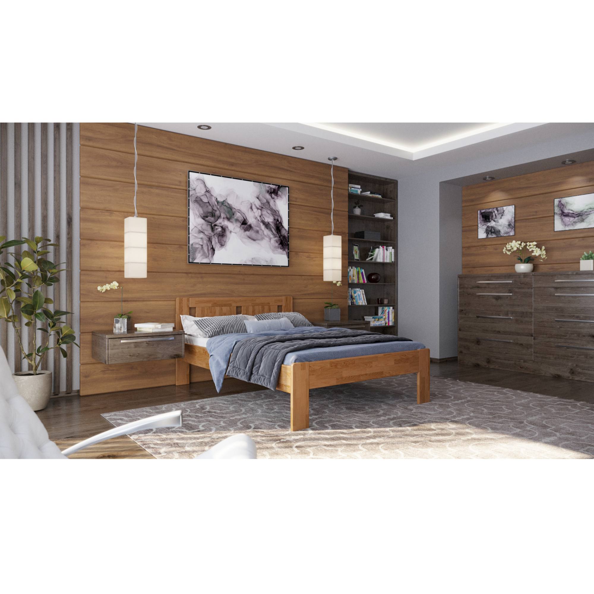 - Doplňujúca poznámka: Posteľ z dubového masívneho dreva je morená do odtieňa svetlý orech. Nosnosť 195 kg na lôžko.