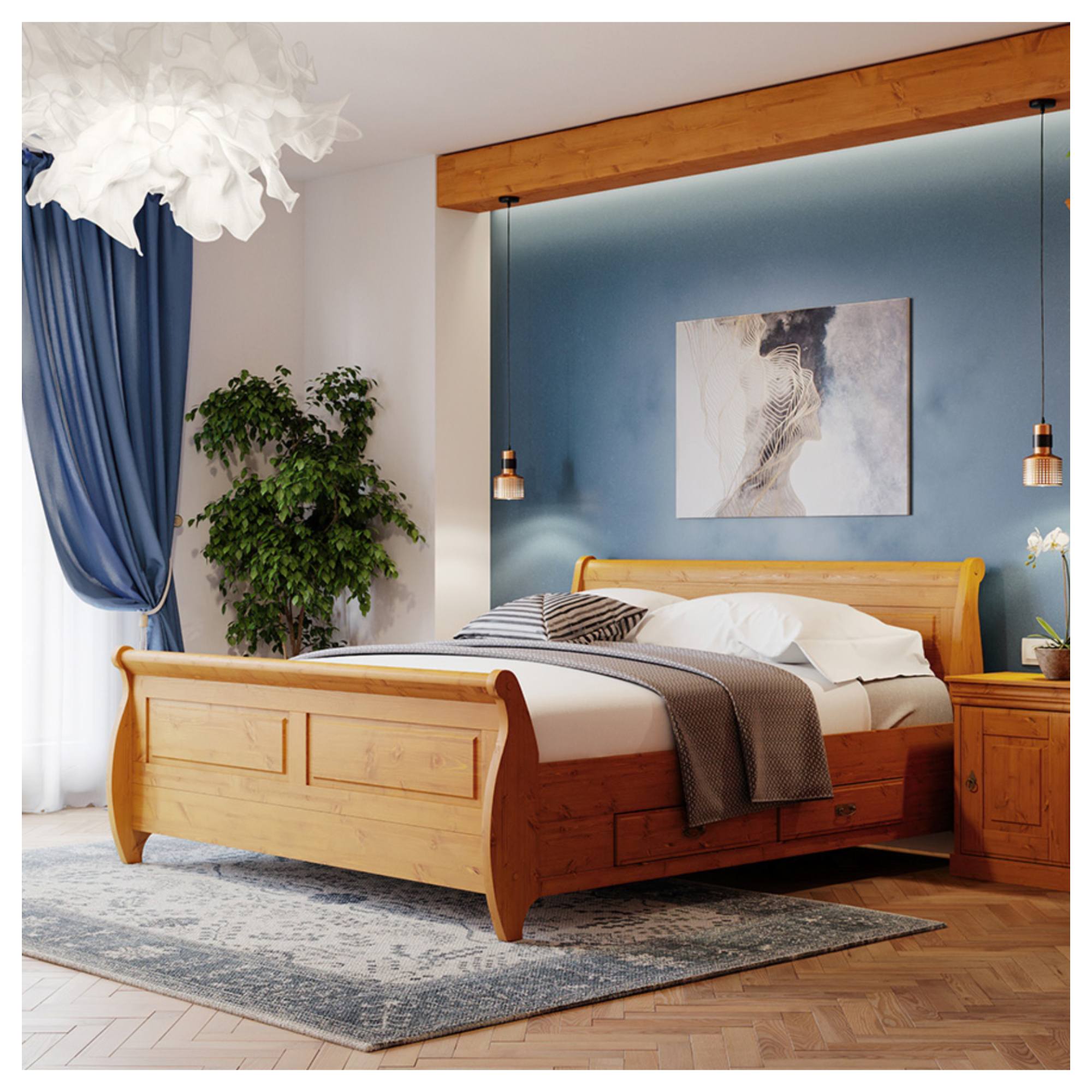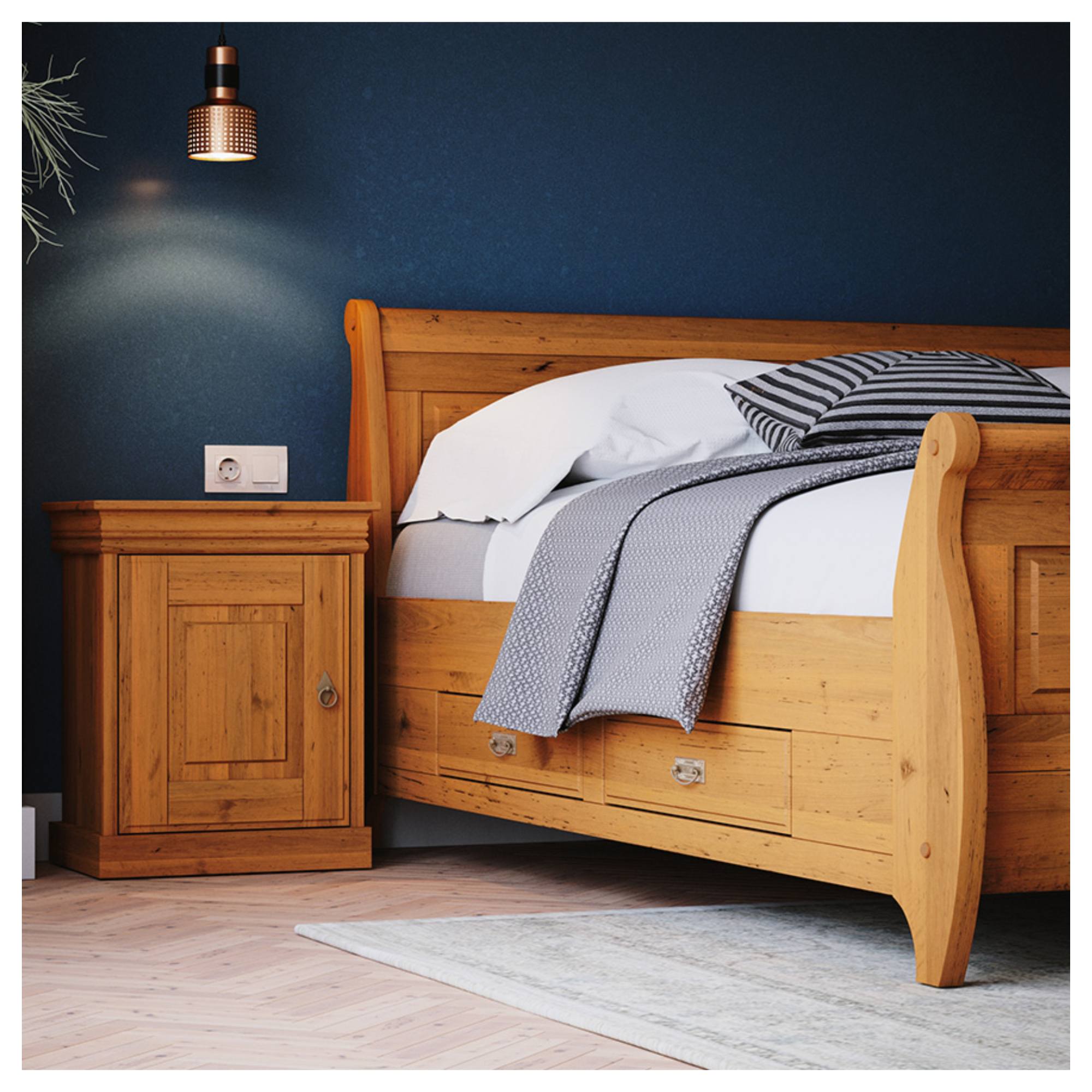 - Doplňujúca poznámka: Posteľ je vyrobená z masívneho dreva fínskej borovice a morená do dekora medovej borovice.