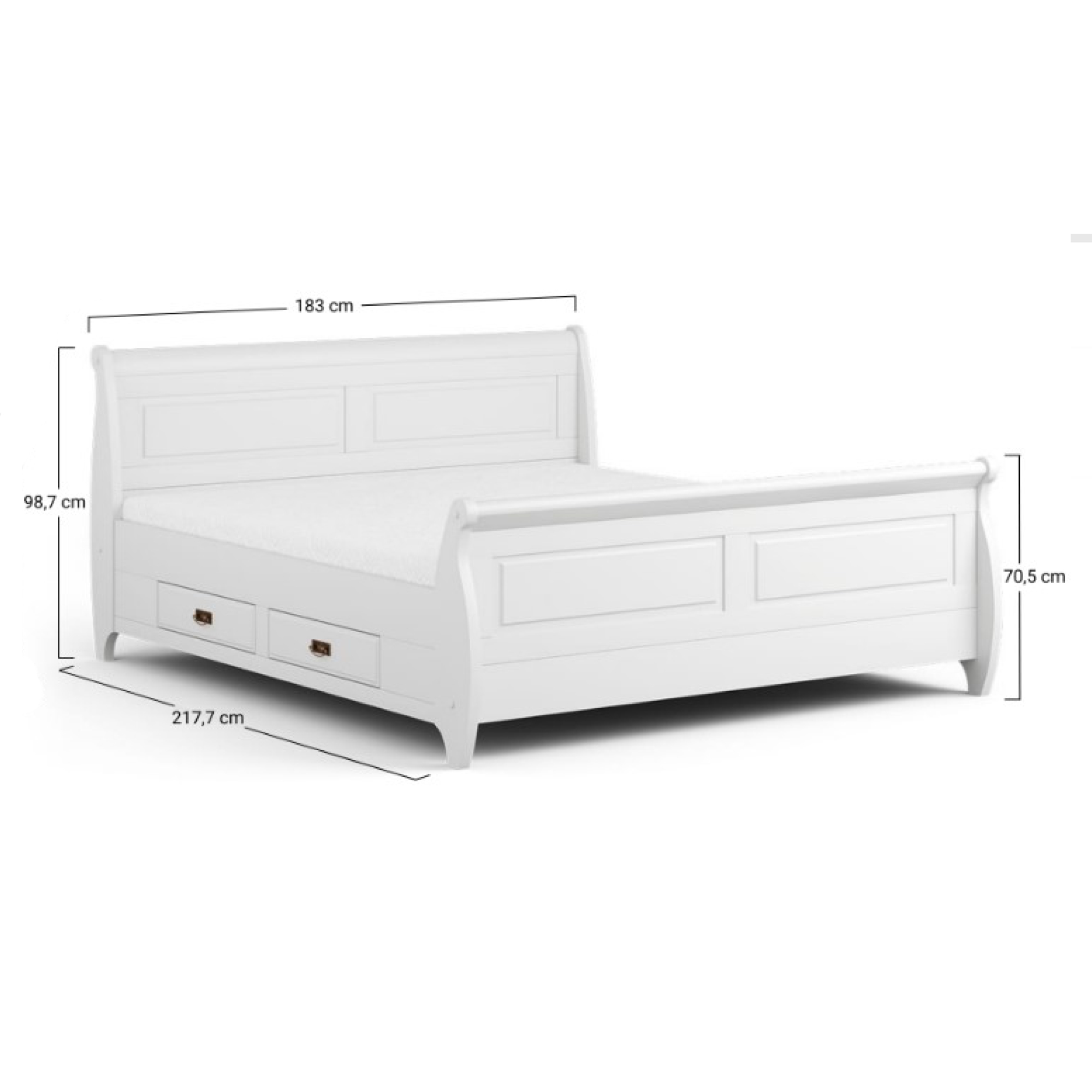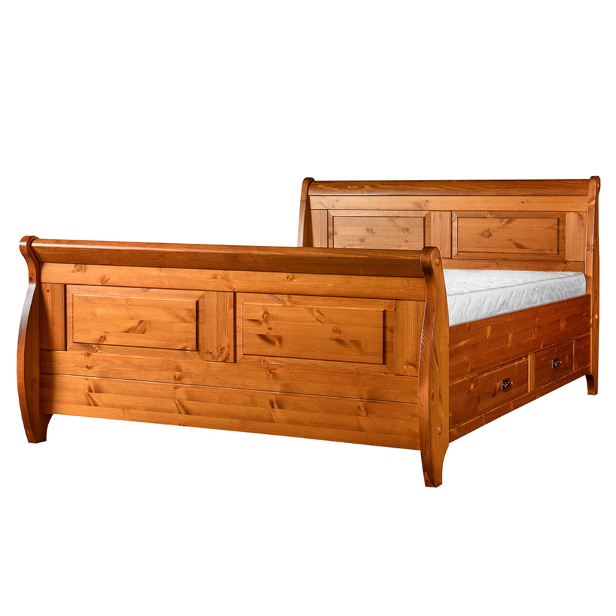 Vyrobená je z masívneho borovicového dreva, ktoré nábytku dodáva potrebnú pevnosť, odolnosť a predlžuje jeho životnosť. Pohodlné opretie si môžete dopriať vďaka vysokému čelu, ktoré je rovnako ako čelo na nohách doplnené o dekoratívne frézovanie. Na uloženie aktuálne nepoužívaných predmetov môžete využiť praktické posteľné zásuvky s kovovými rúčkami. Posteľ podopierajú netradične riešené nohy zvýrazňujúce celkový romantický vzhľad.