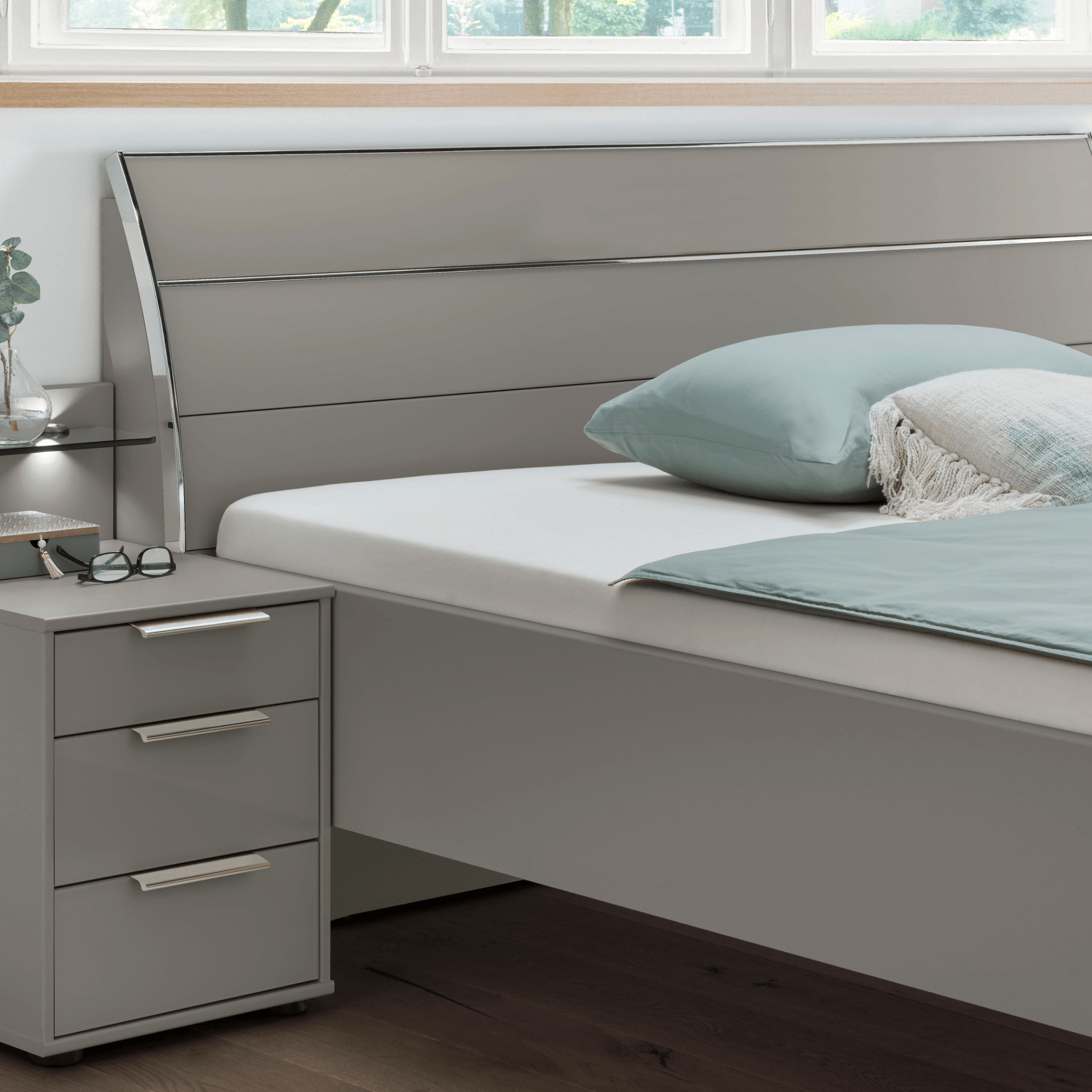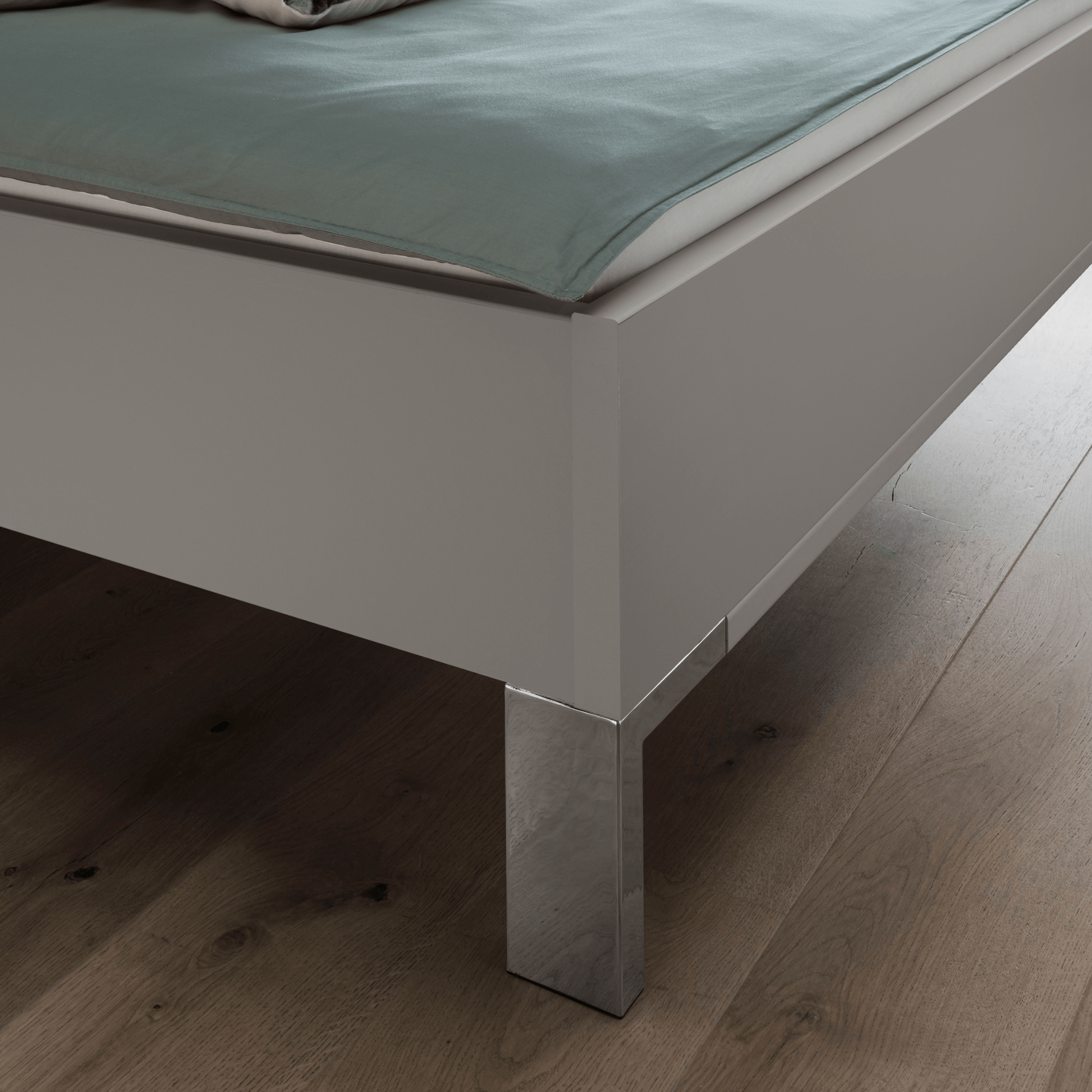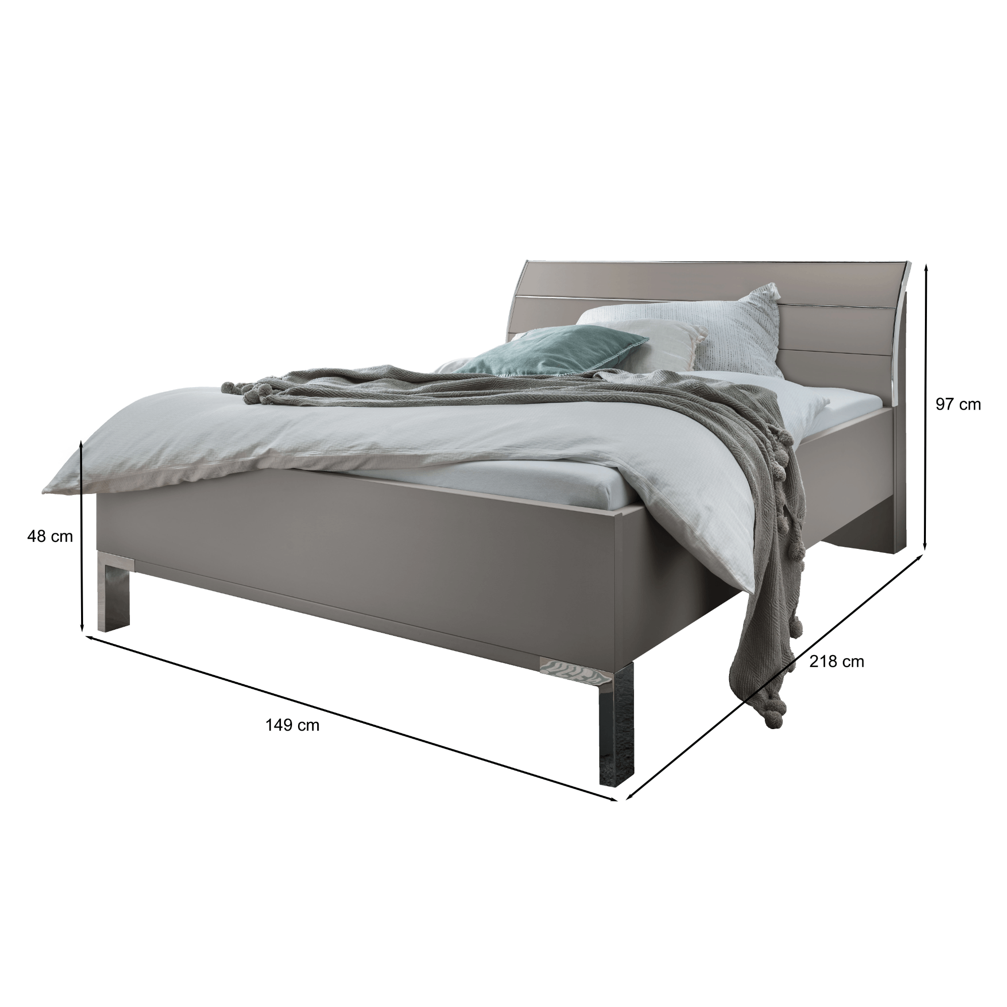 Posteľ je vyrobená z laminovaného dreveného materiálu vo vyhotovení so striebornými chrómovými lištami, ktoré zaujímavo dopĺňajú jej futuristický vzhľad. Doplnená je o výrazné, prehnuté čelo na pohodlnejšie opretie počas odpočinku po náročnom dni. *Výšku lôžka je možné variabilne nastaviť**. Posteľ je dodávaná bez roštu a matraca, ale určite si vyberiete z našej širokej ponuky a zostavíte si perfektné lôžko presne podľa vášho vkusu a potrieb.