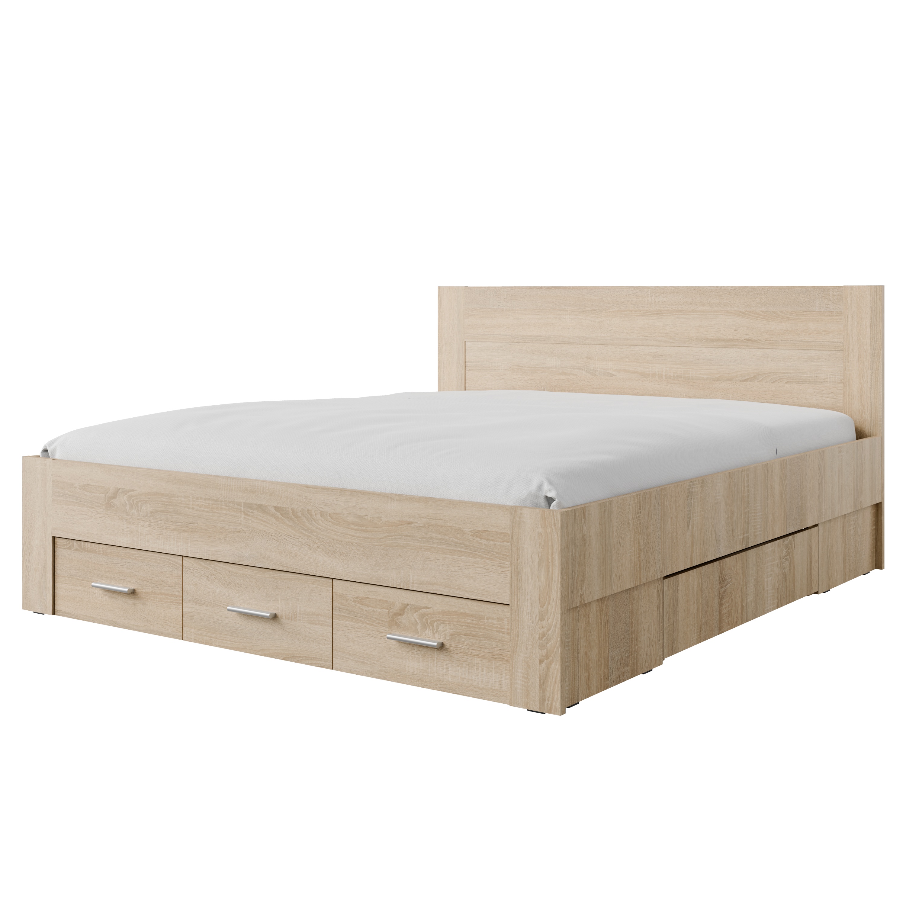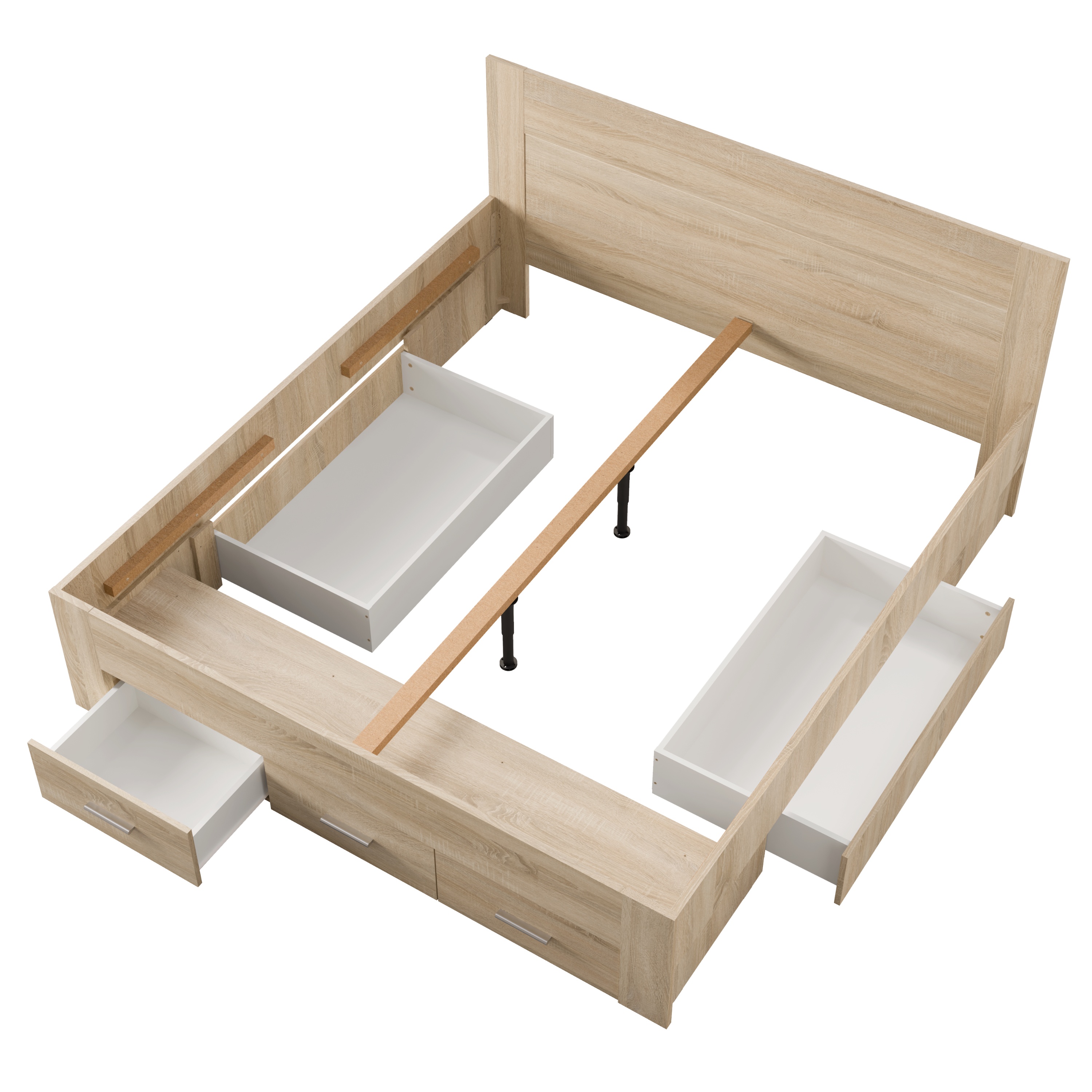 Veľkou prednosťou tejto postele je integrovaný úložný priestor v podobe zásuviek na kolieskach, pričom z každej strany je k dispozícii 1 zásuvka a z čela postele ďalšie 3. Tieto zásuvky umožňujú jednoduché uloženie lôžkovín, sezónneho oblečenia alebo ďalších vecí, ktoré chcete mať poruke, ale zároveň prehľadne upratané. Stredový nosník zaisťuje vyššiu stabilitu a pevnú oporu pre matrac.