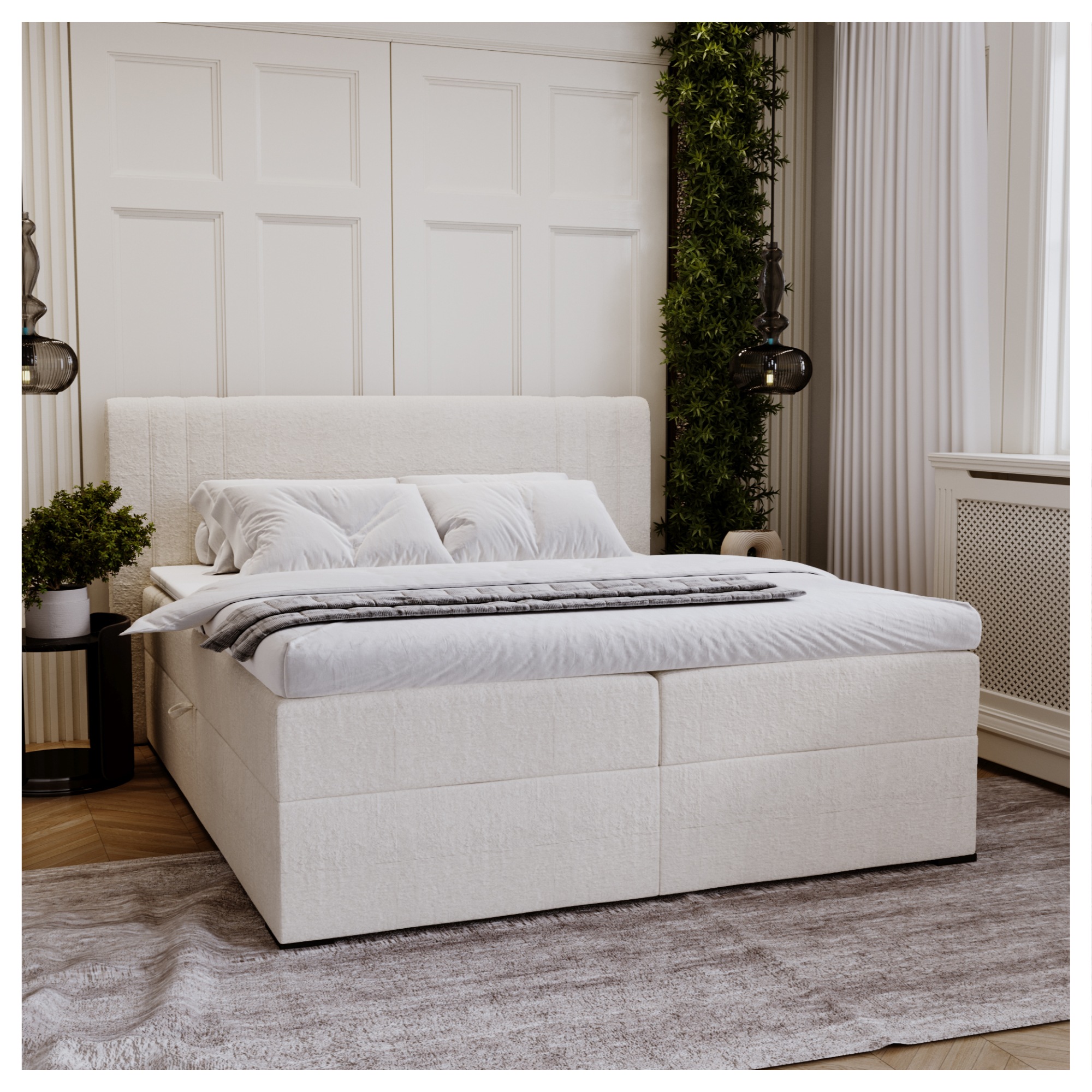 Konštrukcia je vybavená 2 zabudovanými ** matracmi s bonell-pružinovým jadrom **, ktoré sú zospodu doplnené o lamely s nastaviteľnou tuhosťou ** na dosiahnutie čo najväčšieho pohodlia. Posteľ je dodávaná **vrátane ochranného toppera s výškou 5 cm, ktorý okrem iného chráni spodnú vrstvu pred ušpinením a rýchlym preležaním. Večerný odpočinok si môžete spríjemniť opretím vďaka vysokému čelu. Celá konštrukcia je čalúnená štruktúrovanou tkaninou zo 100% polyesteru.