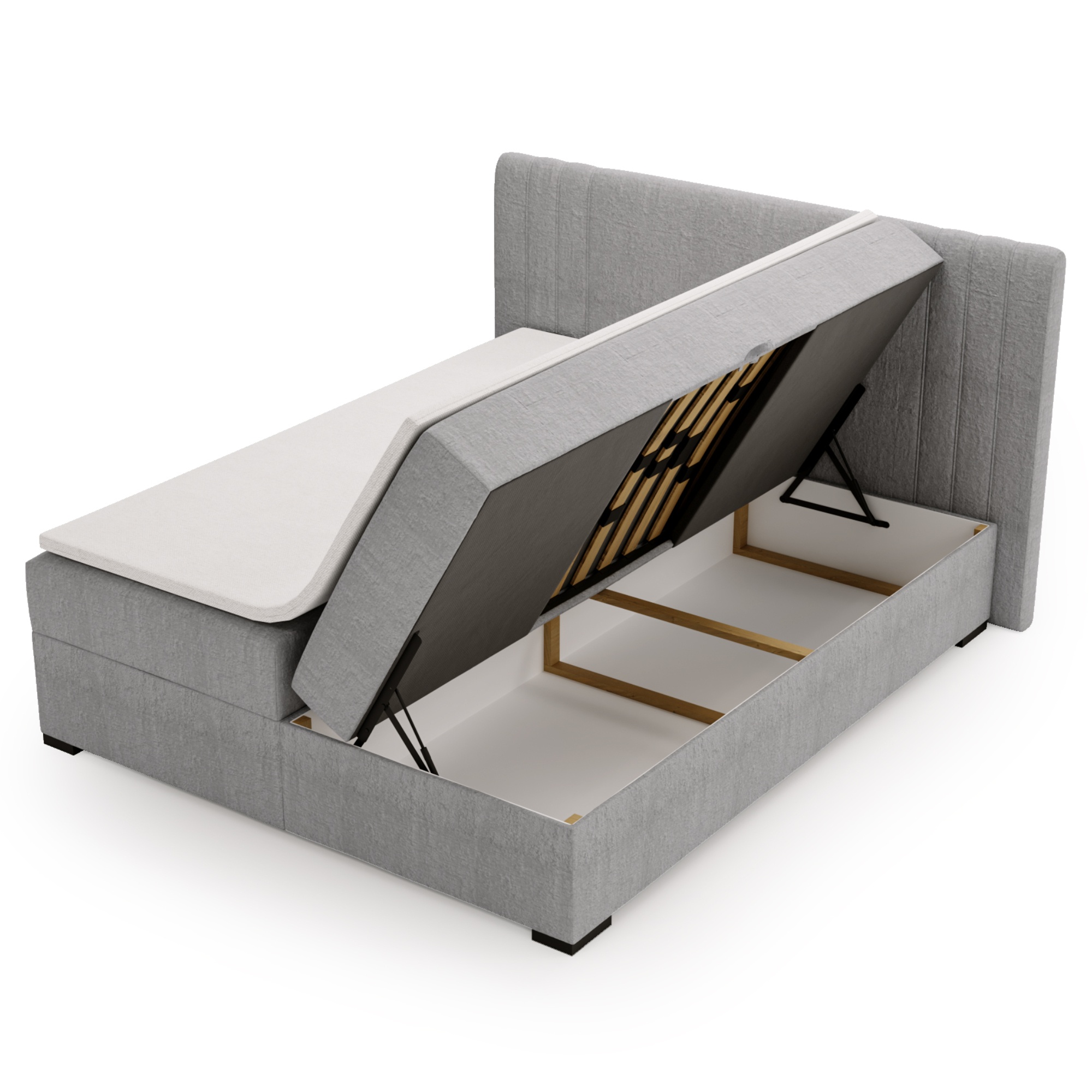 Samozrejmosťou je praktický úložný priestor v ráme postele, ktorý je ľahko prístupný vďaka bočnému výklopu matracov. Celkovú stabilitu postele zaisťujú nízke plastové nôžky.