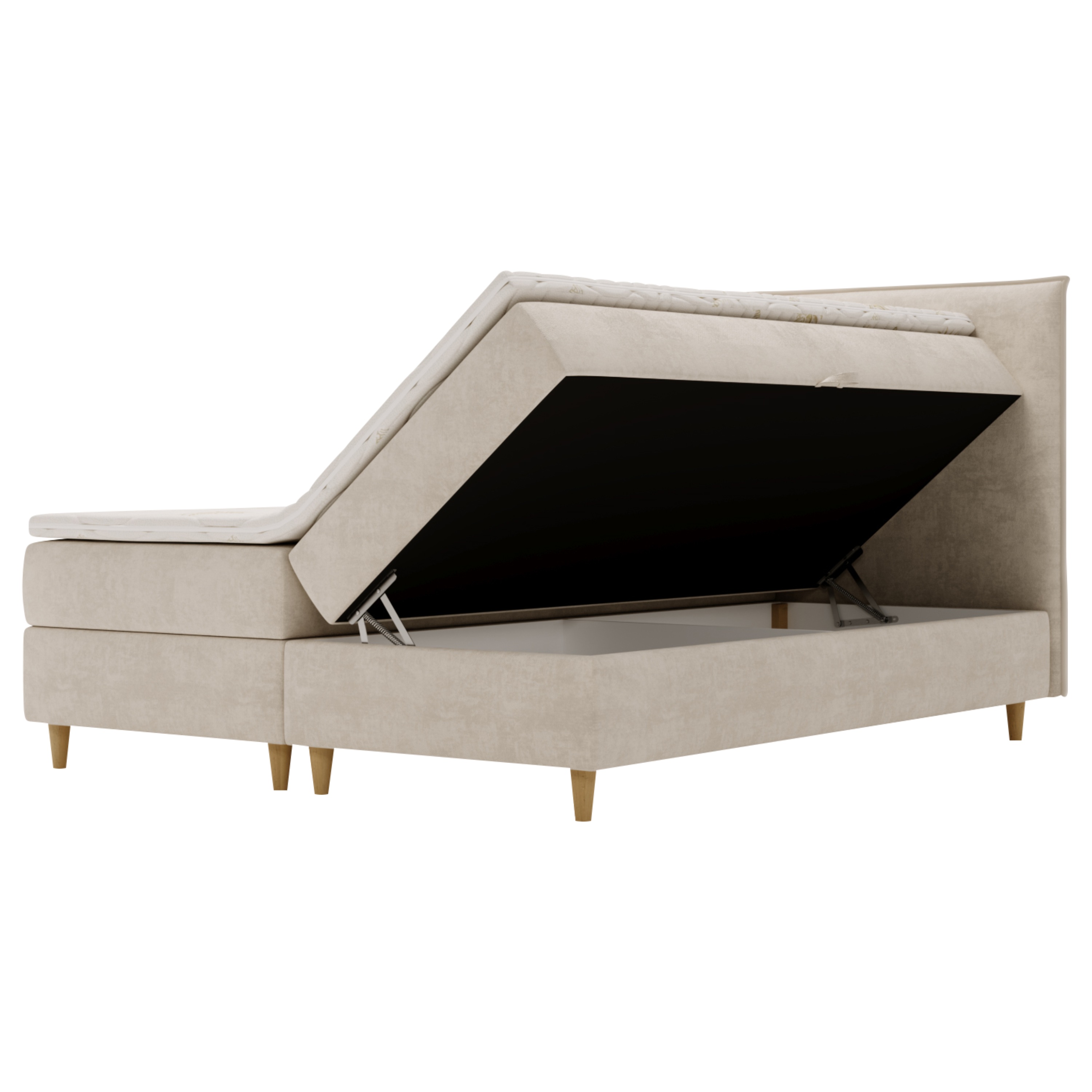 Na uloženie nepoužívaných lôžkovín môžete využiť praktický úložný priestor v ráme postele, do ktorého sa ľahko dostanete vďaka bočnému výklopu matracov. Drevené nohy dodávajú posteli prirodzené kúzlo a zaisťujú stabilitu celej konštrukcie.