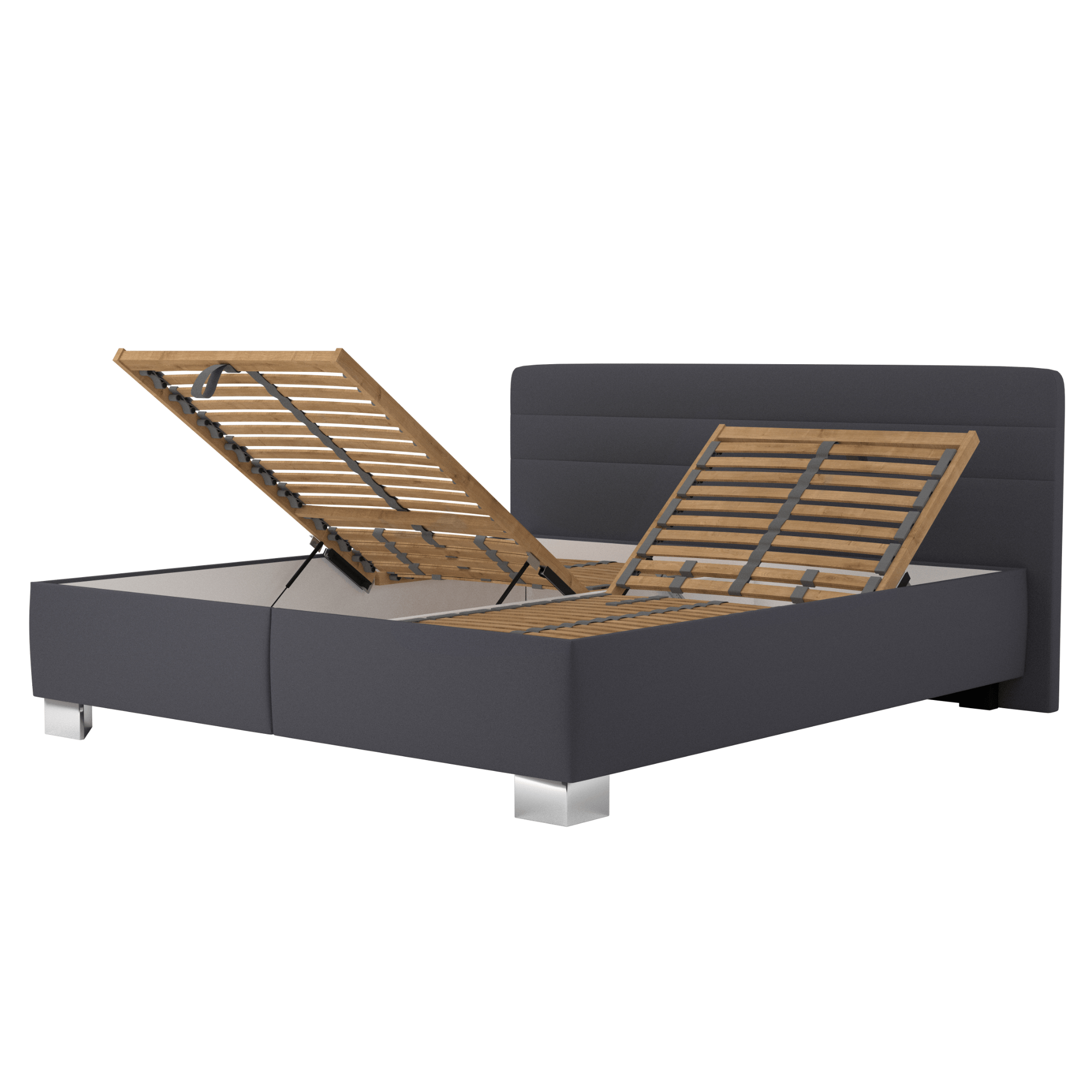 Konštrukcia je potiahnutá hladkou a na dotyk príjemnou tkaninou zo 100% polyesteru. Vyššie čelo s decentným prešívaním je ideálne na komfortné opretie počas večerného odpočinku a zároveň chráni stenu za posteľou. Dodávaná je vrátane polyuretánových matracov s výškou cca 21 cm so snímateľným poťahom, u ktorých si môžete jednoduchým otočením vybrať medzi tuhšou a mäkšou stranou. Súčasťou postele je tiež polohovací lamelový rošt s 28 lamelami umožňujúci nastavenie tuhosti v bedrovej časti a prispôsobenie sa tak vášmu telu. Polohu je možné nastaviť v oblasti hlavy a nôh na čo najpohodlnejšie ležanie. Stredový popruh chráni proti preťaženiu a robí rošt pevnejší a stabilnejší. Rošt ľahko odklopíte pomocou piestov a otvoríte tak úložný priestor ukrytý v ráme postele. Celú konštrukciu dopĺňajú nižšie nohy, ktoré posteli dodávajú potrebnú stabilitu.
