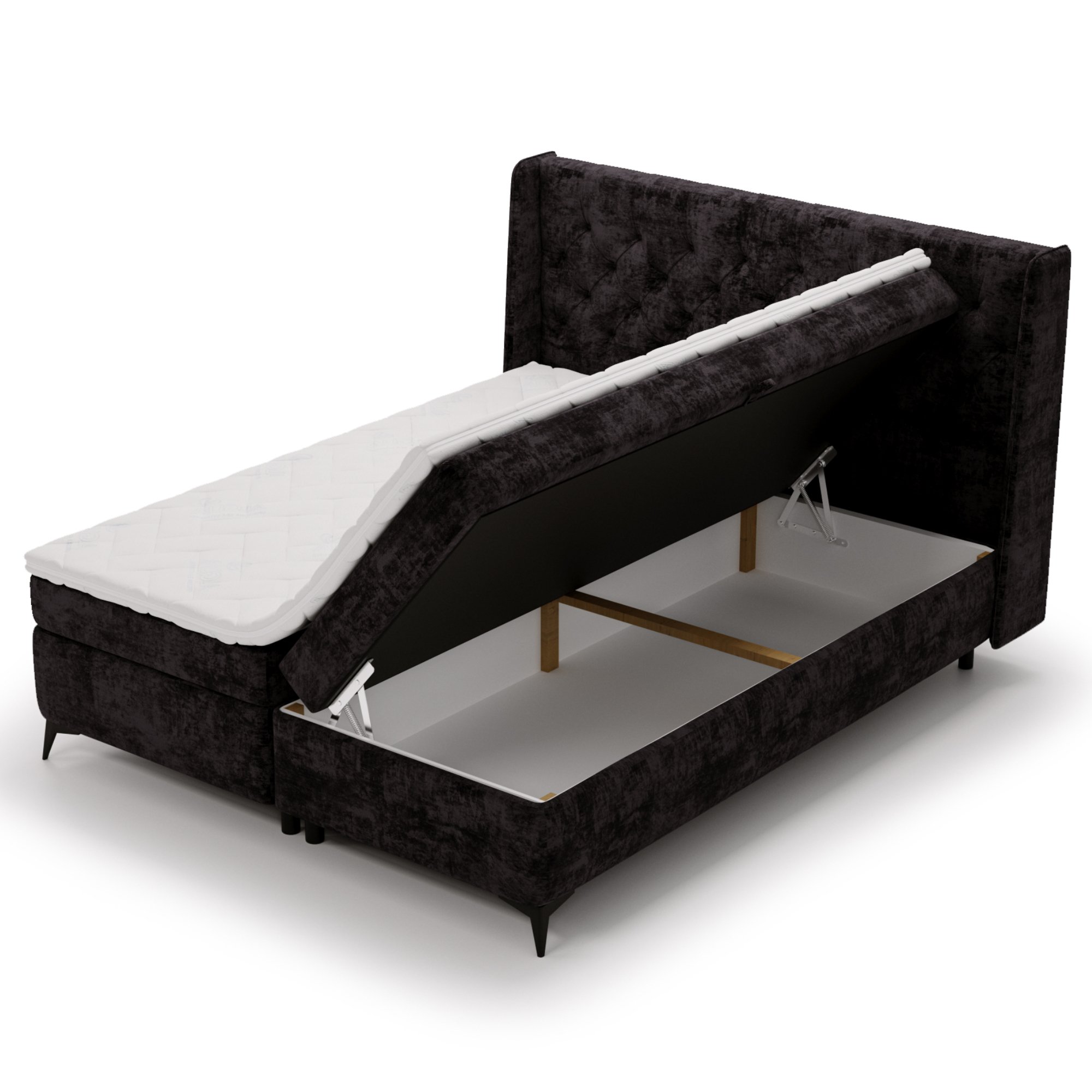 Posteľ obsahuje tiež integrovaný úložný priestor v ráme, ktorý je ľahko prístupný vďaka bočnému výklopu matracov.