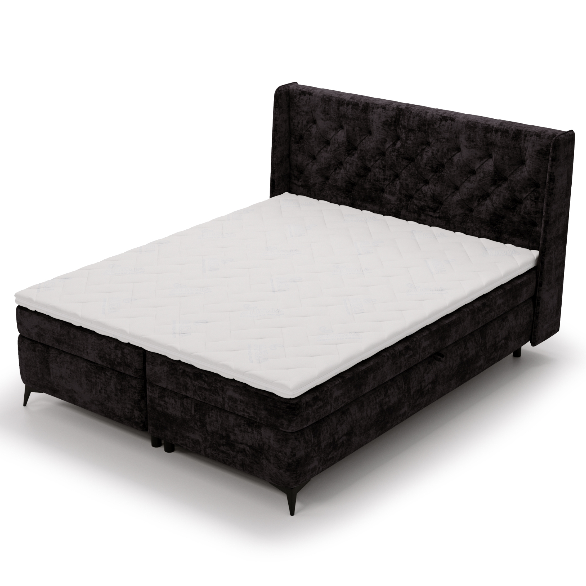 Posteľ obsahuje tiež integrovaný úložný priestor v ráme, ktorý je ľahko prístupný vďaka bočnému výklopu matracov.