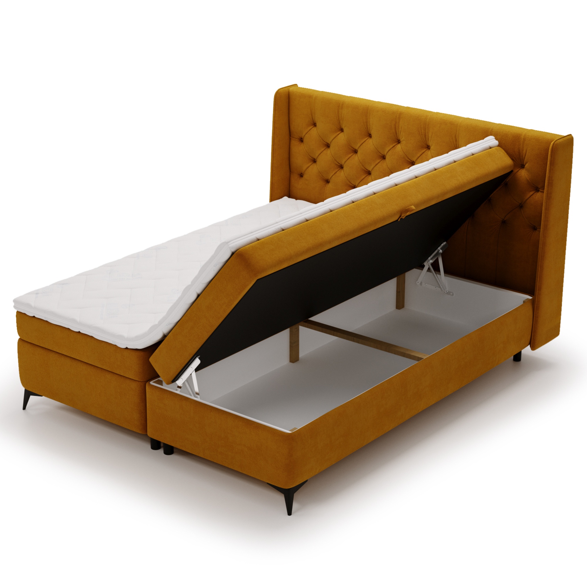 Posteľ obsahuje tiež integrovaný úložný priestor v ráme, ktorý je ľahko prístupný vďaka bočnému výklopu matracov.